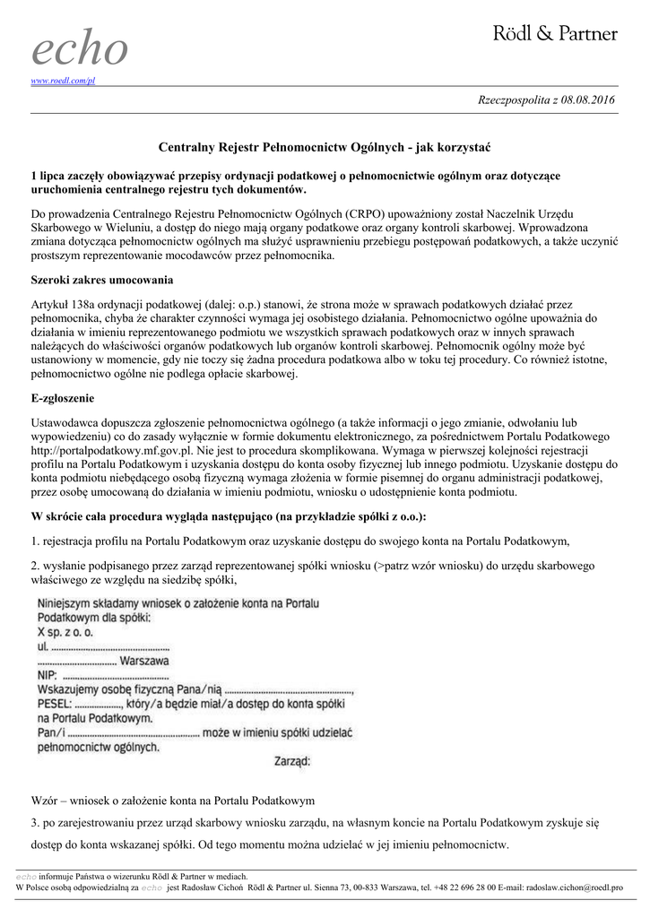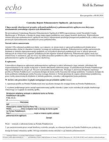 echo www.roedl.com/pl Rzeczpospolita z 08.08.2016 Centralny Rejestr Pełnomocnictw Ogólnych - jak korzystać 1 lipca zaczęły obowiązywać przepisy ordynacji podatkowej o pełnomocnictwie ogólnym oraz dotyczące uruchomienia centralnego rejestru tych dokumentów. Do prowadzenia Centralnego Rejestru Pełnomocnictw Ogólnych (CRPO) upoważniony został Naczelnik Urzędu Skarbowego w Wieluniu, a dostęp do niego mają organy podatkowe oraz organy kontroli skarbowej. Wprowadzona zmiana dotycząca pełnomocnictw ogólnych ma służyć usprawnieniu przebiegu postępowań podatkowych, a także uczynić prostszym reprezentowanie mocodawców przez pełnomocnika. Szeroki zakres umocowania Artykuł 138a ordynacji podatkowej (dalej: o.p.) stanowi, że strona może w sprawach podatkowych działać przez pełnomocnika, chyba że charakter czynności wymaga jej osobistego działania. Pełnomocnictwo ogólne upoważnia do działania w imieniu reprezentowanego podmiotu we wszystkich sprawach podatkowych oraz w innych sprawach należących do właściwości organów podatkowych lub organów kontroli skarbowej. Pełnomocnik ogólny może być ustanowiony w momencie, gdy nie toczy się żadna procedura podatkowa albo w toku tej procedury. Co również istotne, pełnomocnictwo ogólne nie podlega opłacie skarbowej. E-zgłoszenie Ustawodawca dopuszcza zgłoszenie pełnomocnictwa ogólnego (a także informacji o jego zmianie, odwołaniu lub wypowiedzeniu) co do zasady wyłącznie w formie dokumentu elektronicznego, za pośrednictwem Portalu Podatkowego http://portalpodatkowy.mf.gov.pl. Nie jest to procedura skomplikowana. Wymaga w pierwszej kolejności rejestracji profilu na Portalu Podatkowym i uzyskania dostępu do konta osoby fizycznej lub innego podmiotu. Uzyskanie dostępu do konta podmiotu niebędącego osobą fizyczną wymaga złożenia w formie pisemnej do organu administracji podatkowej, przez osobę umocowaną do działania w imieniu podmiotu, wniosku o udostępnienie konta podmiotu. W skrócie cała procedura wygląda następująco (na przykładzie spółki z o.o.): 1. rejestracja profilu na Portalu Podatkowym oraz uzyskanie dostępu do swojego konta na Portalu Podatkowym, 2. wysłanie podpisanego przez zarząd reprezentowanej spółki wniosku (>patrz wzór wniosku) do urzędu skarbowego właściwego ze względu na siedzibę spółki, Wzór – wniosek o założenie konta na Portalu Podatkowym 3. po zarejestrowaniu przez urząd skarbowy wniosku zarządu, na własnym koncie na Portalu Podatkowym zyskuje się dostęp do konta wskazanej spółki. Od tego momentu można udzielać w jej imieniu pełnomocnictw. echo informuje Państwa o wizerunku Rödl & Partner w mediach. W Polsce osobą odpowiedzialną za echo jest Radosław Cichoń Rödl & Partner ul. Sienna 73, 00-833 Warszawa, tel. +48 22 696 28 00 E-mail: [email protected] Krok po kroku Po zalogowaniu do profilu na Portalu Podatkowym użytkownik (mocodawca) ma możliwość złożenia pełnomocnictwa ogólnego (PPO-1), wypełniając krok po kroku formularz elektroniczny, wybierając uprzednio opcję „Chcę dodać pełnomocnictwo ogólne". W momencie przedłożenia zgłoszenia pełnomocnictwa ogólnego w Portalu Podatkowym użytkownik otrzyma powiadomienie wysyłane w wiadomości e-mail na swoją skrzynkę mailową o treści: „Pomyślnie przedłożono zgłoszenie pełnomocnictwa ogólnego PPO-1." Co istotne, przedłożenie zgłoszenia nie jest równoznaczne z dokonaniem wpisu w Centralnym Rejestrze Pełnomocnictw Ogólnych. Ustanowienie pełnomocnictwa ogólnego wywiera natomiast skutek od dnia wpływu pełnomocnictwa do CRPO. Gdy przedłożone pełnomocnictwo ogólne zostanie przetworzone przez Administrację Podatkową, użytkownik otrzyma następującą wiadomość e-mail: „Zgłoszone pełnomocnictwo ogólne zostało przetworzone przez Administrację Podatkową i dokonano wpisu w Centralnym Rejestrze Pełnomocnictw Ogólnych." Analogicznie procedura wygląda w przypadku zmiany, odwołania czy wypowiedzenia pełnomocnictwa (OPO-1). Wyjątek od zasady zgłaszania pełnomocnictwa ogólnego przez mocodawcę uczyniono w stosunku do adwokatów, radców prawnych oraz doradców podatkowych, którzy mogą sami zgłosić udzielone im pełnomocnictwo ogólne. Za pośrednictwem CEIDG Ordynacja podatkowa przewiduje również, że przedsiębiorca indywidualny może zgłosić pełnomocnictwo ogólne (w formie elektronicznej) za pośrednictwem Centralnej Ewidencji i Informacji o Działalności Gospodarczej, skąd zostanie ono przekazane do CRPO (art. 138d § 7 o.p.). W praktyce nie jest to jednak jeszcze możliwe, ponieważ nie zostało przyjęte rozporządzenie wykonawcze. Z projektu rozporządzenia ministra finansów w sprawie szczegółowego sposobu zgłaszania pełnomocnictw ogólnych za pośrednictwem CEIDG oraz ich przekazywania do CRPO wynika, że w celu składania pełnomocnictw ogólnych, na stronie internetowej CEiIDG udostępniony zostanie adres interfejsu portalu podatkowego. Projekt rozporządzenia jest na etapie konsultacji publicznych. Wydruki Organ podatkowy będzie – w razie potrzeby, np. do celów procesowych, przekazania sprawy do wojewódzkiego sądu administracyjnego – sporządzał wydruk pełnomocnictwa ogólnego (zawiadomienia o zmianie zakresu, odwołaniu lub wypowiedzeniu pełnomocnictwa) i dołączał do akt sprawy. Pracownik organu podatkowego, który zrobi wydruk, potwierdzi w formie adnotacji zgodność wydruku z dokumentem elektronicznym. Portal Podatkowy Centralny Rejestr Pełnomocnictw Ogólnych został zaprojektowany jako nowa funkcjonalność Portalu Podatkowego. Po założeniu konta na Portalu Podatkowym podatnik i płatnik uzyskują przez internet dostęp do swoich danych będących się w posiadaniu administracji podatkowej. Chodzi przede wszystkim o dane ewidencyjne i adresowe, złożone deklaracje, prowadzone sprawy czy stan rozliczeń i płatności. Przez swoje konto użytkownik może składać drogą elektron