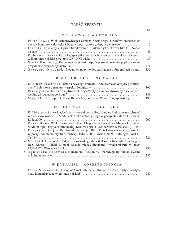 TREŚĆ ZESZYTU Str. I. R O Z P R A W Y I A R T Y K U Ł Y 1. P i o t r S z w e d, Wielkie improwizacje Leśmiana. Scena druga „Dziadów” drezdeńskich a wizja literatury, człowieka i Boga w poezji autora „Napoju cienistego” . . . . . . . . . . . . 2. I z a b e l a T o m c z y k, Opisać filmikowanie. „Eulalia” jako ekfraza filmiku „Napad na stacji” . . . . . . . . . . . . . . . . . . . . . . . . . . . . . . . . . . . . . . . . . . . . . . . . . . . . . . . . . . . . . . 3. D o b r a w a L i s a k - G ę b a l a, Specyfika poetyckich i eseistycznych ekfraz fotografii w literaturze polskiej przełomu XX i XXI wieku . . . . . . . . . . . . . . . . . . . . . . . . . . . . . . . 4. M a r t a K o s z o w y, Obecne nierzeczywiste. Apofatyczna reprezentacja jako agon na przykładzie prozy Magdaleny Tulli . . . . . . . . . . . . . . . . . . . . . . . . . . . . . . . . . . . . . . . . . . 5. G r z e g o r z O l s z a ń s k i, Negatywy pozytywów, czyli rzecz o fotografiach pisarzy 5 45 83 111 135 II. M A T E R I A Ł Y I N O T A T K I 1. D a r i u s z P a c h o c k i, Historia pewnego dramatu. „Zdziczenie obyczajów pośmiert nych” Bolesława Leśmiana – aspekt filologiczny . . . . . . . . . . . . . . . . . . . . . . . . . . . . . . . 2. P r z e m y s ł a w K a n i e c k i, Konwicki czyta Wojtyłę. O niezrealizowanym scenariuszu według „Brata naszego Boga” . . . . . . . . . . . . . . . . . . . . . . . . . . . . . . . . . . . . . . . . . . . . . 3. M a g d a l e n a P o p i e l, Maria Renata Mayenowa o „Weselu” Wyspiańskiego . . . . . . 165 189 199 III. R E C E N Z J E I P R Z E G L Ą D Y 1. E l ż b i e t a W i n i e c k a, Leśmian – poeta dwoisty. Rec.: Barbara Stelmaszczyk, „Istnieć w dwoistym świecie...” Model człowieka i obrazy Boga w poezji Bolesława Leśmiana. Łódź 2009 . . . . . . . . . . . . . . . . . . . . . . . . . . . . . . . . . . . . . . . . . . . . . . . . . . . . . . . . . . . . 2. P a w e ł R a m s, Wiek z Leśmianem. Rec.: Małgorzata Gorczyńska, Miejsca Leśmiana. Studium topiki krytycznoliterackiej. Kraków (2011). „Modernizm w Polsce”. [T.] 35 . 3. K r z y s z t o f G a j d a, Ile piosenki w poezji... Rec.: Piotr Łuszczykiewicz, Piosenka w poezji pokolenia ery transformacji 1984–2009. Poznań 2009. „Filologia Polska”. Nr 114 . . . . . . . . . . . . . . . . . . . . . . . . . . . . . . . . . . . . . . . . . . . . . . . . . . . . . . . . . . . . . . . . 4. M i c h a ł G ł o w i ń s k i, Od października do grudnia. (O książce Konrada Rokickiego). Rec.: Konrad Rokicki, Literaci. Relacje między literatami a władzami PRL w latach 1956–1970. Warszawa 2011 . . . . . . . . . . . . . . . . . . . . . . . . . . . . . . . . . . . . . . . . . . . . . . . 5. A g n i e s z k a K i j e w s k a, Humanizm. Idee, nurty i paradygmaty humanistyczne w kulturze polskiej . . . . . . . . . . . . . . . . . . . . . . . . . . . . . . . . . . . . . . . . . . . . . . . . . . . . . . 207 219 226 232 237 IV. D Y S K U S J E – K O R E S P O N D E N C J A 1. J e r z y S t a r n a w s k i, Uwagi na temat publikacji „Humanizm. Idee, nurty i paradyg maty humanistyczne w kulturze polskiej” . . . . . . . . . . . . . . . . . . . . . . . . . . . . . . . . . . . . 247 4 CONTENTS OF THE FASCICLE Page I. T R E A T I S E S A N D A R T I C L E S 1. P i o t r S z w e d, Leśmian’s Great Improvisations. Scene II from the Dresden “Forefa thers’ Eve” and Vision of Literature, Man and God in the Poetry of the Author of “Na pój cienisty” (“Shadowy Drink”) . . . . . . . . . . . . . . . . . . . . . . . . . . . . . . . . . . . . . . . . . . . 2. I z a b e l a T o m c z y k, Describing Amateur Short Film Making. “Eulalia” as an Ekphrasis of the Short Movie “Napad na stacji” (“Assault at the Station”) . . . . . . . . . . . 3. D o b r a w a L i s a k - G ę b a l a, Peculiarity of Poetic and Essayistic Photography Ekphrasis in Polish Literature at the Turn of 20th and 21st Century . . . . . . . . . . . . . . . . . . 4. M a r t a K o s z o w y, Presently Unreal. Apophatic Representation as Agon as Exempli fied by Magdalena Tulli’s Prose . . . . . . . . . . . . . . . . . . . . . . . . . . . . . . . . . . . . . . . . . . . . 5. G r z e g o r z O l s z a ń s k i, Negatives of Positives or on the Writers’ Photographs . . . 5 45 83 111 135 II. M A T E R I A L S A N D N O T E S 1. D a r i u s z P a c h o c k i, A History of a Drama. Bolesław Leśmian’s “Barbarousness of Posthumous Customs” – a Philological Aspect . . . . . . . . . . . . . . . . . . . . . . . . . . . . . . . . 2. P r z e m y s ł a w K a n i e c k i, Konwicki Reading Wojtyła. On an Unfulfilled Screenplay Based on “Brat naszego Boga” (“Our God’s Brother”) . . . . . . . . . . . . . . . . . . . . . . . . . . 3. M a g d a l e n a P o p i e l, Maria Renata Mayenowa on Stanisław Wyspiański’s “Wesele” (“The Wedding”) . . . . . . . . . . . . . . . . . . . . . . . . . . . . . . . . . . . . . . . . . . . . . . . . . . . . . . . . III. REVIEWS AND SURVEYS. – IV. DISCUSSION – CORRESPONDENCE 165 189 199