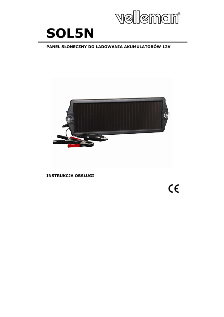 SOL5N PANEL SŁONECZNY DO ŁADOWANIA AKUMULATORÓW 12V INSTRUKCJA OBSŁUGI PANEL SŁONECZNY DO ŁADOWANIA AKUMULATORÓW 12V 1. Wstęp Przeznaczona dla mieszkańców Unii Europejskiej. Ważne informacje dotyczące środowiska. Ten symbol umieszczony na urządzeniu bądź opakowaniu wskazuje, że wyrzucenie produktu może być szkodliwe dla środowiska. Nie wyrzucaj urządzenia lub baterii do zbiorczego śmietnika, tylko do specjalnie przeznaczonych do tego pojemników na urządzenia elektroniczne lub skontaktuj się z firmą zajmującą się recyklingiem. Urządzenie możesz oddać dystrybutorowi lub firmie zajmującej się recyklingiem. Postępuj zgodnie z zasadami bezpieczeństwa dotyczącymi środowiska. Jeśli masz wątpliwości skontaktuj się z firmą zajmującą się utylizacją odpadów. Dziękujemy za wybór produktu firmy Velleman! Panel SOL5N służy do podładowania akumulatorów 12V (np. akumulatorów samochodowych). Zupełne rozładowanie akumulatora 12V grozi jego zasiarczeniem, a w konsekwencji trwałą i nieodwracalną utratą pojemności. Prosimy o dokładne zapoznanie się z instrukcją obsługi przed użyciem. Jeśli urządzenie zostało uszkodzone podczas transportu prosimy o niekorzystanie z niego i skontaktowanie się ze sprzedawcą. 2. Zawartość zestawu 1. 2. 3. 4. 5. 6. dziura do montowania zacisków podciśnieniowych zaciski podciśnieniowe kabel łączeniowy zaciski do akumulatora (krokodylki) wskaźnik ładowania LED wtyczka do gniazda zapalniczki samochodowej Uwaga: w niektórych samochodach, gniazdo zapalniczki samochodowej może być odłączone od akumulatora, gdy zapłon jest wyłączony. W takim przypadku, podłącz SOL5N bezpośrednio do akumulatora samochodowego zaciskając krokodylki na zaciskach akumulatora. Podłączaj czarny kabel do minusa (-) a czerwony do plusa (+). SOL5N -2- VELLEMAN® 3. Opis działania • • • • • • • • Podłącz zaciski podciśnieniowe do panelu, a następnie zamocuj panel do przedniej szyby samochodu (po stronie wewnętrznej lub zewnętrznej). Alternatywnie, możesz zamocować ładowarkę używając dziur montażowych z tyłu ładowarki. Podłącz kabel do gniazda zapalniczki, lub bezpośrednio do terminali akumulatora. Od tego momentu (o ile świeci słońce), ładowarka będzie produkowała niewielki prąd doładowujący Twój akumulator. Czerwona dioda LED (oznaczony cyfrą 5 na rysunku powyżej) zacznie migać, gdy panel rozpocznie doładowywanie akumulatora. Ładowarka nie przeładuje, ani nie uszkodzi akumulatora. Ponadto, wbudowana dioda prostownicza zapewnia, że ładowarka nie rozładuje akumulatora. Pamiętaj, że SOL5N został zaprojektowany do podładowywania akumulatora przeciwdziałając naturalnym procesom samorozładowania. Ładowarka ta nie jest w stanie w pełni naładować rozładowanego akumulatora samochodowego. Odłącz ładowarkę przed uruchomieniem silnika. Przepięcia elektryczne powodowane pracą silnika mogą uszkodzić ładowarkę. Niektóre samochody mają przyciemniane szyby, które znacząco zmniejszają efektywność panelu słonecznego, jeżeli umieszczony jest za taką szybą. Dla lepszych efektów pracy, umieść SOL5N na zewnątrz samochodu. 4. Specyfikacja techniczna Moc Napięcie wyjściowe Napięcie nominalne Prąd wyjściowy Wymiary Waga maksymalnie 1,5W 12V (± 20%) 17,5V maksymalnie 125mA 340 x 120 x 14mm 0,45 kg To urządzenie zostało przetestowane przy standardowych warunkach pogodowych: AM1,5, 100mW/cm², temperatura 25°C Przeczytaj informacje dotyczące Serwisu Velleman® i Gwarancji Jakości na ostatniej stronie niniejszej instrukcji. Używaj tylko oryginalnych akcesoriów. Velleman Components N.V. nie ponosi odpowiedzialności za uszkodzenie urządzenia lub zranienie spowodowane złym korzystaniem z urządzenia. Właścicielem niniejszej instrukcji jest firma Velleman Components N.V. Wszelkie prawa autorskie zastrzeżone. Jeśli chcesz uzyskać więcej informacji o tym produkcie lub o marce Velleman, wejdź na stronę: www.velleman.eu. Informacje zawarte w niniejszej instrukcji obsługi mogą ulec zmianie bez wcześniejszego powiadomienia. Aktualna wersja instrukcji znajduje się na www.velleman.eu. SOL5N -3- VELLEMAN®