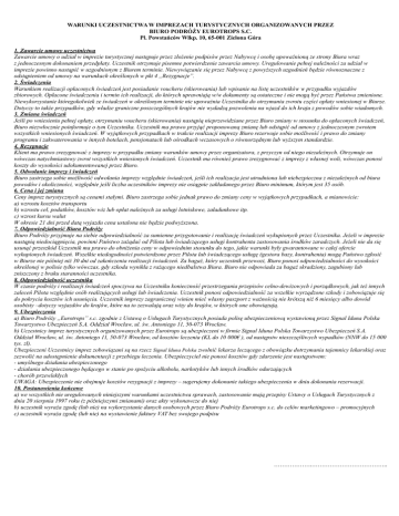 WARUNKI UCZESTNICTWA W IMPREZACH TURYSTYCZNYCH ORGANIZOWANYCH PRZEZ BIURO PODRÓŻY EUROTROPS S.C. Pl. Powstańców Wlkp. 10, 65-001 Zielona Góra 1. Zawarcie umowy uczestnictwa Zawarcie umowy o udział w imprezie turystycznej następuje przez złożenie podpisów przez Nabywcę i osobę upoważnioną ze strony Biura wraz z jednoczesnym dokonaniem przedpłaty. Uczestnik otrzymuje pisemne potwierdzenie zawarcia umowy. Uregulowanie pełnej należności za udział w imprezie powinno nastąpić w uzgodnionym z Biurem terminie. Niewywiązanie się przez Nabywcę z powyższych uzgodnień będzie równoznaczne z odstąpieniem od umowy na warunkach określonych w pkt 4 „Rezygnacje”. 2. Świadczenia Warunkiem realizacji opłaconych świadczeń jest posiadanie voucheru (skierowania) lub wpisanie na listę uczestników w przypadku wyjazdów zbiorowych. Opłacone świadczenia i termin ich realizacji, do których uprawniają w/w dokumenty są ostateczne i nie mogą być przez Państwa zmienione. Niewykorzystanie któregokolwiek ze świadczeń w określonym terminie nie upoważnia Uczestnika do otrzymania zwrotu części opłaty wniesionej w Biurze. Dotyczy to także przypadków, gdy władze graniczne poszczególnych krajów nie wydadzą pozwolenia na wjazd do ich kraju z powodów sobie wiadomych. 3. Zmiana świadczeń Jeśli po wniesieniu pełnej opłaty, otrzymaniu voucheru (skierowania) nastąpią nieprzewidziane przez Biuro zmiany w stosunku do opłaconych świadczeń, Biuro niezwłocznie poinformuje o tym Uczestnika. Uczestnik ma prawo przyjąć proponowaną zmianę lub odstąpić od umowy z jednoczesnym zwrotem wszystkich wniesionych świadczeń. W wyjątkowych przypadkach w trakcie realizacji imprezy Biuro rezerwuje sobie możliwość i prawo do zmiany programu i zakwaterowania w innych hotelach, pensjonatach lub ośrodkach wczasowych o równorzędnym lub wyższym standardzie. 4. Rezygnacje Klient ma prawo zrezygnować z imprezy w przypadku zmiany warunków umowy przez organizatora, z przyczyn od niego niezależnych. Otrzymuje on wówczas natychmiastowy zwrot wszystkich wniesionych świadczeń. Uczestnik ma również prawo zrezygnować z imprezy z własnej woli, wówczas ponosi koszty do wysokości udokumentowanej przez Biuro. 5. Odwołanie imprezy i świadczeń Biuro zastrzega sobie możliwość odwołania imprezy względnie świadczeń, jeśli ich realizacja jest utrudniona lub niebezpieczna z niezależnych od biura powodów i okoliczności, względnie jeśli liczba uczestników imprezy nie osiągnie zakładanego przez Biuro minimum, którym jest 35 osób. 6. Cena i jej zmiana Ceny imprez turystycznych są cenami stałymi. Biuro zastrzega sobie jednak prawo do zmiany ceny w wyjątkowych przypadkach, a mianowicie: a) wzrostu kosztów transportu b) wzrostu ceł, podatków, kosztów wiz lub opłat należnych za usługi lotniskowe, załadunkowe itp. c) wzrost kursu walut W okresie 21 dni przed datą wyjazdu cena ustalona nie będzie podwyższona. 7. Odpowiedzialność Biura Podróży Biuro Podróży przyjmuje na siebie odpowiedzialność za sumienne przygotowanie i realizację świadczeń wykupionych przez Uczestnika. Jeżeli w imprezie nastąpią niedociągnięcia, powinni Państwo zażądać od Pilota lub świadczącego usługi kontrahenta zastosowania środków zaradczych. Jeżeli nie da się usunąć przeszkód Uczestnik ma prawo do obniżenia ceny w odpowiednim stosunku do tego, jakie warunki były gwarantowane w całej ofercie wykupionych świadczeń. Wszelkie niedogodności potwierdzone przez Pilota lub świadczącego usługę (gestora bazy, kontrahenta) mogą Państwo zgłosić w Biurze nie później niż 30 dni od zakończenia realizacji świadczeń. Za bagaż, który uczestnik przewozi, Biuro ponosi odpowiedzialności do wysokości określonej w polisie tylko wówczas, gdy szkoda wynikła z rażącego niedbalstwa Biura. Biuro nie odpowiada za bagaż skradziony, zagubiony lub zniszczony z braku staranności uczestnika. 8. Odpowiedzialność uczestnika W czasie podróży i realizacji świadczeń spoczywa na Uczestniku konieczność przestrzegania przepisów celno-dewizowych i porządkowych, jak też innych zaleceń Pilota względnie osób realizujących usługi lub świadczenia. Uczestnik ponosi odpowiedzialność za wszelkie wyrządzone szkody i zobowiązuje się do pokrycia kosztów ich usunięcia. Uczestnik imprezy zagranicznej winien mieć własny paszport z ważnością nie krótszą niż 6 miesięcy albo dowód osobisty –dotyczy wyjazdów do krajów, które na to zezwalają oraz wizy do krajów, w których one obowiązują. 9. Ubezpieczenia a) Biuro Podróży „Eurotrops” s.c. zgodnie z Ustawą o Usługach Turystycznych posiada polisę ubezpieczeniową wystawioną przez Signal Iduna Polska Towarzystwo Ubezpieczeń S.A. Oddział Wrocław, ul. św. Antoniego 11, 50-073 Wrocław. b) Uczestnicy imprez turystycznych organizowanych przez Eurotrops są ubezpieczeni w firmie Signal Iduna Polska Towarzystwo Ubezpieczeń S.A. Oddział Wrocław, ul. św. Antoniego 11, 50-073 Wrocław, od kosztów leczenia (KL do 10 000€ ), od następstw nieszczęśliwych wypadków (NNW do 15 000 tys. zł). Ubezpieczeni Uczestnicy imprez zobowiązani są na rzecz Signal Iduna Polska zwolnić lekarza leczącego z obowiązku dotrzymania tajemnicy lekarskiej oraz zezwolić na udostępnienie dokumentacji z przebiegu leczenia. Ubezpieczyciel nie ponosi kosztów gdy zdarzenie jest następstwem: - umyślnego działania ubezpieczonego - działania ubezpieczonego będącego w stanie po spożyciu alkoholu, narkotyków lub innych środków odurzających - chorób przewlekłych UWAGA: Ubezpieczenie nie obejmuje kosztów rezygnacji z imprezy – sugerujemy dokonanie takiego ubezpieczenia w dniu dokonania rezerwacji. 10. Postanowienia końcowe a) we wszystkich nie uregulowanych niniejszymi warunkami uczestnictwa sprawach, zastosowanie mają przepisy Ustawy o Usługach Turystycznych z dnia 20 sierpnia 1997 roku (z 