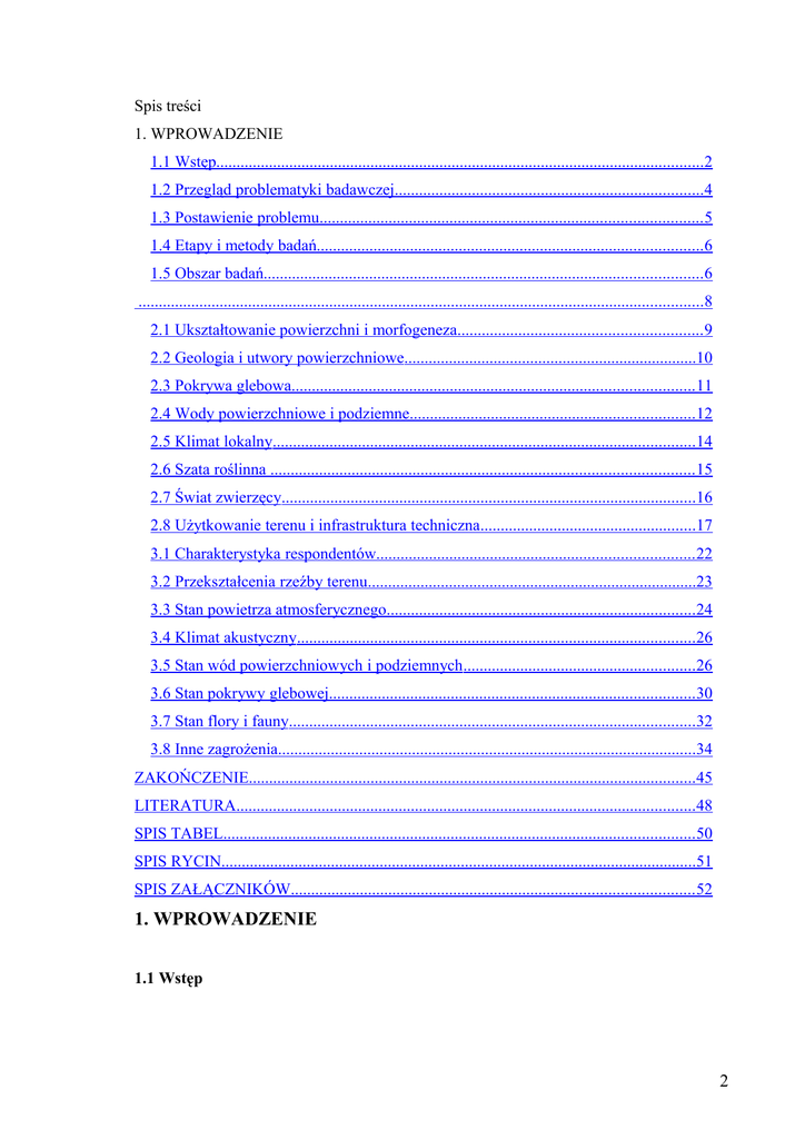 Spis treści 1. WPROWADZENIE 1.1 Wstęp........................................................................................................................2 1.2 Przegląd problematyki badawczej............................................................................4 1.3 Postawienie problemu.............................................................................................. 5 1.4 Etapy i metody badań............................................................................................... 6 1.5 Obszar badań............................................................................................................ 6 ...........................................................................................................................................8 2.1 Ukształtowanie powierzchni i morfogeneza............................................................ 9 2.2 Geologia i utwory powierzchniowe........................................................................10 2.3 Pokrywa glebowa................................................................................................... 11 2.4 Wody powierzchniowe i podziemne...................................................................... 12 2.5 Klimat lokalny........................................................................................................14 2.6 Szata roślinna ........................................................................................................ 15 2.7 Świat zwierzęcy......................................................................................................16 2.8 Użytkowanie terenu i infrastruktura techniczna.....................................................17 3.1 Charakterystyka respondentów.............................................................................. 22 3.2 Przekształcenia rzeźby terenu.................................................................................23 3.3 Stan powietrza atmosferycznego............................................................................24 3.4 Klimat akustyczny..................................................................................................26 3.5 Stan wód powierzchniowych i podziemnych.........................................................26 3.6 Stan pokrywy glebowej..........................................................................................30 3.7 Stan flory i fauny....................................................................................................32 3.8 Inne zagrożenia.......................................................................................................34 ZAKOŃCZENIE..............................................................................................................45 LITERATURA.................................................................................................................48 SPIS TABEL.................................................................................................................... 50 SPIS RYCIN.....................................................................................................................51 SPIS ZAŁĄCZNIKÓW................................................................................................... 52 1. WPROWADZENIE 1.1 Wstęp 2 Jednym z aktualnych problemów badanych jest pogarszający się stan środowiska przyrodniczego. Niektóre problemy związane z jego ochroną mogą by rozwiązywane poprzez środki finansowe, organizacyjne, techniczne jak i prawne. Początkowo takie działania dawały korzystne rezultaty jednak okazało się, że środki te są w stanie jedynie ograniczyć lub złagodzić szkodliwe oddziaływanie na środowisko, natomiast nie potrafią wyeliminować źródła jej przyczyn jaką jest postawa ludzka względem środowiska. Dlatego problem tkwi w samym człowieku, a dokładniej jak to pisał U. Thant w raporcie „Człowiek i jego środowisko” z 26 V 1969 roku: Po raz pierwszy w historii ludzkości, pojawił się i narasta kryzys o zasięgu światowym, obejmujący zarówno kraje rozwinięte, jak i rozwijające się – kryzys dotyczy stosunku człowieka do środowiska (Frątczak 1995). Kryzys ten może dotyczyć każdego z nas, a jego skutki mogą być nieodwracalne. Stosunek człowieka do środowiska przyrodniczego uobecnia się w świadomości ekologicznej, która kształtuje prawidłowe odnoszenie się do świata przyrody. Świadomość ta może być definiowana w sposób opisowy jak i aksjologiczno – normatywny (Hull 2001, s. 121). W ujęciu opisowym jest to zespół informacji i przekonań na temat środowiska naturalnego oraz postrzegania związków między stanem i charakterem środowiska naturalnego a warunkami i jakością życia człowieka (Burger 1986, s. 376). Natomiast świadomość ekologiczna w kategoriach aksjologiczno – normatywnych to pojmowanie, przeżywanie i wartościowanie procesów zachodzących w biosferze oraz całokształtu powiązań i współzależności między człowiekiem (społeczeństwem) i przyrodą (Hull 2001, s. 121). Reasumując świadomość ekologiczna to świadome myślenie człowieka względem środowiska przyrodniczego obejmujące wiedzę ekologiczną, wrażliwość na otaczającą przyrodę oraz podejmowanie pewnych działania proekologiczne służących jego ochronie. Człowiek świadomie lub nieświadomie wywiera wpływ na otaczający go świat. Aby działać świadomie nie zagrażając środowisku przyrodniczemu należy posiadać pewną wiedzę ekologiczną czyli wiedzę o stanie środowiska przyrodniczego, jego zagrożeniach i sposobach przeciwdziałania im oraz negatywnych skutków oddziaływania środowiska na człowieka. Należy także posiadać system wartości i norm moralnych względem środowiska oraz poczucie moralnej odpowiedzialności za istnienie i zachowanie biosfery (Hull 2001, s. 121). 3 1.2 Przegląd problematyki badawczej Wielu autorów w swoich badania porusza