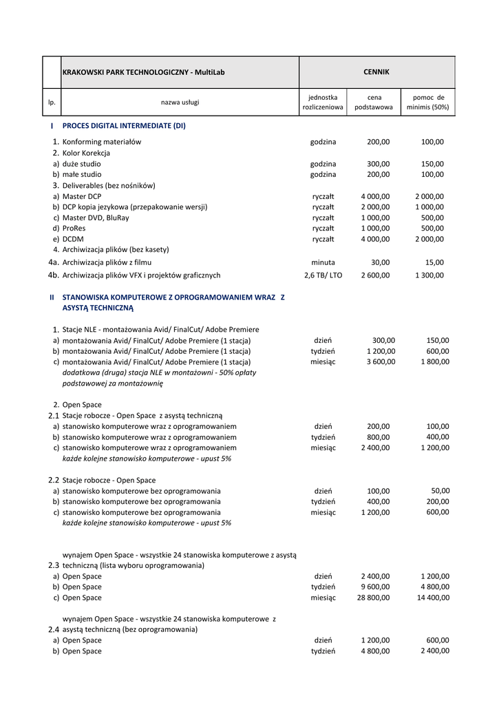 CENNIK KRAKOWSKI PARK TECHNOLOGICZNY - MultiLab lp. I nazwa usługi jednostka rozliczeniowa cena podstawowa pomoc de minimis (50%) PROCES DIGITAL INTERMEDIATE (DI) 1. Konforming materiałów 2. Kolor Korekcja godzina 200,00 100,00 a) duże studio b) małe studio 3. Deliverables (bez nośników) a) Master DCP b) DCP kopia jezykowa (przepakowanie wersji) c) Master DVD, BluRay d) ProRes e) DCDM 4. Archiwizacja plików (bez kasety) godzina godzina 300,00 200,00 150,00 100,00 ryczałt ryczałt ryczałt ryczałt ryczałt 4 000,00 2 000,00 1 000,00 1 000,00 4 000,00 2 000,00 1 000,00 500,00 500,00 2 000,00 4a. Archiwizacja plików z filmu 4b. Archiwizacja plików VFX i projektów graficznych II minuta 2,6 TB/ LTO 30,00 15,00 2 600,00 1 300,00 STANOWISKA KOMPUTEROWE Z OPROGRAMOWANIEM WRAZ Z ASYSTĄ TECHNICZNĄ 1. Stacje NLE - montażowania Avid/ FinalCut/ Adobe Premiere a) montażowania Avid/ FinalCut/ Adobe Premiere (1 stacja) b) montażowania Avid/ FinalCut/ Adobe Premiere (1 stacja) c) montażowania Avid/ FinalCut/ Adobe Premiere (1 stacja) dodatkowa (druga) stacja NLE w montażowni - 50% opłaty podstawowej za montażownię dzień tydzień miesiąc 300,00 1 200,00 3 600,00 150,00 600,00 1 800,00 2. Open Space 2.1 Stacje robocze - Open Space z asystą techniczną a) stanowisko komputerowe wraz z oprogramowaniem b) stanowisko komputerowe wraz z oprogramowaniem c) stanowisko komputerowe wraz z oprogramowaniem każde kolejne stanowisko komputerowe - upust 5% dzień tydzień miesiąc 200,00 800,00 2 400,00 100,00 400,00 1 200,00 dzień tydzień miesiąc 100,00 400,00 1 200,00 50,00 200,00 600,00 dzień tydzień miesiąc 2 400,00 9 600,00 28 800,00 1 200,00 4 800,00 14 400,00 dzień tydzień 1 200,00 4 800,00 600,00 2 400,00 2.2 Stacje robocze - Open Space a) stanowisko komputerowe bez oprogramowania b) stanowisko komputerowe bez oprogramowania c) stanowisko komputerowe bez oprogramowania każde kolejne stanowisko komputerowe - upust 5% wynajem Open Space - wszystkie 24 stanowiska komputerowe z asystą 2.3 techniczną (lista wyboru oprogramowania) a) Open Space b) Open Space c) Open Space wynajem Open Space - wszystkie 24 stanowiska komputerowe z 2.4 asystą techniczną (bez oprogramowania) a) Open Space b) Open Space 14 400,00 7 200,00 GHzh 0,20 0,10 sztuka dzień 500,00 3 000,00 250,00 1 500,00 dzień tydzień miesiąc 4 000,00 20 000,00 60 000,00 2 000,00 10 000,00 30 000,00 dzień 3 000,00 1 500,00 2. Kamera Red Dragon 6K z podstawowym osprzętem dzień 2 500,00 1 250,00 3. Obiektywy zestaw 5szt. profesjonalnych obiektywów filmowych Compact Prime firmy Carl Zaiss (Planar 100/T2.1; Planar 85/T2.1;Planar 50/T2.1;Planar 35/T2.1;Planar 18/T2.1) dzień 600,00 300,00 dzień dzień dzień dzień 800,00 200,00 300,00 600,00 400,00 100,00 150,00 300,00 750,00 2 250,00 375,00 1 125,00 c) Open Space miesiąc III RENDER FARMA 1. podstawowa jednostka rozliczeniowa gigaherzo godzina IV SKANER 3D 1. skanowanie pojedynczego obiektu 2. skanowanie długoterminowe V MOTION CAPTURE 1. sesja motion capture 2. sesja motion capture 3. sesja motion capture VI WYNAJEM SPRZĘTU FILMOWEGO (RENTAL) 1. Zestaw zdjęciowy: Kamera Red Dragon 6K z podstawowym osprzętem zestaw bezprzewodowego sterowania obiektywu RED 3-Axis Zestaw bezprzewodowego przesyłu sygnału HD-SDI/podgląd/ firmy Teradeck Bolt 600 (1 nadajnik,3 odbiorniki) monitor podglądowy JVC DTV24G1 Obiektywy zestaw 5szt. profesjonalnych obiektywów filmowych Compact Prime firmy Carl Zaiss (Planar 100/T2.1; Planar 85/T2.1;Planar 50/T2.1;Planar 35/T2.1;Planar 18/T2.1) 4. a) b) c) d) Grip DitoGear System jazdy kamerowej firmy IDS /Indie Dolly System/ Kran kamerowy ROAD JIB PRO Zestaw FREEFLY MOVI M10 VII WYNAJEM POMIESZCZEŃ W MULTILAB 1. pokój producenta (bez sprzętu komputerowego) 1a) pokój producenta 1b) pokój producenta tydzień miesiąc 2. 2a) 2b) 2c) sala konferencyjna/ biuro produkcyjne do 10 stanowisk pracy sala konferencyjna/ biuro produkcyjne do 10 stanowisk pracy sala konferencyjna/ biuro produkcyjne do 10 stanowisk pracy sala konferencyjna/ biuro produkcyjne do 10 stanowisk pracy 3. Studio fotograficzne z wyposażeniem dzień tydzień miesiąc 300,00 1 500,00 4 500,00 150,00 750,00 2 250,00 3a. Studio fotograficzne 3b. Studio fotograficzne 3c. Studio fotograficzne dzień tydzień miesiąc 600,00 3 000,00 9 000,00 300,00 1 500,00 4 500,00 4. godzina 250,00 125,00 Cinema Room - sala kinowa /do kolaudacji/ *wszystkie ceny są cenami netto