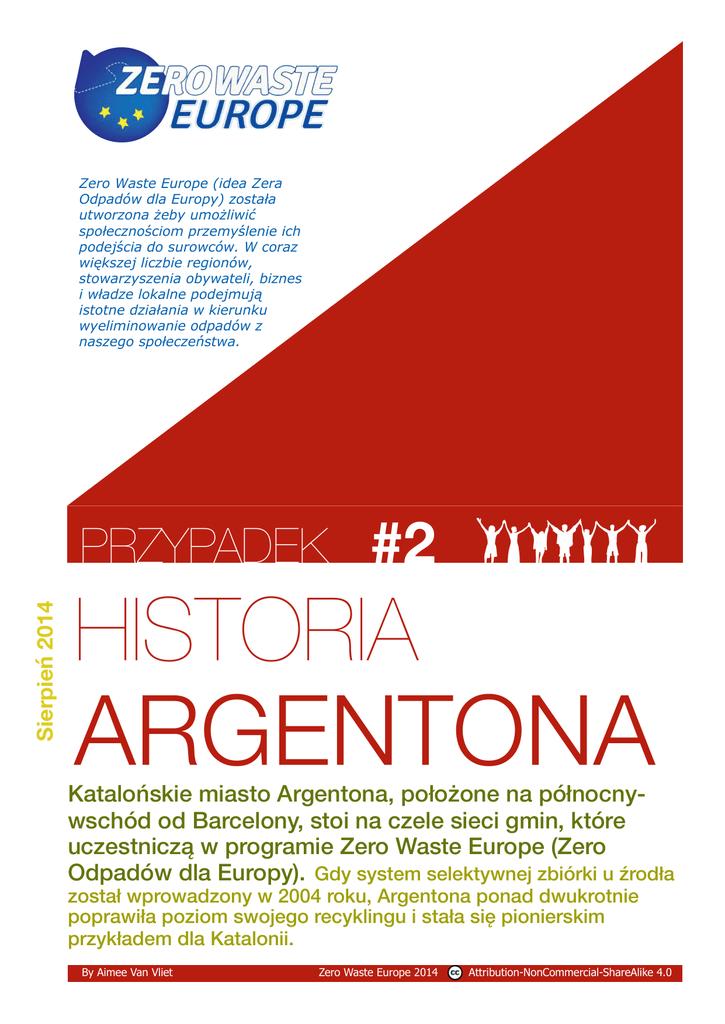 Zero Waste Europe (idea Zera Odpadów dla Europy) została utworzona żeby umożliwić społecznościom przemyślenie ich podejścia do surowców. W coraz większej liczbie regionów, stowarzyszenia obywateli, biznes i władze lokalne podejmują istotne działania w kierunku wyeliminowanie odpadów z naszego społeczeństwa. Sierpień 2014 PRZYPADEK #2 HISTORIA ARGENTONA Katalońskie miasto Argentona, położone na północnywschód od Barcelony, stoi na czele sieci gmin, które uczestniczą w programie Zero Waste Europe (Zero Odpadów dla Europy). Gdy system selektywnej zbiórki u źrodła został wprowadzony w 2004 roku, Argentona ponad dwukrotnie poprawiła poziom swojego recyklingu i stała się pionierskim przykładem dla Katalonii. By Aimee Van Vliet Zero Waste Europe 2014 Attribution-NonCommercial-ShareAlike 4.0 #2 Historia Argentona Powierzając umowy na usługi zbiórki odpadów lokalnym przedsiębiorstwom, gmina nie tylko zwiększyła lokalne zatrudnienie, ale również poprawiła świadomość społeczną dotyczącą środowiska, pokazując raz jeszcze, że program Zero Waste jest nie tylko o odpadach, ale również o naszej relacji z otoczeniem co wzmacnia świadomość społeczną. Zmiana w zbiórce odpadów Do roku 2004, Argentona podążała za najpopularniejszym systemem zbiórki odpadów w Hiszpanii, opierającym się na selektywnej zbiórce czterech rodzajów odpadów - szkło, papier, opakowania (takie jak tworzywa sztuczne), puszki oraz pozostałe odpady resztowe. Każdy z tych strumieni był odbierany w oddzielnych kontenerach umieszczonych na ulicach miasta. Odpady organiczne nie były zbierane oddzielnie, co powodowało ich zanieczyszczenie innymi rodzajami odpadów. Przy tak realizowanym systemie, poziom recyklingu utrzymywał się na stabilnym poziomie poniżej 20%, a większość odpadów wytwarzanych przez Argentonę wywożona była do spalarni w Mataró, położonej 5 km od Argentony. Możliwość odejścia od tego systemu pojawiła się gdy spalarnia w Mataró wykazała pierwsze oznaki przeciążenia. W latach 2001-2002, wraz ze wzrostem szybkości wytwarzania odpadów, gminy które • Populacja: 12,000 • Poziom odzysku 2012: 68,5 % • System selektywnej zbiórki odpadów u źrodła „od drzwi do drzwi”, jest realizowany w starej części miasta, którą zamieszkuje około 8500 mieszkańców (75% ludności), reszta ludności zamieszkuje obrzeża miasta Argentona. dostarczały odpady do tej spalarni stanęły przed dylematem, co zrobić dalej. Miały one do wyboru: rozbudowę spalarni w celu zaspokojenia potrzeb, bądź "Naszą motywacją, aby usprawnić system, nie była tylko ochrona środowiska. Ważny był również aspekt społeczny, wierzyliśmy że bardzo ważną rzeczą jest aby ludzie mieli świadomość ekologiczną, i aby angażowali się w kwestie dotyczące odpadów." Joan Pujol, ekspert techniczny ds. odpadów w Radzie Miasta. wprowadzenie zmiany w systemie gospodarowania odpadami, która doprowadzi do zwiększenia poziomu recyklingu i spowoduje że rozbudowa spalarni będzie zbędna. Na szczęście, burmistrzowie miast zdecydowali się na drugą opcję i zobowiązali się do poprawy selektywnej zbiórki odpadów. Argentona, będąc w najbliższym sąsiedztwie spalarni, była szczególnie wrażliwa w kwestii odpadów i rozpoczęła przełomową inicjatywę w celu odnalezienia alternatywy. W tym samym czasie trzy małe miasteczka w Katalonii wprowadzały w życie selektywną zbiórkę w systemie „od drzwi do drzwi”, były to Tiana, Tona i Riudecanyes. Czerpiąc z doświadczeń tych pionierskich miast, Rada Miasta Argentona była przekonana, że taki system gospodarowania odpadami, będzie krokiem naprzód. By Aimee Van Vliet 2 Zero Waste Europe 2014 Attribution-NonCommercial-ShareAlike 4.0 #2 Historia Argentona Opracowanie własne na podstawie danych z Rady Miasta Argentona Plan zaczął się kształtować w selektywnego systemu zbiórki u 2002 roku, po obradach Rady źródła „od drzwi do drzwi”. Ochrony Środowiska miasta Argentona oraz po wizytach w tych miasteczkach, które wprowadziły już nowy system gospodarowania odpadami. Gdy w 2004 roku umowa na zbieranie odpadów z firmą FCC (Fomento de Construcciones y Contratas) zbliżała się ku końcowi, Przed wprowadzeniem nowego Rada Miasta zdecydowała systemu mieszkańcy Argentony przyśpieszyć wdrożenie zostali poinformowani o Krok po kroku: Zacząć od odpadów organicznych i resztkowych „Na początku nie było łatwo, część ludzi odmówiła zmiany swoich przyzwyczajeń…! ...Rada Miasta postanowiła pozostać nieugięta... ...kilka tygodni później nowo wprowadzona metoda działała płynnie i bez skarg” 3 By Aimee Van Vliet Zero Waste Europe 2014 nadchodzących zmianach za pomocą kampanii uświadamiającej. W pierwszej fazie wdrażania nowego systemu, każdy mieszkaniec miasta otrzymał mały brązowy pojemnik do segregacji odpadów z żywności w domu. W ten sposób, krok po kroku system zaczął działać. Firmy zostały zaopatrzone w pojemniki na odpady organiczne o zróżnicowanej wielkości, w zależności od ilości wytwarzanych odpadów organicznych, za czym szły również zróżnicowane opłaty. Pozostałe odpady (te, co nie nadawały się do recyklingu) również były zbierane w systemie „od drzwi do drzwi”, podczas gdy inne strumienie odpadów nadal były zbierane w kontenerach na ulicach. "Na początku nie było łatwo, część ludzi odmówiła zmiany swoich przyzwyczajeń, niektórzy nawet protestowali przeciwko nowemu systemowi. Na szczęście Rada Miasta postanowiła pozostać nieugięta i skupiła się na realizacji pierwszej fazy projektu. Sukces jaki przyniósł pierwszy etap uspokoił mieszkańców, a już kilka tygodni później nowo wprowadzona metoda działała płynnie i bez skarg. wspomina Joan Pujol. Attribution-NonCommercial-ShareAlike 4.0 #2 Historia Argentona Natychmiastowe zwiększenie poziomu recyklingu Lokalne zielone miejsca