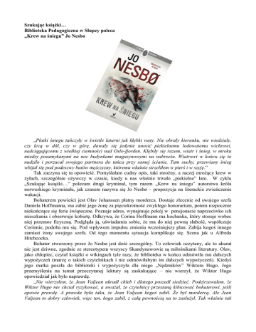 Szukając książki… Biblioteka Pedagogiczna w Słupcy poleca „Krew na śniegu” Jo Nesbø „Płatki śniegu tańczyły w świetle latarni jak kłębki waty. Nie obrały kierunku, nie wiedziały, czy lecą w dół, czy w górę, dawały się jedynie unosić piekielnemu lodowatemu wichrowi, nadciągającemu z wielkiej ciemności nad Oslo-fjorden. Kłębiły się razem, wiatr i śnieg, w mroku miedzy pozamykanymi na noc budynkami magazynowymi na nabrzeżu. Wiatrowi w końcu się to nudziło i porzucał swojego partnera do tańca przy samej ścianie. Tam suchy, przewiany śnieg wbijał się pod podeszwy butów mężczyzny, któremu właśnie strzeliłem w pierś i w szyję.” Tak zaczyna się ta opowieść. Pomyślałam cudny opis, taki mroźny, a raczej mrożący krew w żyłach, szczególnie ożywczy w czasie, kiedy u nas właśnie trwało „piekielne” lato. W cyklu „Szukając książki…” polecam drugi kryminał, tym razem „Krew na śniegu” autorstwa króla norweskiego kryminału, jak czasem nazywa się Jo Nesbø – propozycja na literackie zwieńczenie wakacji. Bohaterem powieści jest Olav Johanssen płatny morderca. Dostaje zlecenie od swojego szefa Daniela Hoffmanna, ma zabić jego żonę za pięciokrotność zwykłego honorarium, potem rozpocznie niekończące się ferie świąteczne. Poznaje adres, wynajmuje pokój w pensjonacie naprzeciwko ich mieszkania i obserwuje kobietę. Odkrywa, że Corina Hoffmann ma kochanka, który stosuje wobec niej przemoc fizyczną. Podgląda ją, uświadamia sobie, że ma do niej pewną słabość, współczuje Corinnie, podoba mu się. Pod wpływem impulsu zmienia wcześniejszy plan. Zabija kogoś innego zamiast żony swojego szefa. Od tego momentu sytuacja komplikuje się. Scena jak u Alfreda Hitchcocka. Bohater stworzony przez Jo Nesbø jest dość szczególny. To człowiek oczytany, ale to akurat nie jest dziwne, zgodnie ze stereotypem wszyscy Skandynawowie są miłośnikami literatury. Olav, jako chłopiec, czytał książki o wikingach tyle razy, że biblioteka w końcu odmówiła mu dalszych wypożyczeń (marzę o takich czytelnikach i nie odmówiłabym im dalszych wypożyczeń). Kiedyś jego matka poszła do biblioteki i wypożyczyła dla niego „Nędzników” Wiktora Hugo. Jego przemyślenia na temat przeczytanej lektury są zaskakujące – nie wierzył, że Wiktor Hugo opowiedział jak było naprawdę. „Nie wierzyłem, że Jean Valjean ukradł chleb i dlatego poszedł siedzieć. Podejrzewałem, że Wiktor Hugo nie chciał ryzykować, a uważał, że czytelnicy przestaną kibicować bohaterowi, jeśli opowie prawdę. A prawda była taka, że Jean Valjean kogoś zabił. Że był mordercą. Ale Jean Valjean to dobry człowiek, więc ten, kogo zabił, z całą pewnością na to zasłużył. Tak właśnie tak musiało być. Jean Valjean zabił kogoś, kto popełnił błąd i musiał za to zapłacić. Cała ta kradzież chleba tylko mnie irytowała. Ułożyłem więc tę historię od nowa. O wiele lepiej.” Nic dodać, nic ująć, w końcu opowiada to morderca na zlecenie. Całą historię poznajemy jako relację bohatera. Finał opowieści rozegra się 23 grudnia w latach siedemdziesiątych ubiegłego wieku, kiedy były jeszcze „zimy stulecia”. „Samochody poruszały się po śladach na śniegu, ludzie okrążali zaspy na chodnikach uśmiechnięci, bo nikomu się nie spieszyło, była Wigilia, czas pokoju i refleksji.” Powieść czyta się świetnie, ale nie jest to typowy kryminał. Ja odebrałam tę historię jako satyrę na kryminał. Jo Nesbø przyjechał w tym roku do Wrocławia na zaproszenie Wydawnictwa Dolnośląskiego. Jego wizyta uświetniła szczególną okazję przyznania temu miastu na rok tytułu Światowej Stolicy Książki UNESCO (w uznaniu – za przygotowanie wybitnego programu związanego z promocją czytelnictwa dla szerszej publiczności realizowanego przez cały rok). Sympatycy jego książek czekali w długiej kolejce, żeby otrzymać autograf i skorzystać z okazji zobaczenia Nesbø na żywo. Jego powieści cieszą się dużą popularnością na świecie, przetłumaczono je na ponad 40 języków, otrzymał wiele nagród. Nesbø opublikował 14 tytułów, wszystkie ukazały się także w Polsce, gdzie sprzedano ponad milion egzemplarzy jego książek. Wpływ na to miała zapewne bardzo dobra promocja tej literatury. Nawet jeśli ktoś nie interesuje się kryminałem, nazwisko Nesbø zna z plakatów reklamujących jego nowe książki, także w formie audiobooków, czy e-booków jak „Karaluchy”, „Pierwszy śnieg”, „Syn”. Thriller „Łowcy głów” został zekranizowany w 2012 roku. Hanka Kasperska-Stróżyk Szukając książki… Biblioteka Pedagogiczna w Słupcy poleca „Czytanie z kości” Jakuba Szamałka Nigdy nie uważałem kryminału za „gorszy” gatunek literacki ani taki, który można czytać wyłącznie na urlopie, choć muszę przyznać: niejednokrotnie zdarzyło mi się je czytać właśnie wtedy i zawsze uważałem, że to był doskonały wybór (a najczęściej wybierałem nie byle kogo, bo królową kryminału – Agathę Christie). Miałem też szczęście trafiać na powieści kryminalne dobrze napisane, to nic, że były z poprzedniej epoki, z funkcjonariuszami MO (czyli Milicji Obywatelskiej) w roli głównej, czy wręcz klasyczne np. Arthura Conan Doyle’a i jego Sherlocka Holmesa albo oryginalne, jak choćby prześmieszne kryminały Joanny Chmielewskiej… Sądziłem, że po kryminałach Joanny Chmielewskiej nic mnie już nie zaskoczy, a jednak okazało się, że byłem w błędzie. Bo Jakub Szamałek swoim „Czytaniem z kości” sprawił, że mocno otworzyłem oczy ze zdziwienia. Po pierwsze, dlatego, że pierwszy raz czytałem powieść kryminalną, która jest osadzona w tak odległej przeszłości. Po drugie, dlatego, że umieścił akcję powieści w mieście Veii zwracając tym samym uwagę czytelników na lud, który został przez Rzymian zepch