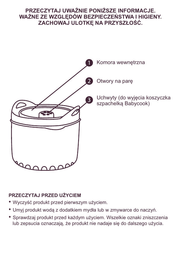 PRZECZYTAJ UWAŻNIE PONIŻSZE INFORMACJE. WAŻNE ZE WZGLĘDÓW BEZPIECZEŃSTWA I HIGIENY. ZACHOWAJ ULOTKĘ NA PRZYSZŁOŚĆ. Komora wewnętrzna Otwory na parę Uchwyty (do wyjęcia koszyczka szpachelką Babycook) PRZECZYTAJ PRZED UŻYCIEM • Wyczyść produkt przed pierwszym użyciem. • Umyj produkt wodą z dodatkiem mydła lub w zmywarce do naczyń. • Sprawdzaj produkt przed każdym użyciem. Wszelkie oznaki zniszczenia lub zepsucia oznaczają, że produkt nie nadaje się do dalszego użycia. PL SPOSÓB OBSŁUGI Nalej wodę do ogrzewanej parowo komory za pomocą naczynka z miarką Babycook (poziom 3). Nalej wodę i pokarm stały do komory wewnętrznej. Nie przekraczaj poziomu oznaczonego jako „Max” (patrz tabela poniżej). Zmieszaj całość. Umieść urządzenie do gotowania ryżu w misce Babycook. Upewnij się, że miska mieści się w koszyczku po zamknięciu pokrywki. Zamknij całość. Podłącz urządzenie do prądu. Przesuń włącznik w lewo w kierunku symbolu pary. Po ugotowaniu (patrz tabela poniżej) otwórz pokrywę miski używając pokrętła. Wyjmij koszyczek za pomocą szpachelki. Zawartość przełóż do naczynia. ZALECENIA Płucz ryż dokładnie przed gotowaniem. Przed użyciem przeczytaj instrukcję Babycook. PORADNIK GOTOWANIA Pokarm Miarka wody Zalecany czas gotowania Ilość wody w urządzeniu do gotowania ryżu Ilość pokarmu w urządzeniu do gotowania ryżu Ryż 3 około 20 minut 150 ml 100 g Makaron 3 około 15 minut 120 ml 100 g Parametry mogą ulegać zmianie w zależności od rodzaju pokarmu oraz upodobań indywidualnych. PRZEPISY KULINARNE Porcja dla dziecka Beaba (150 g) KASZA MANNA NA MLEKU WANILIOWA Czas przygotowania: 11 minut. SKŁADNIKI: – 60 g średnioziarnistej kaszy manny – 20 g brązowego cukru – pół wanilii płaskolistnej Odmierz trzy porcje wody za pomocą naczynka z miarką. Nalej do ogrzewanej parowo komory. Wsyp kaszę mannę i cukier do urządzenia do gotowania ryżu. Odmierz trzy porcje półtłustego mleka za pomocą naczynka z miarką. Z ziarenka wanilii wyskrob nasionka za pomocą ostrej końcówki noża. Dodaj do mleka. Całość wlej do mieszanki kaszy manny z cukrem. Dokładnie wymieszaj. Zamknij Babycook. Gotuj całość przez 11 minut. Gdy gotowanie dobiegnie końca, otwórz ostrożnie pokrywkę Babycook. Uważaj, by się nie poparzyć. Wyjmij urządzenie do gotowania ryżu z miski. Odsącz płyn. Przełóż zawartość urządzenia do gotowania ryżu do miksera. Miksuj przez dwie minuty, by pozbyć się grudek. Poczekaj aż pokarm wystygnie do temperatury pokojowej. Podawaj z biszkopcikiem. Zależnie od wieku dziecka możesz dodać 10 rodzynków do kaszy manny przed gotowaniem. PRZEPISY KULINARNE Porcja dla dziecka Beaba (150 g) RYŻ PO KANTOŃSKU Czas przygotowania: 17-18 minut. SKŁADNIKI: – 60 g ryżu organicznego Basmati – około 10 mrożonych ziarenek groszku – pół plastra gotowanej szynki – 1 jajko Odmierz trzy porcje wody za pomocą naczynka z miarką. Nalej do ogrzewanej parowo komory. Wsyp ryż do urządzenia do gotowania ryżu. Odmierz dwie porcje wody za pomocą naczynka z miarką. Nalej wodę ze szczyptą soli bezpośrednio do urządzenia do gotowania ryżu. Dodaj groszek. Zamknij Babycook. Gotuj przez 17-18 minut. W międzyczasie ubij jajko. Przygotuj omlet. Pokrój omlet i szynkę na cienkie paski. Gdy gotowanie dobiegnie końca, otwórz ostrożnie pokrywkę Babycook. Uważaj, by się nie poparzyć. Wyjmij urządzenie do gotowania ryżu z miski. Odsącz płyn. Przełóż zawartość urządzenia do gotowania ryżu do miksera. Dodaj paski omleta i szynki do miski. Miksuj jednokrotnie. Można podawać.