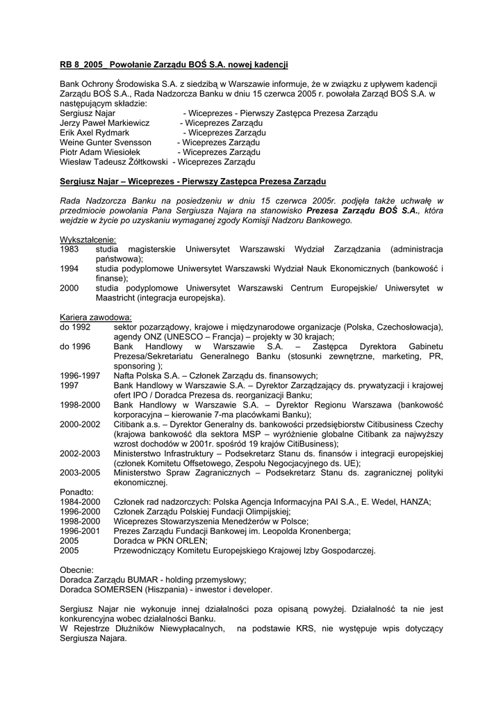 RB 8_2005_ Powołanie Zarządu BOŚ S.A. nowej kadencji Bank Ochrony Środowiska S.A. z siedzibą w Warszawie informuje, że w związku z upływem kadencji Zarządu BOŚ S.A., Rada Nadzorcza Banku w dniu 15 czerwca 2005 r. powołała Zarząd BOŚ S.A. w następującym składzie: Sergiusz Najar - Wiceprezes - Pierwszy Zastępca Prezesa Zarządu Jerzy Paweł Markiewicz - Wiceprezes Zarządu Erik Axel Rydmark - Wiceprezes Zarządu Weine Gunter Svensson - Wiceprezes Zarządu Piotr Adam Wiesiołek - Wiceprezes Zarządu Wiesław Tadeusz Żółtkowski - Wiceprezes Zarządu Sergiusz Najar – Wiceprezes - Pierwszy Zastępca Prezesa Zarządu Rada Nadzorcza Banku na posiedzeniu w dniu 15 czerwca 2005r. podjęła także uchwałę w przedmiocie powołania Pana Sergiusza Najara na stanowisko Prezesa Zarządu BOŚ S.A., która wejdzie w życie po uzyskaniu wymaganej zgody Komisji Nadzoru Bankowego. Wykształcenie: 1983 studia magisterskie Uniwersytet Warszawski Wydział Zarządzania (administracja państwowa); 1994 studia podyplomowe Uniwersytet Warszawski Wydział Nauk Ekonomicznych (bankowość i finanse); 2000 studia podyplomowe Uniwersytet Warszawski Centrum Europejskie/ Uniwersytet w Maastricht (integracja europejska). Kariera zawodowa: do 1992 sektor pozarządowy, krajowe i międzynarodowe organizacje (Polska, Czechosłowacja), agendy ONZ (UNESCO – Francja) – projekty w 30 krajach; do 1996 Bank Handlowy w Warszawie S.A. – Zastępca Dyrektora Gabinetu Prezesa/Sekretariatu Generalnego Banku (stosunki zewnętrzne, marketing, PR, sponsoring ); 1996-1997 Nafta Polska S.A. – Członek Zarządu ds. finansowych; 1997 Bank Handlowy w Warszawie S.A. – Dyrektor Zarządzający ds. prywatyzacji i krajowej ofert IPO / Doradca Prezesa ds. reorganizacji Banku; 1998-2000 Bank Handlowy w Warszawie S.A. – Dyrektor Regionu Warszawa (bankowość korporacyjna – kierowanie 7-ma placówkami Banku); 2000-2002 Citibank a.s. – Dyrektor Generalny ds. bankowości przedsiębiorstw Citibusiness Czechy (krajowa bankowość dla sektora MSP – wyróżnienie globalne Citibank za najwyższy wzrost dochodów w 2001r. spośród 19 krajów CitiBusiness); 2002-2003 Ministerstwo Infrastruktury – Podsekretarz Stanu ds. finansów i integracji europejskiej (członek Komitetu Offsetowego, Zespołu Negocjacyjnego ds. UE); 2003-2005 Ministerstwo Spraw Zagranicznych – Podsekretarz Stanu ds. zagranicznej polityki ekonomicznej. Ponadto: 1984-2000 Członek rad nadzorczych: Polska Agencja Informacyjna PAI S.A., E. Wedel, HANZA; 1996-2000 Członek Zarządu Polskiej Fundacji Olimpijskiej; 1998-2000 Wiceprezes Stowarzyszenia Menedżerów w Polsce; 1996-2001 Prezes Zarządu Fundacji Bankowej im. Leopolda Kronenberga; 2005 Doradca w PKN ORLEN; 2005 Przewodniczący Komitetu Europejskiego Krajowej Izby Gospodarczej. Obecnie: Doradca Zarządu BUMAR - holding przemysłowy; Doradca SOMERSEN (Hiszpania) - inwestor i developer. Sergiusz Najar nie wykonuje innej działalności poza opisaną powyżej. Działalność ta nie jest konkurencyjna wobec działalności Banku. W Rejestrze Dłużników Niewypłacalnych, na podstawie KRS, nie występuje wpis dotyczący Sergiusza Najara. Jerzy Paweł Markiewicz - Wiceprezes Zarządu Wykształcenie: wyższe ekonomiczne, absolwent Uniwersytetu Warszawskiego. Przebieg pracy zawodowej: 1981-1995 Bank Polska Kasa Opieki S.A. kolejno na stanowiskach: 1981-1983 pracownik Wydziału Operacji Zagranicznych I Oddz. W Warszawie, 1983-1984 pracownik Departamentu Rozliczeń Zagranicznych, 1984-1989 dealer/starszy dealer w Zespole Gospodarki Pieniężnej, 1989-1990 zastępca dyrektora Departamentu Rozliczeń Zagranicznych (nadzorujący dealing room i back office), 1990-1990 Dyrektor Departamentu Dewizowego, 1990-1995 Vice President - Treasury w Oddziale w Nowym Jorku, 1995-1998 Pierwszy Polsko-Amerykański Bank S.A. kolejno na stanowiskach: 1995-1995 Dyrektor Departamentu Skarbu, przewodniczący Komitetu Zarządzania Aktywami i Pasywami, 1995-1998 Wiceprezes, Członek Zarządu Banku, przewodniczący Komitetu Zarządzania Aktywami i Pasywami, 1998-2001 Bank Polska Kasa Opieki S.A. kolejno na stanowiskach: 1998-1999 Dyrektor Wykonawczy nadzorujący Pion Bankowości Korporacyjnej i Departament Skarbu, członek Komitetu Zarządzania Aktywami i Pasywami, 1999-2001 Dyrektor Wykonawczy nadzorujący Departament Zarządzania Płynnością i Aktywami w Pionie Inwestycji i Zarządzania Aktywami, członek Komitetu Zarządzania Aktywami i Pasywami, 2001-2001 Dyrektor Wykonawczy nadzorujący Departament Inwestycji Finansowych. Od dnia 5 marca 2002 r. pełni funkcję Wiceprezesa Zarządu BOŚ S.A. Pozostałe doświadczenia zawodowe: 1988-1989 członek Zespołu Doradców Finansowych PLL LOT w negocjacjach dot. leasingu samolotów Boeing 767, 1989-1990 przedstawiciel Banku PeKaO, członek Komisji Międzybankowej ds. wdrożenia nowego prawa dewizowego w systemie bankowym, 1990-1990 kierownik Zespołu Doradców Finansowych PLL LOT w negocjacjach dot. leasingu samolotów ATR-72, 1998 członek rad nadzorczych wielu spółek, w tym aktualnie: Elektromontaż Export S.A., KGHM METALE S.A. Jerzy Paweł Markiewicz nie wykonuje innej działalności poza opisaną powyżej. Działalność ta nie jest konkurencyjna wobec działalności Banku. W Rejestrze Dłużników Niewypłacalnych, na podstawie KRS, nie występuje wpis dotyczący Jerzego Pawła Markiewicza. Erik Axel Rydmark - Wiceprezes Zarządu Wykształcenie: absolwent Wyższej Szkoły Ekonomicznej, Västeras, Szwecja. Dodatkowe kwalifikacje: 1971-1974 Wewnętrzne Wyższe Kolegium Bankowości; 1974 Szkoła językowa, Londyn (3 miesiące); 1975-78 Szkolenia w zakresie sprzedaży, Mercuri Institute, różne kursy; 1980 Finanse i rachunkowość, Szwedzki Instytut Zarządzania, IFL (4 tyg.); 1983 Marketing, Szwedzki Instytut Zarządzania, IFL (4 tyg.); 1985 Seminarium nt. kredytowania pośredniego Scandinavian Bank Ltd., Londyn; 1988 Program dla kursantów, Hewlett Packard Inc., Palo Alto, Kal