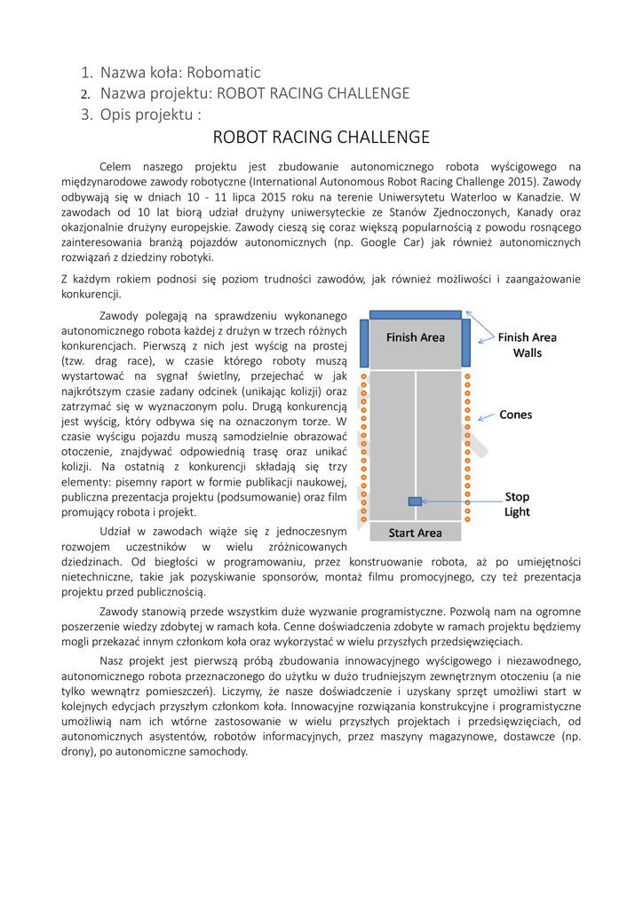 1. Nazwa koła: Robomatic 2. Nazwa projektu: ROBOT RACING CHALLENGE 3. Opis projektu : ROBOT RACING CHALLENGE Celem naszego projektu jest zbudowanie autonomicznego robota wyścigowego na międzynarodowe zawody robotyczne (International Autonomous Robot Racing Challenge 2015). Zawody odbywają się w dniach 10 - 11 lipca 2015 roku na terenie Uniwersytetu Waterloo w Kanadzie. W zawodach od 10 lat biorą udział drużyny uniwersyteckie ze Stanów Zjednoczonych, Kanady oraz okazjonalnie drużyny europejskie. Zawody cieszą się coraz większą popularnością z powodu rosnącego zainteresowania branżą pojazdów autonomicznych (np. Google Car) jak również autonomicznych rozwiązań z dziedziny robotyki. Z każdym rokiem podnosi się poziom trudności zawodów, jak również możliwości i zaangażowanie konkurencji. Zawody polegają na sprawdzeniu wykonanego autonomicznego robota każdej z drużyn w trzech różnych konkurencjach. Pierwszą z nich jest wyścig na prostej (tzw. drag race), w czasie którego roboty muszą wystartować na sygnał świetlny, przejechać w jak najkrótszym czasie zadany odcinek (unikając kolizji) oraz zatrzymać się w wyznaczonym polu. Drugą konkurencją jest wyścig, który odbywa się na oznaczonym torze. W czasie wyścigu pojazdu muszą samodzielnie obrazować otoczenie, znajdywać odpowiednią trasę oraz unikać kolizji. Na ostatnią z konkurencji składają się trzy elementy: pisemny raport w formie publikacji naukowej, publiczna prezentacja projektu (podsumowanie) oraz film promujący robota i projekt. Udział w zawodach wiąże się z jednoczesnym rozwojem uczestników w wielu zróżnicowanych dziedzinach. Od biegłości w programowaniu, przez konstruowanie robota, aż po umiejętności nietechniczne, takie jak pozyskiwanie sponsorów, montaż filmu promocyjnego, czy też prezentacja projektu przed publicznością. Zawody stanowią przede wszystkim duże wyzwanie programistyczne. Pozwolą nam na ogromne poszerzenie wiedzy zdobytej w ramach koła. Cenne doświadczenia zdobyte w ramach projektu będziemy mogli przekazać innym członkom koła oraz wykorzystać w wielu przyszłych przedsięwzięciach. Nasz projekt jest pierwszą próbą zbudowania innowacyjnego wyścigowego i niezawodnego, autonomicznego robota przeznaczonego do użytku w dużo trudniejszym zewnętrznym otoczeniu (a nie tylko wewnątrz pomieszczeń). Liczymy, że nasze doświadczenie i uzyskany sprzęt umożliwi start w kolejnych edycjach przyszłym członkom koła. Innowacyjne rozwiązania konstrukcyjne i programistyczne umożliwią nam ich wtórne zastosowanie w wielu przyszłych projektach i przedsięwzięciach, od autonomicznych asystentów, robotów informacyjnych, przez maszyny magazynowe, dostawcze (np. drony), po autonomiczne samochody. W projekt zaangażowani są członkowie koła Robomatic z dwóch różnych wydziałów. W trakcie rozwoju projektu planujemy znaleźć dodatkowych sponsorów. Liczymy, że elementem zachęcającym do sponsoringu będzie widoczny postęp w pracach prezentowany na blogu internetowym, jak również korzystne opcje promocji sponsora z naszej strony (ekspozycja loga i podziękowania na stronie, logo na koszulkach drużynowych czy wspólne specjalne akcje promocyjne). Aktualna popularność tematyki pojazdów autonomicznych mamy nadzieję w znacznym stopniu ułatwi rozmowy z potencjalnymi sponsorami. Projekt powinien też wzbudzić duże zainteresowanie mediów oraz na różnych targach czy wystawach zarówno w środowisku naukowym jak i pośród osób niezwiązanych z nauką. Między innymi efekty projektu zostaną opublikowane w ogólnopolskim kwartalniku Doradca Zawodowy. Tematyka projektu jest tak inspirująca i wciągająca, że etap koncepcyjny i pierwsze prace konstrukcyjne mamy już za sobą. Zainstalowaliśmy także m.in. środowisko ROS (The Robot Operating System) międzynarodową platformę do obsługi robotów. Trwają prace nad wykonaniem modelu 3D naszej konstrukcji. Posiadamy już gotowe podwozie od modelu RC, silnik bezszczotkowy wraz ze sterownikiem i przekładnią oraz kilka potężnych serw sterujących koła i przełożenia. Łączna cena wkładu własnego w postaci podwozia wraz z elektroniką wynosi 2 570 zł.
