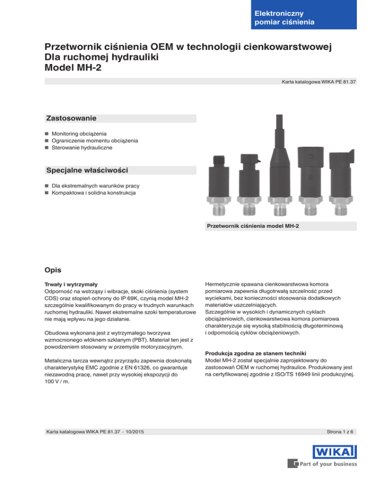 Elektroniczny pomiar ciśnienia Przetwornik ciśnienia OEM w technologii cienkowarstwowej Dla ruchomej hydrauliki Model MH-2 Karta katalogowa WIKA PE 81.37 Zastosowanie ■■ Monitoring obciążenia ■■ Ograniczenie momentu obciążenia ■■ Sterowanie hydrauliczne Specjalne właściwości ■■ Dla ekstremalnych warunków pracy ■■ Kompaktowa i solidna konstrukcja Przetwornik ciśnienia model MH-2 Opis Trwały i wytrzymały Odporność na wstrząsy i wibracje, skoki ciśnienia (system CDS) oraz stopień ochrony do IP 69K, czynią model MH-2 szczególnie kwalifikowanym do pracy w trudnych warunkach ruchomej hydrauliki. Nawet ekstremalne szoki temperaturowe nie mają wpływu na jego działanie. Obudowa wykonana jest z wytrzymałego tworzywa wzmocnionego włóknem szklanym (PBT). Materiał ten jest z powodzeniem stosowany w przemyśle motoryzacyjnym. Metaliczna tarcza wewnątrz przyrządu zapewnia doskonałą charakterystykę EMC zgodnie z EN 61326, co gwarantuje niezawodną pracę, nawet przy wysokiej ekspozycji do 100 V / m. Karta katalogowa WIKA PE 81.37 ∙ 10/2015 Hermetycznie spawana cienkowarstwowa komora pomiarowa zapewnia długotrwałą szczelność przed wyciekami, bez konieczności stosowania dodatkowych materiałów uszczelniających. Szczególnie w wysokich i dynamicznych cyklach obciążeniowich, cienkowarstwowa komora pomiarowa charakteryzuje się wysoką stabilnością długoterminową i odpornością cyklów obciążeniowych. Produkcja zgodna ze stanem techniki Model MH-2 został specjalnie zaprojektowany do zastosowań OEM w ruchomej hydraulice. Produkowany jest na certyfikowanej zgodnie z ISO/TS 16949 linii produkcyjnej. Strona 1 z 6 Zakresy pomiarowe Ciśnienie względne w bar Zakres pomiarowy Dopuszczalne przeciążenie Ciśnienie niszczące 0 ... 40 80 400 0 ... 60 120 550 0 ... 100 200 800 0 ... 160 320 1,000 0 ... 250 500 1,200 0 ... 400 800 1,700 0 ... 600 1,200 2,400 Zakresy pomiarowe < 40 bar na zapytanie Szczelność próżniowa Tak Sygnały wyjściowe Typ sygnału Sygnał Prądowy (2-przewodowy) 4 ... 20 mA Napięciowy (3-przewodowy) DC 0 ... 10 V DC 1 ... 5 V Ratiometryczny DC 0.5 ... 4.5 V Inne sygnały wyjściowe dostępne na zapytanie Obciążenie w Ω ■■ 4 ... 20 mA: ■■ DC 0 ... 10 V: ■■ DC 1 ... 5 V: ■■ DC 0.5 ... 4.5 V: ≤ (zasilanie - 10 V) / 0.02 A > 5k > 2.5k > 4.5k Zasilanie napięciowe Zasilanie Zasilanie zależy od wybranego sygnału wyjściowego ■■ 4 ... 20 mA: DC 10 ...36 V ■■ DC 0 ... 10 V: DC 14 ... 36 V ■■ DC 1 ... 5 V: DC 8 ... 36 V ■■ DC 0.5 ... 4.5 V: DC 4.5 ... 5.5 V Warunki odniesienia (wg IEC 61298-1) Temperatura 15 ... 25 °C Ciśnienie atmosferyczne 860 ... 1,060 mbar Wilgotność 45 ... 75 % względna Zasilanie DC 24 V Pozycja montażu Kalibrowany w pozycji pionowej z przyłączem procesowym skierowanym w dół. Strona 2 z 6 Karta katalogowa WIKA PE 81.37 ∙ 10/2015 Dane dokładności Dokładność w warunkach odniesienia Maksimum: ≤ ±1 % zakresu Przyłącza procesowe Obejmuje nieliniowość, histerezę, zero offset i odchylenie końcowej wartości (odpowiada błędowi pomiaru wg IEC 61298-2). Nieliniowość (wg IEC 61298-2) Maksimum: ≤ ±0.4 % zakresu BFSL Typowa: ≤ ±0.25 % zakresu BFSL Przyłącze procesowe wg Rozmiar gwintu DIN 3852-E G¼A M14 x 1.5 ¼ NPT 7/16-20 UNF-2A ANSI/ASME B1.20.1 SAE J514 Fig.34B Uszczelnienia Błąd temperaturowy dla -40 ... +100 °C Średni współczynnik temperaturowy punktu zerowego: ±0.15 % zakresu/10K Średni współczynnik temperaturowy zakresu: ±0.08 % zakresu/10K Czas ustalania ≤ 2 ms Stabilność długookresowa Typowa: ≤ ±0.2 % zakresu/rok Rozmiar gwintu Standard Opcja G¼A 7/16-20 UNF-2A NBR O-ring BOSS z FKM FKM - Uszczelnienia wyspecyfikowane jako "Standard" są załączone w dostawie. System CDS Wszystkie przyłącza procesowe dostępne są z systemem CDS. Średnica kanału ciśnieniowego jest zredukowana, aby zapobiegać skokom ciśnienia i kawitacji (patrz rys.1). Ilustracja systemu CDS Warunki pracy Stopień ochrony (wg IEC 60529) Stopień ochrony zależy od typu przyłącza elektrycznego. ■■ Przyłącze okrągłe M12 x 1 (4-pinowe): ■■ Przyłącze Metri-Pack 150 (3-pinowe): ■■ Przyłącze bagnetowe DIN 72585 ■■ ■■ ■■ ■■ (4-pinowe): Przyłącze AMP Superseal 1.5 (3-pinowe): Przyłącze AMP Micro Quadlock (3-pinowe): Przyłącze Deutsch DT04-3P (3-pinowe): Wyjście kablowe: IP 67 67 IP 69K Rys. 1: Zredukowana średnica kanału ciśnieniowego IP 67 IP 67 IP 67 IP 69K Wyspecyfikowany stopień ochrony ma zastosowanie tylko wtedy, kiedy połączony jest z dopasowaną wtyczką posiadającą właściwy stopień ochrony. Materiały Części zwilżane Stal nierdzewna Części niezwilżane Bardzo odporne wzmocnione włóknem szklanym tworzywo (PBT) Odporność na wibracje 20 g (wg IEC 60068-2-6, w warunkach rezonansu) Odporność na wstrząsy 500 g (wg IEC 60068-2-27, mechaniczne) Temperatury Dopuszczalne zakresy temperatur dla: ■■ Otoczenia: -40 ... +100 °C ■■ Medium: -40 ... +125 °C ■■ Przechowywania: -40 ... +100 °C Karta katalogowa WIKA PE 81.37 ∙ 10/2015 Stron 3 z 6 Aprobaty Logo Opis Kraj Deklaracja zgodności CE ■■ Dyrektywa EMC 2004/108/EC, EN 61326 emisja (grupa 1, klasa B) i odporność (aplikacje Unia Europejska przemysłowe) ■■ Dyrektywa ciśnieniowa 97/23/EC Aprobaty i certyfikaty, patrz strona www Przyłącza elektryczne Odporność na zwarcie S+ vs. UOchrona przed odwrotną polaryzacją UB vs. U(brak ochrony przed odwrotną polaryzacją z ratiometrycznym sygnałem wyjściowym) Napięcie izolacyjne DC 500 V Schematy przyłączy Przyłącze okrągłe M12 x 1 (4-pinowe) 2-przewodowe 3-przewodowe 1 1 UB B B U- 3 3 U- A A S+ - 4 S+ - C 2-przewodowe 3-przewodowe 1 UB 3 3 U- 2 2 U- 1 1 S+ - 3 S+ - 2 Przyłącze Deutsch DT04-3P (3-pinowe) 2-przewodowe 3-przewodowe UB 3 3 UB A A U- 1 1 U- B B S+ - 2 S+ - C Wyjście kablowe 2-przewodowe 3-przewodowe UB brązowy brązowy U- zielony zie