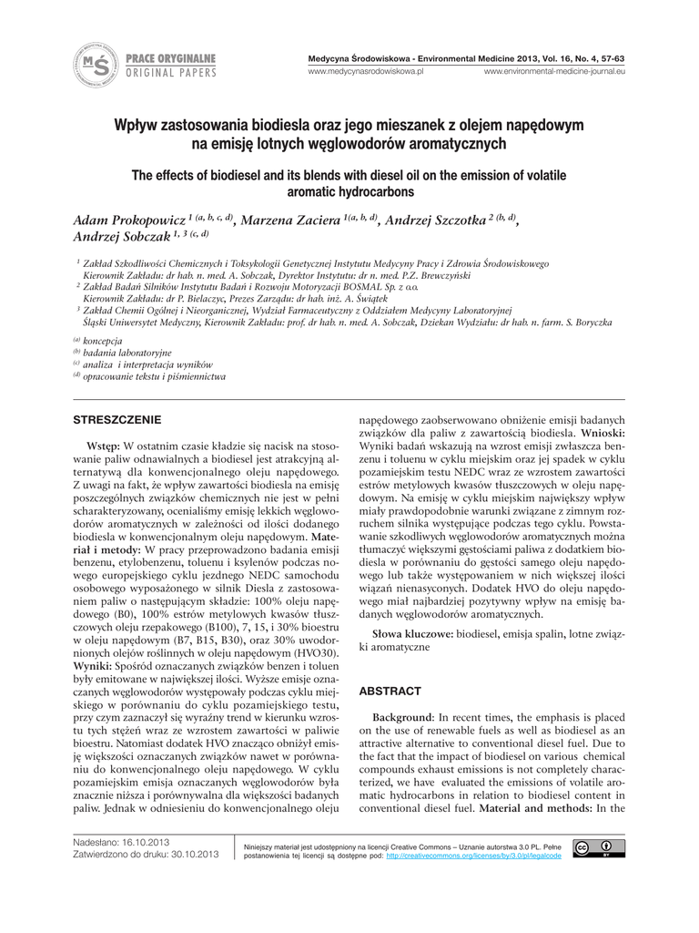 Medycyna Środowiskowa - Environmental Medicine 2013, Vol. 16, No. 4, 57-63 www.environmental-medicine-journal.eu www.medycynasrodowiskowa.pl Wpływ zastosowania biodiesla oraz jego mieszanek z olejem napędowym na emisję lotnych węglowodorów aromatycznych The effects of biodiesel and its blends with diesel oil on the emission of volatile aromatic hydrocarbons Adam Prokopowicz 1 (a, b, c, d), Marzena Zaciera 1(a, b, d), Andrzej Szczotka 2 (b, d), Andrzej Sobczak 1, 3 (c, d) 1 2 3 Zakład Szkodliwości Chemicznych i Toksykologii Genetycznej Instytutu Medycyny Pracy i Zdrowia Środowiskowego Kierownik Zakładu: dr hab. n. med. A. Sobczak, Dyrektor Instytutu: dr n. med. P.Z. Brewczyński Zakład Badań Silników Instytutu Badań i Rozwoju Motoryzacji BOSMAL Sp. z o.o. Kierownik Zakładu: dr P. Bielaczyc, Prezes Zarządu: dr hab. inż. A. Świątek Zakład Chemii Ogólnej i Nieorganicznej, Wydział Farmaceutyczny z Oddziałem Medycyny Laboratoryjnej Śląski Uniwersytet Medyczny, Kierownik Zakładu: prof. dr hab. n. med. A. Sobczak, Dziekan Wydziału: dr hab. n. farm. S. Boryczka koncepcja badania laboratoryjne (c) analiza i interpretacja wyników (d) opracowanie tekstu i piśmiennictwa (a) (b) StrESzczENiE Wstęp: W ostatnim czasie kładzie się nacisk na stosowanie paliw odnawialnych a biodiesel jest atrakcyjną alternatywą dla konwencjonalnego oleju napędowego. Z uwagi na fakt, że wpływ zawartości biodiesla na emisję poszczególnych związków chemicznych nie jest w pełni scharakteryzowany, ocenialiśmy emisję lekkich węglowodorów aromatycznych w zależności od ilości dodanego biodiesla w konwencjonalnym oleju napędowym. Materiał i metody: W pracy przeprowadzono badania emisji benzenu, etylobenzenu, toluenu i ksylenów podczas nowego europejskiego cyklu jezdnego NEDC samochodu osobowego wyposażonego w silnik Diesla z zastosowaniem paliw o następującym składzie: 100% oleju napędowego (B0), 100% estrów metylowych kwasów tłuszczowych oleju rzepakowego (B100), 7, 15, i 30% bioestru w oleju napędowym (B7, B15, B30), oraz 30% uwodornionych olejów roślinnych w oleju napędowym (HVO30). Wyniki: Spośród oznaczanych związków benzen i toluen były emitowane w największej ilości. Wyższe emisje oznaczanych węglowodorów występowały podczas cyklu miejskiego w porównaniu do cyklu pozamiejskiego testu, przy czym zaznaczył się wyraźny trend w kierunku wzrostu tych stężeń wraz ze wzrostem zawartości w paliwie bioestru. Natomiast dodatek HVO znacząco obniżył emisję większości oznaczanych związków nawet w porównaniu do konwencjonalnego oleju napędowego. W cyklu pozamiejskim emisja oznaczanych węglowodorów była znacznie niższa i porównywalna dla większości badanych paliw. Jednak w odniesieniu do konwencjonalnego oleju Nadesłano: 16.10.2013 Zatwierdzono do druku: 30.10.2013 napędowego zaobserwowano obniżenie emisji badanych związków dla paliw z zawartością biodiesla. Wnioski: Wyniki badań wskazują na wzrost emisji zwłaszcza benzenu i toluenu w cyklu miejskim oraz jej spadek w cyklu pozamiejskim testu NEDC wraz ze wzrostem zawartości estrów metylowych kwasów tłuszczowych w oleju napędowym. Na emisję w cyklu miejskim największy wpływ miały prawdopodobnie warunki związane z zimnym rozruchem silnika występujące podczas tego cyklu. Powstawanie szkodliwych węglowodorów aromatycznych można tłumaczyć większymi gęstościami paliwa z dodatkiem biodiesla w porównaniu do gęstości samego oleju napędowego lub także występowaniem w nich większej ilości wiązań nienasyconych. Dodatek HVO do oleju napędowego miał najbardziej pozytywny wpływ na emisję badanych węglowodorów aromatycznych. Słowa kluczowe: biodiesel, emisja spalin, lotne związki aromatyczne AbStrAct Background: In recent times, the emphasis is placed on the use of renewable fuels as well as biodiesel as an attractive alternative to conventional diesel fuel. Due to the fact that the impact of biodiesel on various chemical compounds exhaust emissions is not completely characterized, we have evaluated the emissions of volatile aromatic hydrocarbons in relation to biodiesel content in conventional diesel fuel. Material and methods: In the Niniejszy materiał jest udostępniony na licencji Creative Commons – Uznanie autorstwa 3.0 PL. Pełne postanowienia tej licencji są dostępne pod: http://creativecommons.org/licenses/by/3.0/pl/legalcode 58 Medycyna Środowiskowa - Environmental Medicine 2013, Vol. 16, No. 4 Adam Prokopowicz i wsp.: Wpływ biodiesla na emisję lotnych węglowodorów aromatycznych study we have assessed the emission of benzene, toluene, ethylbenzene and xylens during New European Driving Cycle NEDC for a passenger car with a diesel engine using the following fuels: 100% diesel fuel (B0), 100% rapeseed methyl esters (B100), 7, 15 and 30% rapeseed methyl esters in diesel fuel (B7, B15, B30), and 30% hydrotreated vegetable oil in diesel fuel (HVO30). Results: Among all determined compounds, benzene and toluene were emitted in the largest quantities. Higher emissions were determined during urban driving cycle then during extraurban driving cycle. A clear trend was observed when along with increasing amount of added rapeseed methyl esters the emission increased. However, additive of HVO decreased the emission of the most volatile aromatic compounds even when compared to conventional diesel fuel. During extra-urban driving cycle the emission was significantly lower and comparable for most fuels tested. Nevertheless in the context of conventional diesel fuel, lower emission for fuels with biodiesel was observed. Conclusion: The results have indicated the increase in benzene and toluene exhaust emissions mostly during urban driving cycle and its decrease during extra-urban driving cycle in NEDC test with increasing content of fatty acids methyl esters in diesel fuel. The emission in urban cycle was probably influenced by cold-start condition during 