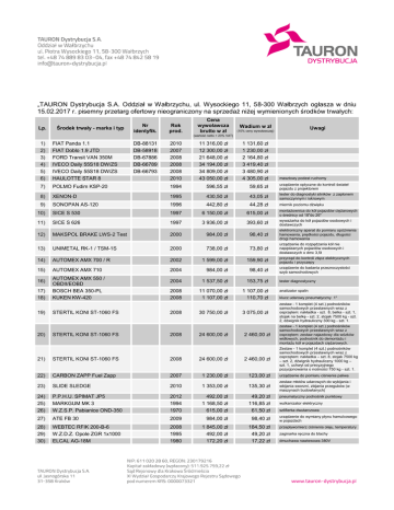 „TAURON Dystrybucja S.A. Oddział w Wałbrzychu, ul. Wysockiego 11, 58-300 Wałbrzych ogłasza w dniu 15.02.2017 r. pisemny przetarg ofertowy nieograniczony na sprzedaż niżej wymienionych środków trwałych: Lp. Środek trwały - marka i typ Nr identyfik. Rok prod. Cena wywoławcza brutto w zł Wadium w zł Uwagi (10% ceny wywoławczej) (wartość netto + 23% VAT) 2010 2007 2008 2008 2008 2010 11 316,00 zł 12 300,00 zł 21 648,00 zł 34 194,00 zł 34 809,00 zł 43 050,00 zł 1 131,60 zł 1 230,00 zł 2 164,80 zł 3 419,40 zł 3 480,90 zł 4 305,00 zł POLMO Fudim KSP-20 1994 596,55 zł 59,65 zł urządzenie optyczne do kontroli świateł pojazdu z projektorem 8) XENON-D 1995 430,50 zł 43,05 zł tester do diagnostyki silników z zapłonem samoczynnym i iskrowym 9) miernik poziomu dźwięku 1) 2) 3) 4) 5) 6) FIAT Panda 1.1 FIAT Doblo 1.9 JTD FORD Transit VAN 350M IVECO Daily 55S18 DW/ZS IVECO Daily 55S18 DW/ZS HAULOTTE STAR 8 7) DB-88131 DB-58918 DB-67886 DB-66789 DB-66793 masztowy podest ruchomy SONOPAN AS-120 1996 442,80 zł 44,28 zł 10) SICE S 530 1997 6 150,00 zł 615,00 zł montażownica do kół pojazdów ciężarowych o średnicy od 18"do 26" 11) SICE S 626 1997 3 936,00 zł 393,60 zł wyważarka do kół pojazdów osobowych i dostawczych 12) MAKSPOL BRAKE LWS-2 Test 2000 984,00 zł 98,40 zł elektroniczny aparat do pomiaru opóźnienia hamowania, prędkości pojazdu, długości drogi hamowania 13) UNIMETAL RK-1 / TSM-1S 2000 738,00 zł 73,80 zł urządzenie do rozpędzania kół nie napędzanych pojazdów osobowych i dostawczych o dmc 3,5t 14) AUTOMEX AMX 700 / R 2002 1 599,00 zł 159,90 zł przyrząd do kontroli złącz elektrycznych pojazdu i przyczepy 15) AUTOMEX AMX 710 2004 984,00 zł 98,40 zł urządzenie do badania przezroczystości szyb samochodowych 2004 1 537,50 zł 153,75 zł 2008 2008 11 070,00 zł 1 107,00 zł 1 107,00 zł 110,70 zł 3 075,00 zł 17) 18) AUTOMEX AMX 550 / OBDII/EOBD BOSCH BEA 350-PL KUKEN KW-420 19) STERTIL KONI ST-1060 FS 2008 30 750,00 zł 20) STERTIL KONI ST-1060 FS 2008 24 600,00 zł 16) tester diagnostyczny analizator spalin klucz udarowy pneumatyczny 1" zestaw - 1 komplet (4 szt.) podnośników samochodowych przestawnych wraz z osprzętem: nakładka - szt. 8, belka - szt. 1, stojak na belkę - szt. 2, stojak 7500 kg - szt. 2, dźwignik hydrauliczny 300 kg - szt. 1. 2 460,00 zł zestaw - 1 komplet (4 szt.) podnośników samochodowych przestawnych wraz z osprzętem: zestaw najazdowy dla wózków widłowych, podnośnik do demontażu i montażu kół w pojazdach ciężarowych. Zestaw - 1 komplet (4 szt.) podnośników samochodowych przestawnych wraz z osprzętem: nakładka – szt. 8, stojak 7500 kg – szt. 2, dźwignik hydrauliczny 1000 kg – szt. 1, uchwyt od precyzyjnego pozycjonowania o nośności 750 kg - szt. 1. 21) STERTIL KONI ST-1060 FS 2008 24 600,00 zł 2 460,00 zł 22) CARBON ZAPP Fuel Zapp 2007 1 230,00 zł 123,00 zł urządzenie do pomiaru ciśnienia paliwa 23) SLIDE SLEDGE 2010 1 353,00 zł 135,30 zł zestaw młotów udarowych do wybijania i wbijania sworzni, zbijania przegubów (w maszynach budowlanych) 24) 25) 26) P.P.H.U. SPIMAT JP5 MARKGUM MK 3 W.Z.S.P. Pabianice OND-350 2012 1994 1970 492,00 zł 1 168,50 zł 615,00 zł 49,20 zł 116,85 zł 61,50 zł 27) ATE FB 30 2009 984,00 zł 98,40 zł urządzenie do wymiany płynu hamulcowego w pojazdach 28) 29) 30) WEBTEC RFIK 200-B-6 W.Z.D.Z. Opole ZGR 1x1000 ELCAL AG-18M 2008 1995 1980 1 845,00 zł 492,00 zł 172,20 zł 184,50 zł 49,20 zł 17,22 zł przepływomierz ciśnienia oleju, temperatury pneumatyczny podnośnik punktowy wulkanizator elektryczny szlifierka dwutarczowa zaginarka ręczna do blachy dmuchawa nawiewowa 380V Strona 2 z 2 31) 32) 33) ELNA SZ 750/250 PROMA BKS-2500 Lampa LU-12 2x25W 1976 2008 2009 172,20 zł 258,30 zł 123,00 zł 17,22 zł 25,83 zł 12,30 zł szlifierka stołowa 380V szlifierka stołowa dwutarczowa 400V lampa uniwersalna na statywie 1) Sprzedawcą oraz prowadzącym przetarg jest TAURON Dystrybucja S.A. Oddział w Wałbrzychu, 58-300 Wałbrzych, ul. Wysockiego 11. 2) Miejsce i termin przetargu – komisyjne otwarcie ofert nastąpi w dniu 15.02.2017 r. o godz. 900 w sali nr 020/2 „Sala Gdańska” w budynku Dyrekcji TAURON Dystrybucja S.A. Oddział w Wałbrzychu przy ul. Wysockiego 11. 3) Bliższych informacji na temat ww. środków trwałych udzielają upoważnieni pracownicy Oddziału w Wałbrzychu pod nr tel. 74 8428582 lub 74 8428587. Środki trwałe można oglądać w Dziale Transportu w Wałbrzychu, ul. Wysockiego 11, do dnia 13.02.2017 r. do godz. 1400. 4) W przetargu mogą wziąć udział osoby fizyczne, prawne i jednostki organizacyjne nieposiadające osobowości prawnej, które wpłacą na rachunek bankowy o nr 97 1140 1078 0000 4077 4900 2001 prowadzony w banku mBank - oddzielnie na każdy wybrany środek trwały - wadium w wysokości podanej w tabeli. Termin wpłaty wadium upływa w dniu 13.02.2017 r. Za datę wpływu wadium uważa się datę wpływu środków na rachunek bankowy sprzedawcy. 5) Oferta pisemna powinna zawierać co najmniej następujące informacje i dokumenty: a. imię i nazwisko lub nazwę oferenta, adres, datę sporządzenia oferty, b. Lp. z tabeli, nazwę środka trwałego oraz oferowaną cenę nabycia równą lub przewyższającą cenę wywoławczą, c. nr rachunku bankowego, na który powinno zostać zwrócone wadium w przypadku nie przyjęcia oferty lub odwołania przetargu, d. nr telefonu do kontaktu, e. oświadczenie oferenta, że zapoznał się z przedmiotem oraz warunkami pisemnego przetargu i nie wnosi do nich zastrzeżeń, f. czytelny podpis osoby uprawnionej lub pieczęć imienną z podpisem osoby uprawnionej, g. potwierdzenie wpłaty wadium (oryginał lub kopia potwierdzona za zgodność z oryginałem), h. w przypadku osób prawnych - aktualny wypis z właściwego dla danego podmiotu rejestru (oryginał lub kopia potwierdzona za zgodność z oryginałem). 6) Ofertę pisemną umieszczoną w zamkniętej koper