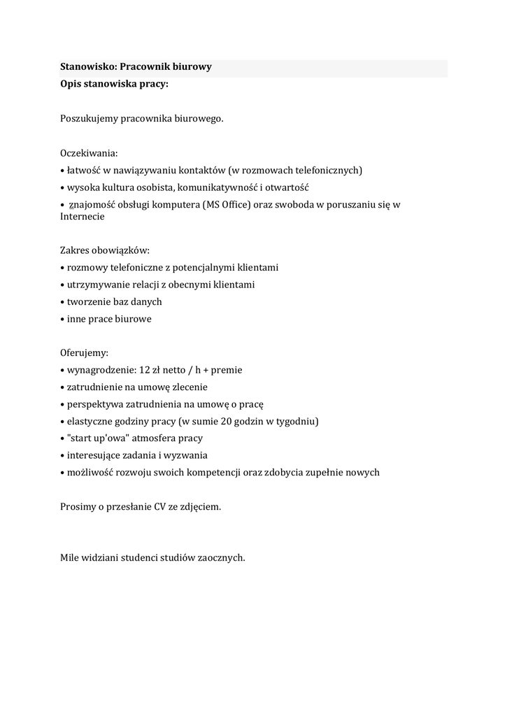 Stanowisko: Pracownik biurowy Opis stanowiska pracy: Poszukujemy pracownika biurowego. Oczekiwania: • łatwość w nawiązywaniu kontaktów (w rozmowach telefonicznych) • wysoka kultura osobista, komunikatywność i otwartość • znajomość obsługi komputera (MS Office) oraz swoboda w poruszaniu się w Internecie Zakres obowiązków: • rozmowy telefoniczne z potencjalnymi klientami • utrzymywanie relacji z obecnymi klientami • tworzenie baz danych • inne prace biurowe Oferujemy: • wynagrodzenie: 12 zł netto / h + premie • zatrudnienie na umowę zlecenie • perspektywa zatrudnienia na umowę o pracę • elastyczne godziny pracy (w sumie 20 godzin w tygodniu) • "start up'owa" atmosfera pracy • interesujące zadania i wyzwania • możliwość rozwoju swoich kompetencji oraz zdobycia zupełnie nowych Prosimy o przesłanie CV ze zdjęciem. Mile widziani studenci studiów zaocznych.