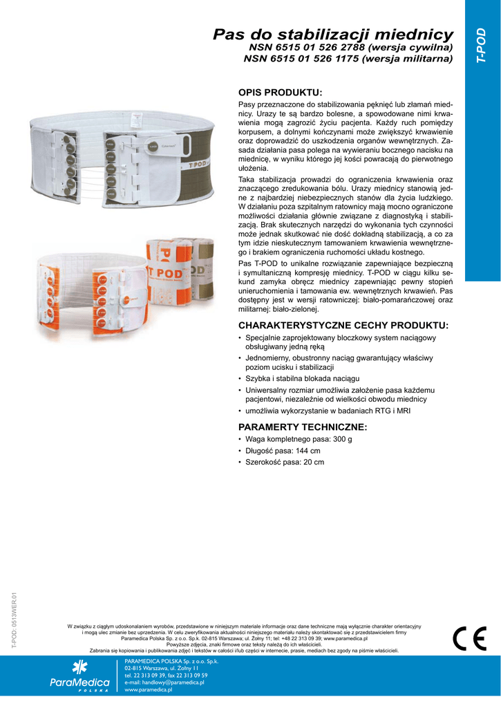 NSN 6515 01 526 2788 (wersja cywilna) NSN 6515 01 526 1175 (wersja militarna) OPIS PRODUKTU: Pasy przeznaczone do stabilizowania pęknięć lub złamań miednicy. Urazy te są bardzo bolesne, a spowodowane nimi krwawienia mogą zagrozić życiu pacjenta. Każdy ruch pomiędzy korpusem, a dolnymi kończynami może zwiększyć krwawienie oraz doprowadzić do uszkodzenia organów wewnętrznych. Zasada działania pasa polega na wywieraniu bocznego nacisku na miednicę, w wyniku którego jej kości powracają do pierwotnego ułożenia. Taka stabilizacja prowadzi do ograniczenia krwawienia oraz znaczącego zredukowania bólu. Urazy miednicy stanowią jedne z najbardziej niebezpiecznych stanów dla życia ludzkiego. W działaniu poza szpitalnym ratownicy mają mocno ograniczone możliwości działania głównie związane z diagnostyką i stabilizacją. Brak skutecznych narzędzi do wykonania tych czynności może jednak skutkować nie dość dokładną stabilizacją, a co za tym idzie nieskutecznym tamowaniem krwawienia wewnętrznego i brakiem ograniczenia ruchomości układu kostnego. Pas T-POD to unikalne rozwiązanie zapewniające bezpieczną i symultaniczną kompresję miednicy. T-POD w ciągu kilku sekund zamyka obręcz miednicy zapewniając pewny stopień unieruchomienia i tamowania ew. wewnętrznych krwawień. Pas dostępny jest w wersji ratowniczej: biało-pomarańczowej oraz militarnej: biało-zielonej. CHARAKTERYSTYCZNE CECHY PRODUKTU: • Specjalnie zaprojektowany bloczkowy system naciągowy obsługiwany jedną ręką • Jednomierny, obustronny naciąg gwarantujący właściwy poziom ucisku i stabilizacji • Szybka i stabilna blokada naciągu • Uniwersalny rozmiar umożliwia założenie pasa każdemu pacjentowi, niezależnie od wielkości obwodu miednicy • umożliwia wykorzystanie w badaniach RTG i MRI PARAMERTY TECHNICZNE: • Waga kompletnego pasa: 300 g • Długość pasa: 144 cm T-POD: 0513WER.01 • Szerokość pasa: 20 cm W związku z ciągłym udoskonalaniem wyrobów, przedstawione w niniejszym materiale informacje oraz dane techniczne mają wyłącznie charakter orientacyjny i mogą ulec zmianie bez uprzedzenia. W celu zweryfikowania aktualności niniejszego materiału należy skontaktować się z przedstawicielem firmy Paramedica Polska Sp. z o.o. Sp.k. 02-815 Warszawa; ul. Żołny 11; tel: +48 22 313 09 39; www.paramedica.pl Powyższe zdjęcia, znaki firmowe oraz teksty należą do ich właścicieli. Zabrania się kopiowania i publikowania zdjęć i tekstów w całości i/lub części w internecie, prasie, mediach bez zgody na piśmie właścicieli. PARAMEDICA POLSKA Sp. z o.o. Sp.k. 02-815 Warszawa, ul. Żołny 11 tel. 22 313 09 39, fax 22 313 09 59 e-mail: [email protected] www.paramedica.pl T-POD Pas do stabilizacji miednicy