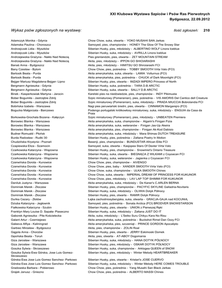 XXI Klubowa Wystawa Szpiców i Psów Ras Pierwotnych Bydgoszcz, 22.09.2012 Wykaz psów zgłoszonych na wystawę: Ilość zgłoszeń: Adamczyk Monika - Gdynia Chow Chow, suka, otwarta - YOKO MUSAHI SAN Jarkas Adamska Paulina - Choroszcz Andrzejczak Lidia - Myszków Samoyed, pies, championów - HONEY The Glow Of The Snowy Star Siberian Husky, pies, młodzieży - ALBERTINO WOLF Linora Iceblue Andrzejczak Lidia - Myszków Siberian Husky, suka, młodzieży - AVRILLA Linora Iceblue Andrzejewska Grażyna - Nakło Nad Notecią Andrzejewska Grażyna - Nakło Nad Notecią Pies grenlandzki, pies, otwarta - ZET MOUNTAIN STREAM Akita, pies, młodzieży - IPPON GO SHIOIARASHI 210 Banaś Anna - Bydgoszcz Akita, pies, młodzieży - HIMITSU GO Shiroiarashi FCI Bany Czesław - Bytom Bartosik Beata - Purda Chow Chow, pies, pośrednia - TOBBY SMOOTH Virta Valo (FCI) Akita amerykańska, suka, otwarta - LAMIA Volturnus (FCI) Bartosik Beata - Purda Akita amerykańska, pies, pośrednia - CHUCK of Dark Moonlight (FCI) Bejger Mariusz Magdalena Bejger- Lipno Bergmann Agnieszka - Gdynia Siberian Husky, pies, otwarta - IMZADI IMPERO Princess of North Siberian Husky, suka, pośrednia - TARA D.B ARCTIC Bergmann Agnieszka - Gdynia Siberian Husky, suka, otwarta - SALLY D.B ARCTIC Binek - Kasperkowiak Martyna - Jarocin Bober Bogumiła - Jastrzębie Zdrój Karelski pies na niedźwiedzie, pies, championów - INDY Pikimusta Szpic miniaturowy (Pomeranian), pies, pośrednia - VIS AMORIS Del Cantico dell Creature Bober Bogumiła - Jastrzębie Zdrój Szpic miniaturowy (Pomeranian), suka, młodzieży - PRADA MIUCCIA Bobrolandia FCI Bobińska Izabela - Warszawa Bogucka Małgorzata - Barczewo Borowiec Blanka - Warszawa Nagi pies peruwiański średni, pies, otwarta - CINNAMON Margarejro (FCI) Podengo portugalski krótkowłosy miniaturowy, suka, młodzieży - ENGUIA da Casa da Praia Szpic miniaturowy (Pomeranian), pies, młodzieży - UNBEATEN Premiera Akita amerykańska, suka, championów - Algarin's Finigan Fizia Borowiec Blanka - Warszawa Borowiec Blanka - Warszawa Budner Romuald - Płońsk Akita amerykańska, suka, weteranów - Finigan Jas-Up Akeira Akita amerykańska, pies, championów - Finigan Ak-Kod Dabisio Akita amerykańska, suka, młodzieży - Mara Shimas DUTCH TREASURE Burda Radosław - Rudki 30 Chudzińska Krystyna - Poznań Czapiewska Eliza - Szamocin Siberian Husky, pies, pośrednia - Zaltana Poetry In Motion Basenji, pies, championów - BUNDUSTAR African Elite FCI Samoyed, suka, otwarta - Kasjopea Stars Of Dexter Virta Valo Czarkowska Katarzyna - Wiązowna Czarkowska Katarzyna - Wiązowna Czarkowska Katarzyna - Wiązowna Siberian Husky, pies, championów - Snowmist's Ontario Treasure Siberian Husky, suka, otwarta - BIEGNĄCA Z WILKAMI z Coyoacan FCI Siberian Husky, suka, weteranów - Jagienka z Coyoacan FCI Czerwińska Dorota - Kunowice Czerwińska Dorota - Kunowice Czerwińska Dorota - Kunowice Czerwińska Dorota - Kunowice Czerwińska Dorota - Kunowice Daniluk Justyna - Warszawa Dominiak Marek - Złoczew Dominiak Marek - Złoczew Dominiak Marek - Złoczew Duńka Cezary - Złotów Chow Chow, pies, championów - AIVENGO Chow Chow, pies, baby - XANDER SMOOTH Virta Valo (FCI) Chow Chow, suka, championów - ULKA SMOOTH Chines Chow Chow, suka, otwarta - IMPERIAL DREAM OF PRINCESS FOR KUKUNOR Chow Chow, pies, młodzieży - LAV LAP TOP SHIMMI FOR KUKUNOR Akita amerykańska, suka, młodzieży - De Kaner's C.ARLEN BERNA Siberian Husky, pies, championów - PACYFIC SKYLINE Galladria-Novitaris Siberian Husky, suka, młodzieży - OLIWIA Dotyk Północy Siberian Husky, pies, otwarta - RAMIR Dotyk Północy Łajka zachodniosyberyjska, suka, otwarta - GRACJA-GAJA nad KOCUNIĄ Dziuba Katarzyna - Jegłownik Fiałkowska Katarzyna - Szubin Franklyn Mary Louise D. Sapała- Piaseczno Gaborek Agnieszka - Piła Kościelecka Galant Artur - Czerniejewo Galeeva Alfiya - Kaliningrad Garbiec Mirosław - Bydgoszcz Gągola Anna - Chorzów Gęsińska Beata - Toruń Giza Jarosław - Warszawa Giza Jarosław - Warszawa Goszka Sylwia - Skrzeszewo Goszka Sylwia Ewa Górska, Jose Luis GomezSkrzeszewo Górska Ewa Jose Luis Gomez Sanchez- Parkowo Górska Ewa Jose Luis Gomez Sanchez- Parkowo Gradowska Barbara - Pobierowo Grajek Janusz - Gniezno Samoyed, pies, pośrednia - Sonata Arctica (FCI) BRODVER SNOWSTARSON Siberian Husky, pies, otwarta - UNION z Pierwszej Ręki Siberian Husky, suka, młodzieży - Zaltana JUST DO IT Akita, suka, młodzieży - L'Seiko Suru Chikyu Kara No Risu Akita amerykańska, suka, pośrednia - Buckshot Rimel Dan Ozzy FCI Akita amerykańska, pies, szczeniąt - PRINCE GORDON Apocalipto Akita, pies, championów - ZOLIN Roal Siberian Husky, pies, otwarta - JERRY Eskimoski Domek Akita, pies, otwarta - AT-ABOY Dogomania Siberian Husky, suka, młodzieży - HANA DOTYK PÓŁNOCY Siberian Husky, pies, młodzieży - OSKAR DOTYK PÓŁNOCY Siberian Husky, suka, championów - Arktogea QUEEN of SNOW Siberian Husky, pies, młodzieży - Winter Melody HEARTBREAKER Borkowska-Grochala Bozena - Kałęczyn Siberian Husky, pies, otwarta - Kristari's JOSE CUERVO Siberian Husky, suka, młodzieży - Winter Melody HERE COMES TROUBLE Chow Chow, pies, pośrednia - Yang Musahi San Black Jarkas Chow Chow, pies, pośrednia - ALBERTO MASSI Chines Groszek-Szymańska Joanna - Warszawa Basenji, pies, championów - JAZZY BOY Asiaczek FCI Groszek-Szymańska Joanna - Warszawa Groszek-Szymańska Joanna - Warszawa Basenji, suka, otwarta - JELLY JOSHREEN Asiaczek FCI Basenji, suka, championów - LOVE IS IN THE AIR Asiaczek FCI Groszek-Szymańska Joanna - Warszawa Basenji, suka, pośrednia - RED ROSE Asiaczek FCI Groszek-Szymańska Joanna - Warszawa Groszek-Szymańska Joanna - Warszawa Basenji, suka, weteranów - FELMERIA FOR CHRISTMAS EVE Asiaczek FCI Basenji, pies, otwarta - Kanibaru FROMAJE FRAIS Hanke Barbara - Ciechocinek Chow Chow, pies, otwarta - MORAN Virta Valo FCI Harasimowicz Patryk - Malbork Imparato Teresa - Warszawa Akita, pies, baby - YOSHIMITSU GO Akogareno F