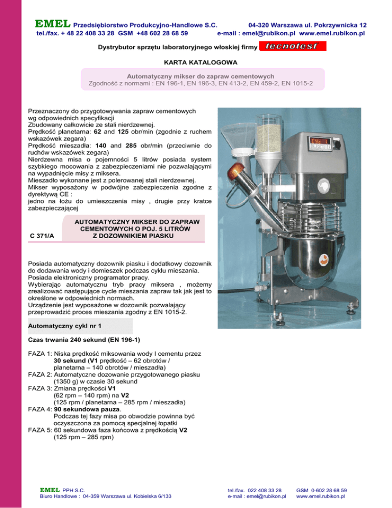 EMEL Przedsiębiorstwo Produkcyjno-Handlowe S.C. tel./fax. + 48 22 408 33 28 GSM +48 602 28 68 59 04-320 Warszawa ul. Pokrzywnicka 12 e-mail : [email protected] www.emel.rubikon.pl Dystrybutor sprzętu laboratoryjnego włoskiej firmy KARTA KATALOGOWA Automatyczny mikser do zapraw cementowych Zgodność z normami : EN 196-1, EN 196-3, EN 413-2, EN 459-2, EN 1015-2 Przeznaczony do przygotowywania zapraw cementowych wg odpowiednich specyfikacji Zbudowany całkowicie ze stali nierdzewnej. Prędkość planetarna: 62 and 125 obr/min (zgodnie z ruchem wskazówek zegara) Prędkość mieszadła: 140 and 285 obr/min (przeciwnie do ruchów wskazówek zegara) Nierdzewna misa o pojemności 5 litrów posiada system szybkiego mocowania z zabezpieczeniami nie pozwalającymi na wypadnięcie misy z miksera. Mieszadło wykonane jest z polerowanej stali nierdzewnej. Mikser wyposażony w podwójne zabezpieczenia zgodne z dyrektywą CE : jedno na łożu do umieszczenia misy , drugie przy kratce zabezpieczającej C 371/A AUTOMATYCZNY MIKSER DO ZAPRAW CEMENTOWYCH O POJ. 5 LITRÓW Z DOZOWNIKIEM PIASKU Posiada automatyczny dozownik piasku i dodatkowy dozownik do dodawania wody i domieszek podczas cyklu mieszania. Posiada elektroniczny programator pracy. Wybierając automatycznu tryb pracy miksera , możemy zrealizować następujące cycle mieszania zapraw tak jak jest to określone w odpowiednich normach. Urządzenie jest wyposażone w dozownik pozwalający przeprowadzić proces mieszania zgodny z EN 1015-2. Automatyczny cykl nr 1 Czas trwania 240 sekund (EN 196-1) FAZA 1: Niska prędkość miksowania wody I cementu przez 30 sekund (V1 prędkość – 62 obrotów / planetarna – 140 obrotów / mieszadła) FAZA 2: Automatyczne dozowanie przygotowanego piasku (1350 g) w czasie 30 sekund FAZA 3: Zmiana prędkości V1 (62 rpm – 140 rpm) na V2 (125 rpm / planetarna – 285 rpm / mieszadła) FAZA 4: 90 sekundowa pauza. Podczas tej fazy misa po obwodzie powinna być oczyszczona za pomocą specjalnej łopatki FAZA 5: 60 sekundowa faza końcowa z prędkością V2 (125 rpm – 285 rpm) EMEL PPH S.C. Biuro Handlowe : 04-359 Warszawa ul. Kobielska 6/133 tel./fax. 022 408 33 28 e-mail : [email protected] GSM 0-602 28 68 59 www.emel.rubikon.pl EMEL Przedsiębiorstwo Produkcyjno-Handlowe S.C. tel./fax. + 48 22 408 33 28 GSM +48 602 28 68 59 04-320 Warszawa ul. Pokrzywnicka 12 e-mail : [email protected] www.emel.rubikon.pl Dystrybutor sprzętu laboratoryjnego włoskiej firmy Automatycznu cykl nr 2 Czas trwania 195 sekund (EN 196-3) FAZA 1: Niska prędkość miksowania przez 90 sekund (V1 prędkość – 62 obrotów / planetarna – 140 obrotów / mieszadła) FAZA 2: 15 sekundowa pauza. Podczas tej fazy misa po obwodzie powinna być oczyszczona za pomocą specjalnej łopatki FAZA 3: 90 sekundowa faza końcowa z prędkością V1 (62 rpm – 140 rpm) Na wyświetlaczu programatora podczas pracy wyświetlane są informacje informujące o kolejnej fazie (F1..F5), czas, prędkość (V1, V2), status dozownika (D) i ostrzeżenia (!). Po zakończeniu procesu mieszania mikser zatrzymuje się automatycznie i na wyświetlaczu pojawia się napis „END”. Urządzenie przystosowane jest również do przeprowadzania procesów mieszania całkowicie manualnie (MAN). Zasilanie: 220 V, 50 Hz, jednofazowe, 500 W Wymiary: 500 x 500 x 540 (h) mm. Waga : 38 kg Akcesoria i części zapasowe : C 371/T Szpatuła plastikowa C 371/B Misa ze stali nierdzewnej o pojemności 5 l. C 371/P Mieszadło z polerowanej stali nierdzewnej EN 196-1 C 364/S1 Piasek referencyjny zgodny z EN 196- C 371/P EMEL C 371/T PPH S.C. Biuro Handlowe : 04-359 Warszawa ul. Kobielska 6/133 C 371/B C 364/S1 tel./fax. 022 408 33 28 e-mail : [email protected] GSM 0-602 28 68 59 www.emel.rubikon.pl