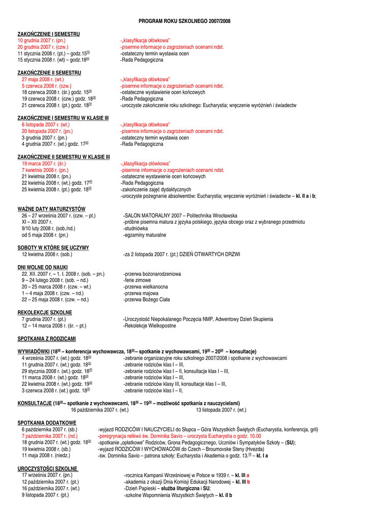 PROGRAM ROKU SZKOLNEGO 2007/2008 ZAKOŃCZENIE I SEMESTRU 10 grudnia 2007 r. (pn.) 20 grudnia 2007 r. (czw.) 11 stycznia 2008 r. (pt.) – godz.1500 15 stycznia 2008 r. (wt) – godz.1800 -„klasyfikacja ołówkowa” -pisemne informacje o zagrożeniach ocenami ndst. -ostateczny termin wystawia ocen -Rada Pedagogiczna ZAKOŃCZENIE II SEMESTRU 27 maja 2008 r. (wt.) 5 czerwca 2008 r. (czw.) 18 czerwca 2008 r. (śr.) godz. 1500 19 czerwca 2008 r. (czw.) godz. 1800 21 czerwca 2008 r. (pt.) godz. 1800 -„klasyfikacja ołówkowa” -pisemne informacje o zagrożeniach ocenami ndst. -ostateczne wystawienie ocen końcowych -Rada Pedagogiczna -uroczyste zakończenie roku szkolnego: Eucharystia; wręczenie wyróżnień i świadectw ZAKOŃCZENIE I SEMESTRU W KLASIE III 6 listopada 2007 r. (wt.) 20 listopada 2007 r. (pn.) 3 grudnia 2007 r. (pn.) 4 grudnia 2007 r. (wt.) godz. 1700 -„klasyfikacja ołówkowa” -pisemne informacje o zagrożeniach ocenami ndst. -ostateczny termin wystawia ocen -Rada Pedagogiczna ZAKOŃCZENIE II SEMESTRU W KLASIE III 19 marca 2007 r. (śr.) 7 kwietnia 2008 r. (pn.) 21 kwietnia 2008 r. (pn.) 22 kwietnia 2008 r. (wt.) godz. 1700 25 kwietnia 2008 r. (pt.) godz. 1800 -„klasyfikacja ołówkowa” -pisemne informacje o zagrożeniach ocenami ndst. -ostateczne wystawienie ocen końcowych -Rada Pedagogiczna -zakończenie zajęć dydaktycznych -uroczyste pożegnanie absolwentów: Eucharystia; wręczenie wyróżnień i świadectw – kl. II a i b; WAŻNE DATY MATURZYSTÓW 26 – 27 września 2007 r. (czw. – pt.) XI – XII 2007 r. 9/10 luty 2008 r. (sob./nd.) od 5 maja 2008 r. (pn.) -SALON MATORALNY 2007 – Politechnika Wrocławska -próbne pisemna matura z języka polskiego, języka obcego oraz z wybranego przedmiotu -studniówka -egzaminy maturalne SOBOTY W KTÓRE SIĘ UCZYMY 12 kwietna 2008 r. (sob.) -za 2 listopada 2007 r. (pt.) DZIEŃ OTWARTYCH DRZWI DNI WOLNE OD NAUKI 22. XII. 2007 r. – 1. I. 2008 r. (sob. – pn.) 9 – 24 lutego 2008 r. (sob. – nd.) 20 – 25 marca 2008 r. (czw. – wt.) 1 – 4 maja 2008 r. (czw. – nd.) 22 – 25 maja 2008 r. (czw. – nd.) -przerwa bożonarodzeniowa -ferie zimowe -przerwa wielkanocna -przerwa majowa -przerwa Bożego Ciała REKOLEKCJE SZKOLNE 7 grudnia 2007 r. (pt.) 12 – 14 marca 2008 r. (śr. – pt.) -Uroczystość Niepokalanego Poczęcia NMP, Adwentowy Dzień Skupienia -Rekolekcje Wielkopostne SPOTKANIA Z RODZICAMI WYWIADÓWKI (1800 – konferencja wychowawcza, 1830 – spotkanie z wychowawcami, 1900 – 2000 – konsultacje) 4 września 2007 r. (wt.) godz. 1800 -zebranie organizacyjne roku szkolnego 2007/2008 i spotkanie z wychowawcami 11 grudnia 2007 r. (wt.) godz. 1800 -zebranie rodziców klas I – III, 29 stycznia 2008 r. (wt.) godz. 1800 -zebranie rodziców klas I – II, konsultacje klas I – III, 11 marca 2008 r. (wt.) godz. 1800 -zebranie rodziców klas I – III, 22 kwietnia 2008 r. (wt.) godz. 1900 -zebranie rodziców klasy III, konsultacje klas I – III, 3 czerwca 2008 r. (wt.) godz. 1800 -zebranie rodziców klas I – II, KONSULTACJE (1830 – spotkanie z wychowawcami, 1830 – 1930 – możliwość spotkania z nauczycielami) 16 października 2007 r. (wt.) 13 listopada 2007 r. (wt.) SPOTKANIA DODATKOWE 6 października 2007 r. (sb.) 7 października 2007 r. (nd.) 18 grudnia 2007 r. (wt.) godz. 1800 19 kwietnia 2008 r. (sb.) 11 maja 2008 r. (niedz.) UROCZYSTOŚCI SZKOLNE 17 września 2007 r. (pn.) 12 października 2007 r. (pt.) 16 października 2007 r. (wt.) 9 listopada 2007 r. (pt.) -wyjazd RODZICÓW I NAUCZYCIELI do Słupca – Góra Wszystkich Świętych (Eucharystia, konferencja, gril) -peregrynacja relikwii św. Dominika Savio – uroczysta Eucharystia o godz. 10.00 -spotkanie „opłatkowe” Rodziców, Grona Pedagogicznego, Uczniów i Sympatyków Szkoły – (SU); -wyjazd RODZICÓW I WYCHOWACÓW do Czech – Broumovske Steny (Hvezda) -św. Dominika Savio – patrona szkoły: Eucharystia i Akademia o godz. 13.00 – kl. I a -rocznica Kampanii Wrześniowej w Polsce w 1939 r. – kl. III a -akademia z okazji Dnia Komisji Edukacji Narodowej – kl. III b -Dzień Papieski – służba liturgiczna i SU; -szkolne Wspomnienia Wszystkich Świętych – kl. II b 12 listopada 2007 r. (pt.) 7 grudnia 2007 r. (pt.) 13 grudnia 2007 r. (czw.) 18 grudnia 2007 r. (wt.) godz. 1800 31 stycznia 2008 r. (czw.) 7 marca 2008 r. (pt.) 23 kwietnia 2008 r. (śr.) 25 kwietnia 2008 r. (pt.) godz. 1800 30 kwietnia 2008 r. (śr.) 8 maja 2008 r. (czw.) 11 maja 2008 r. (niedz.) 21 maja 2008 r. (śr.) 26 maja 2008 r. (pn.) godz. 1800 -akademia z okazji Święta Niepodległości – kl. I a -uroczystość Niepokalanego Poczęcia NMP – kl. I b -rocznica wprowadzenia Stanu Wojennego – kl. II a -„Opłatek” dla Rodziców, zaproszonych Gości i Uczniów – SU -uroczystość św. Jana Bosko Akademia – kl. II b -VI Między szkolny Konkurs Karaoke – FINAŁ -Dzień Kobiet apel – kl. II a -imieniny ks. Dyrektora – SU -uroczyste pożegnanie absolwentów: Eucharystia; wręczenie wyróżnień i świadectw – kl. II a i kl. II b -rocznica uchwalenia Konstytucji 3-go maja – kl. I b -Dzień Zjednoczonej Europy – klub europejski -św. Dominika Savio – patrona szkoły: Eucharystia i Akademia o gdz. 13.00 – kl. II a -Matki Bożej Wspomożycielki Wiernych – Spotkanie Szkół Salezjańskich w Gimnazjum -Dzień Matki Eucharystia i Akademia – kl. I a IMPREZY SZKOLNE 7 września 2007 r. (pt.) 8 września 2007 r. (sb.) godz. 800 14 września 2007 r. (pt.) 13 października 2007r. (sb.) 27 października 2007 r. (sb.) 6 grudnia 2007 r. (czw.) 14 grudnia 2007 r. (pt.) godz. 13.30 5 stycznia 2008 r. (sb.) 21–25 stycznia 2008r. (pn. – pt.) 31 stycznia 2008 r. (czw.) godz. 13.30 9/10 lutego 2008 r. (sob./nd.) 12 kwietnia 2008 r. (sb) 17–18 maja 2008 r. (sob. – nd.) -KIERMASZ PODRĘCZNIKÓW SZKOLNYCH -Rajd Rowerowy SKKT -Szkolna Pielgrzymka do Barda Śląskiego -piesza Pielgrzymka do Trzebnicy -XVII Dziecięcy Festiwal Piosenki Rel