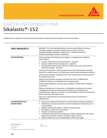 KARTA INFORMACYJNA Sikalastic®‐152 Szybkosprawna zaprawa cementowa do wykonywania elastycznych hydroizolacji oraz ochrony betonu OPIS PRODUKTU Sikalastic®‐152 jest dwuskładnikową, wzmocnioną włóknami zaprawą charakteryzującą się wysoką elastycznością na bazie cementu modyfikowanego specjalnymi odpornymi na alkalia polimerami, selekcjonowanego kruszywa i dodatków. ZASTOSOWANIE Ochrona powierzchni betonowych zgodnie z następującymi zasadami wg EN 1504‐9 Zasada 1 (PI) Ochrona przed wnikaniem ‐ powłoka Zasada 2 (MC) Kontrola zawilgocenia ‐ powłoka Zasada 8 (IR) Podwyższenie oporności elektrycznej przez ograniczenie zawartości wilgoci ‐ powłoka Izolacja przeciwwodna i zabezpieczenie konstrukcji obciążonych wodą jak: zbiorniki na wodę, baseny, rury betonowe, kanały odprowadzające wodę itp. Izolacja przeciwwodna i zabezpieczenie ścian zewnętrznych przeznaczonych do zasypania gruntem Izolacja przeciwwodna wewnątrz pomieszczeń ścian i podłóg piwnic poddanych działaniu niewielkiego parcia negatywnego Hydroizolacja balkonów i tarasów, gdzie podłoże stanowi beton lub płytki ceramiczne Ochrona zewnętrznych narażonych na obciążenia atmosferyczne nowych i istniejących powierzchni betonowych elastyczną, chroniącą przed karbonatyzacją, odporna na chlorki i siarczki powłoką, także do uszczelnienia powierzchni zarysowanego betonu Elastyczne zabezpieczenie elementów betonowych narażonych na odkształcenia CHARAKTERYSTYKA / WŁAŚCIWOŚCI Elastyczna izolacja przeciwwodna i ochrona betony jednym produktem Możliwość nanoszenia zarówno w bardzo wilgotnym środowisku jak i na suche podłoża Szybkie utwardzanie (także w niskich temperaturach) Nie spływa z powierzchni pionowych Przenosi zarysowania podłoża Doskonała przyczepność do większości podłoży budowlanych jak: beton, zaprawy cementowe, kamień, ceramika, cegła i drewno Wysoka odporność na sole odladzające i dwutlenek węgla Karta Informacyjna Polski Sikalastic®‐152 18.10.2016 Hydroizolacje Nr identyfikacyjny 02 07 01 07 002 0 000043 1/5 APROBATY / NORMY Badania na oznakowanie CE zgodnie z PN‐EN 1504‐2 DANE PRODUKTU POSTAĆ / BARWA Szara OPAKOWANIA Składnik A (ciecz zarobowa): Składnik B (proszek): pojemnik 8 kg worek 25 kg SKŁADOWANIE 12 miesięcy od daty produkcji. WARUNKI SKŁADOWANIA Składowanie w oryginalnym, szczelnym i nieuszkodzonym opakowaniu w chłodnych i suchych warunkach przy temperaturach pomiędzy +5°C a +25°C. DANE TECHNICZNE BAZA CHEMICZNA Cement modyfikowany polimerami, specjalne kruszywo, mikrokrzemionka i włókna GĘSTOŚĆ 1,8 kg/dm3 (świeżej zaprawy) UZIARNIENIE Dmax: 0.5 mm GRUBOŚĆ WARSTWY Do uzyskania efektywnej izolacji przeciwwodnej: łącznie 3 ‐ 4 mm (maksimum 2 mm na warstwę) W przypadku stosowania jako warstwa izolacyjna na tarasach i balkonach pod okładziny ceramiczne: jedna warstwa o grubości 2 mm PENETRACJA WODY POD WPŁYWEM CIŚNIENIA HYDROSTATYCZNEGO Pozytywne parcie: przy ciśnieniu 0,7 MPa brak absorpcji negatywne parcie: przy ciśnieniu 0,1 MPa brak wycieków WYMAGANIA DLA NORMY PN‐EN 1504‐2:2004 Metoda badania Wynik (wg DIN 1048) Wymagania Przepuszczalność CO2 EN 1062‐6 SD = 50 m SD ≥ 50 Przepuszczalność pary wodnej EN ISO 7783 SD = ~1,0 m (Klasa I) Klasa I SD < 5 m (przepuszczalne) Klasa II 5 m < SD < 50 m Klasa III SD > 50 m (nieprzepuszczelna) Absorpcja kapilarna i przepuszczalność wody ~1,3 N/mm² ≥ 0,80 N/mm² Przyczepność przy odrywaniu EN 1542 ~1,5 N/mm² ≥ 0,80 N/mm² Zdolność mostkowania rys EN 1062‐7 ~1,25 mm Klasa A3 (+23°C) Zawartość substancji niebezpiecznych (Chrom VI) EN 196‐10 < 2 ppm < 2 ppm Reakcja na ogień EN 13501‐1 A2 Euroklasa Karta Informacyjna Polski Sikalastic®‐152 Hydroizolacje 18.10.2016 Nr identyfikacyjny 02 07 01 07 002 0 000043 2/5 ~0,005 kg m‐2 h0,5 W < 0,1 kg m‐2 h0.5 Cykle zamrażania ‐ EN 13687‐1 rozmrażania z zanurzeniem w roztworze soli odladzającej EN 1062‐3 WYMAGANIA DLA NORMY PN‐EN 14891:2012 Metoda badania Wodoszczelność (1.5 bar przez 7 dni) A.7 Wynik Wymagania brak przecieków brak przecieków Przyczepność początkowa A.6.2 ~1,0 N/mm² ≥ 0,5 N/mm² Przyczepność po zanurzeniu w wodzie A.6.3 ~0,7 N/mm² ≥ 0,5 N/mm² Przyczepność po starzeniu A.6.5 termicznym ~1,8 N/mm² ≥ 0,5 N/mm² Przyczepność po A.6.6 zamarzaniu ‐ rozmarzaniu ~0,6 N/mm² ≥ 0,5 N/mm² Przyczepność po zanurzeniu w wodzie wapiennej A.6.9 ~0,7 N/mm² ≥ 0,5 N/mm² Przyczepność po zanurzeniu w wodzie chlorowanej A.6.7 ~0,9 N/mm² ≥ 0,5 N/mm² Mostkowanie rys kondycjonowanie +23°C A.8.2 ≥ 0,75 mm ≥ 0,75 mm Mostkowanie rys kondycjonowanie ‐20°C A.8.3 ≥ 0,75 mm ≥ 0,75 mm Wyniki uzyskanie dla całkowitego zużycia 5.4 kg/m2 SZCZEGÓŁY APLIKACJI ZUŻYCIE ~ 1.80 kg/m2/mm JAKOŚĆ PODŁOŻA Podłoże musi być suche, mocne, oczyszczone z mleczka cementowego, brudu, pyłu olejów, smarów oraz innych zanieczyszczeń oraz luźnych cząstek. PRZYGOTOWANIE PODŁOŻA Podłoża betonowe należy przygotować mechanicznie np. przez hydromonitoring, śrutowanie lub skuwanie, tak aby usunąć stare powłoki. Płytki ceramiczne należy oczyścić szczotkami drucianymi, przeszlifować i dokładnie odkurzyć. Zaleca się czyszczenie metodami nie powodującymi wibracji oraz uderzeń. Większe ubytki i uszkodzenia powierzchni (raki, wykruszenia krawędzi, otwory po szalunkach) należy naprawić odpowiednią zaprawą z grupy Sika® MonoTop, Sika® Repair lub SikaTop® (zgodnie z Kartą Informacyjną materiału). Aby poprawnie wykonać hydroizolację w zbiornikach basenach, piwnicach pomiędzy podłogą a ścianą należy wykonać opaskę narożną z odpowiedniej zaprawy Sika® jak np. Sika® MonoTop lub SikaTop®. Alternatywa dla opaski jest uszczelnienie styku ściany z podłogą taśmą Sika® SealTape. Dylatacje i nacięcia w betonie, przejścia rur, kabli elektrycznych należy także odpowiednio uszczelnić. Podłoże musi być suche lub