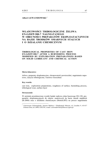 4-2013 TRIBOLOGIA 67 Albert LEWANDOWSKI ∗ WŁAŚCIWOŚCI TRIBOLOGICZNE ŻELIWA EN-GJSFP-500-7 NAGNIATANEGO W OBECNOŚCI PREPARATÓW EKSPLOATACYJNYCH NA BAZIE ŚRODKÓW SMARNYCH STAŁYCH I O DZIAŁANIU CHEMICZNYM TRIBOLOGICAL PROPERTIES OF CAST IRON EN-GJSFP-500-7 AFTER A BURNISHING PROCESS MODIFIED BY EXPLORATION PREPARATIONS BASED ON SOLID LUBRICANT AND CHEMICAL ACTION Słowa kluczowe: żeliwo, preparaty eksploatacyjne, chropowatość powierzchni, nagniatanie naporowe, zużycie tribologiczne, warstwa wierzchnia Key words: cast iron, exploration preparations, roughness of surface, burnishing process, tribological wear, surface layer Streszczenie W artykule przedstawiono wyniki badań wpływu oleju bazowego SN-150, preparatów eksploatacyjnych do olejów smarowych na bazie metali miękkich (R-2000) oraz o działaniu chemicznym (MotorLIFE) na proces nagniatania ∗ Uniwersytet Zielonogórski, Instytut Budowy i Eksploatacji Maszyn, ul. Licealna 9, 65-417 Zielona Góra, tel. (068) 3282336, e-mail: [email protected] 68 TRIBOLOGIA 4-2013 żeliwa EN-GJSFP-500-7 oraz na właściwości tribologiczne węzła tarcia przeciwpróbka brąz CuSi3Zn3Mn/próbka nagniatana żeliwo EN-GJSFP-500-7 smarowanego w procesie tarcia olejem bazowym SN-150. Dla celów porównawczych wykonano nagniatanie na sucho. Badania właściwości tribologicznych wykonano za pomocą testera T-05 typu klocek-rolka. Analiza wyników badań potwierdziła pozytywny wpływ preparatu eksploatacyjnego MotorLIFE na właściwości tribologiczne oraz na poprawę parametru chropowatości powierzchni wg Ra dla próbek nagniatanych na sucho i nagniatanych w obecności oleju bazowego SN-150 oraz preparatu eksploatacyjnego R-2000. WPROWADZENIE Wysokie wymagania eksploatacyjne stawiane częściom maszyn zmuszają do poszukiwania różnych metod obróbki, których celem jest zwiększenie wytrzymałości i trwałości tych części przy równoczesnym zminimalizowaniu kosztów ich wytwarzania. Zwiększenie wytrzymałości i odporności części maszyn na zużycie, a tym samym ich trwałości i niezawodności jest determinowane stanem warstwy wierzchniej (WW). Niewłaściwy stan warstwy wierzchniej wpływa na eksploatację maszyn, a w dalszej kolejności na awarie maszyn. Przyczyną około 95% awarii maszyn jest niewłaściwe przygotowanie WW [L. 6, 7, 8]. Z analizy literatury wynika, że stan WW w decydującym stopniu wpływa na zużycie części maszyn. Ukształtowanie WW zależy od warunków technologicznych wytwarzania wyrobu. Procesy technologiczne powinny być tak projektowane i realizowane, aby nie tylko zapewniały uzyskanie wymaganej dokładności wymiarowo-kształtowej, lecz jednocześnie powodowały powstawanie WW o cechach optymalnych ze względu na właściwości użytkowe wyrobów, a przede wszystkim zapewniały wymaganą odporność na zużycie ścierne i zmęczeniowe [L. 6, 8]. Jedną z metod obróbki spełniającą te wymagania jest obróbka przez zgniot na zimno zwana nagniataniem. Nagniatanie powierzchni części maszyn [L. 1] umożliwia osiągnięcie korzystnych warunków podczas ich eksploatacji. O kształtowaniu własności warstwy wierzchniej podczas nagniatania decydują dwie grupy czynników. Pierwszą grupę stanowią warunki nagniatania, czyli prędkość i posuw rolki nagniatającej, siła nagniatania, liczba przejść oraz zastosowany środek smarowy. Drugą stanowią podstawowe własności warstwy wierzchniej elementu – jego stereometria, mikrotwardość, stan naprężeń, energia powierzchniowa, skład fazowy i struktura, które są kształtowane w całym ciągu obróbki. Podczas obróbki poszczególne własności warstwy wierzchniej pozostają po operacjach poprzedzających. Istnieje związek między zgrubnymi, kształtującymi i wykańczającymi zabiegami obróbki mechanicznej [L. 7, 8]. Współoddziaływanie międzyoperacyjnych zmian umocnienia, stanu naprężeń, struktur skutkuje kształtowaniem określonego stanu fizykochemicznego war- 4-2013 TRIBOLOGIA 69 stwy wierzchniej. Zjawiska te muszą być uwzględnione przy wyborze warunków nagniatania. Procesy nagniatania w coraz większym stopniu znajdują zastosowanie w technologiach przemysłowych. Z analizy literatury wynika brak wiarygodnych interpretacji zjawisk występujących podczas procesu nagniatania, a zwłaszcza żeliwa, który jest materiałem niejednorodnym, a to wymaga pracochłonnych i kosztownych badań. Brak takich badań prowadzi często do nieprawidłowo dobranych parametrów technologicznych obróbki ze względu na cechy warstwy wierzchniej, która będzie wpływała na warunki eksploatacji określonych węzłów tarcia. W artykule przedstawiono wyniki badań w zakresie wpływu siły nagniatania oraz rodzaju zastosowanego środka smarowego w procesie nagniatania na stan warstwy wierzchniej. Rys. 1. Schemat procesu nagniatania przy użyciu rolki Fig. 1. Schematic illustration of burnishing mechanism METODYKA I WARUNKI BADAŃ Materiał badany Do badań przyjęto żeliwo sferoidalne ferrytyczno-perlityczne EN-GJSFP-500-7 o składzie chemicznym, mikrostrukturze i własnościach mechanicznych podanych w Tabeli 1 oraz na Rys. 2. 70 TRIBOLOGIA 4-2013 Tabela 1. Skład chemiczny, struktura i własności mechaniczne żeliwa EN-GJSFP-500-7 Table 1. The chemical composition, structure and mechanical properties of cast iron EN-GJSFP-500-7 SKŁAD CHEMICZNY Symbol Żeliwo sferoidalne EN-GJSFP-500-7 ferrytyczno-perlityczne CHARAKTERYSTYKA MIKROSTRUKTURY wg PN-EN ISO 954-1:2009/AC:2010 Kształt wydzieleń grafitu VI Wielkość wydzieleń grafitu 5 Rozmieszczenie wydzieleń grafitu A Rodzaj osnowy FP C Mn 3,6 0,40 Si % 2,61 P S 0,02 0,012 WŁASNOŚCI MECHANICZNE Twardość HB Wytrzymałość na rozciąganie Rm [MPa] Granica plastyczności R02 [MPa] Wydłużenie A [%] 198 548 359 13,0 Rys. 2. Mikrostruktura próbki z żeliwa EN-GJSFP-500-7 Fig. 2. Microstructure of cast iron EN-GJSFP-500-7 Do badań przyjęto żeliwo o twardości HB = 198±10. Na Rys. 3 przed