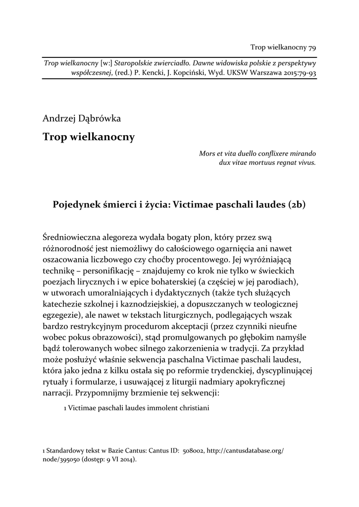 Trop wielkanocny 79 Trop wielkanocny [w:] Staropolskie zwierciadło. Dawne widowiska polskie z perspektywy współczesnej, (red.) P. Kencki, J. Kopciński, Wyd. UKSW Warszawa 2015:79-93 Andrzej Dąbrówka Trop wielkanocny Mors et vita duello conflixere mirando dux vitae mortuus regnat vivus. Pojedynek śmierci i życia: Victimae paschali laudes (2b) Średniowieczna alegoreza wydała bogaty plon, który przez swą różnorodność jest niemożliwy do całościowego ogarnięcia ani nawet oszacowania liczbowego czy choćby procentowego. Jej wyróżniającą technikę – personifikację – znajdujemy co krok nie tylko w świeckich poezjach lirycznych i w epice bohaterskiej (a częściej w jej parodiach), w utworach umoralniających i dydaktycznych (także tych służących katechezie szkolnej i kaznodziejskiej, a dopuszczanych w teologicznej egzegezie), ale nawet w tekstach liturgicznych, podlegających wszak bardzo restrykcyjnym procedurom akceptacji (przez czynniki nieufne wobec pokus obrazowości), stąd promulgowanych po głębokim namyśle bądź tolerowanych wobec silnego zakorzenienia w tradycji. Za przykład może posłużyć właśnie sekwencja paschalna Victimae paschali laudes1, która jako jedna z kilku ostała się po reformie trydenckiej, dyscyplinującej rytuały i formularze, i usuwającej z liturgii nadmiary apokryficznej narracji. Przypomnijmy brzmienie tej sekwencji: 1 Victimae paschali laudes immolent christiani 1 Standardowy tekst w Bazie Cantus: Cantus ID: 508002, http://cantusdatabase.org/ node/395050 (dostęp: 9 VI 2014). Andrzej Dąbrówka80 2 Agnus redemit oves Christus innocens patri reconciliavit peccatores Mors et vita duello conflixere mirando dux vitae mortuus regnat vivus 3 Dic nobis Maria quid vidisti in via sepulcrum Christi viventis et gloriam vidi resurgentis Angelicos testes sudarium et vestes surrexit Christus spes mea praecedet suos in Galilaeam 4 Credendum est magis soli Mariae veraci quam Judaeorum turbae fallaci Scimus Christum surrexisse a mortuis vere tu nobis victor rex miserere. Interesujące nas wyrażenie mors et vita w bazie Cantus występuje tylko w jednej sekwencji VPL (ok. 20 poświadczeń) i w jednej antyfonie na święto odnalezienia Krzyża: Mors et vita apposita sunt tibi si non ostendas mihi crucem Christi (28 poświadczeń)2. Niezwykła popularność sekwencji VPL brała się z jej centralnej roli w liturgii wielkanocnej, ale sprzyjało jej następnie liczne wernakularne potomstwo, które musi poznać każdy, kto patrzy na początki literatury europejskiej w językach narodowych: niemieckim, czeskim, węgierskim, polskim, by wymienić nam najbliższe. Znamy te pieśni tropujące po swojemu frazę tropu łacińskiego surrexit Christus. Być może liczebność i doniosłość tego pieśniowego potomstwa przysłoniła inne ścieżki naszego tropu wielkanocnego, bynajmniej nie marginalne. Oto bowiem podawszy w pierwszej strofie temat święta ofiary paschalnej składanej przez chrześcijan (immolent Christiani), 2 Cantus ID: 003809, http://cantusdatabase.org/node/377216 (dostęp: 9 VI 2014). Trop wielkanocny 81 w drugiej swojej strofce sekwencja przypomina epizody poprzedzające ofiarę paschalną, które w istocie rozpoczęły Mękę: kuszenie na pustyni (po chrzcie Chrystusa) i agonię w ogrodzie Getsemani (w wieczór pojmania). Z pierwszego epizodu pochodzi wyrazisty obraz pojedynku i jego uczestników, z tego drugiego – zapowiedź śmierci (mortuus) w słowach upomnienia do uczniów: Tunc ait illis: Tristis est anima mea usque ad mortem: sustinete hic, et vigilate mecum (Mt 26,38). Ten wątły impuls wystarczył poecie do wywołania na scenę śmierci jako antagonisty życia, jego – uosobionego w Chrystusie, a jej – utożsamionej wpierw z Szatanem, potem zaś upersonifikowanej. Tekst strofy kreuje zatem role protagonisty i antagonisty w sporze o władzę nad światem i żywym stworzeniem. Kwestia zbawienia człowieka zostaje skonceptualizowana jako sprawa życia i śmierci w ogóle, i zgodnie z tym zobrazowana jako „pojedynek” dwu postaci, dwu personifikacji, ścierających się w walce niczym dwaj bojownicy, którzy – jak tłumaczy ks. Stanisław Grochowski – „przeciwną bitwę zwiedli”3. Walka ta została nazwana bitwą, zatem czymś większym niż pojedynek, konfrontacją wodzów dwóch armii: Mors et vita duello conflixere mirando, Dux vitae mortuus, regnat vivus. Twórca sekwencji nie pozwala jednak na zatarcie indywidualnego wymiaru personifikacji życia i werbalizuje realność jej „osoby”, metaforycznie mówiąc o życiu już osobowo jako o „władcy życia” (dux vitae). Kierując zaś z powrotem uwagę na przedmiot święta – czyli ofiarną śmierć owego „władcy” – nie zapomina o bilansie tego „pojedynku”, wyrażonym w kunsztownym paradoksie, że ów „martwy” jednak „króluje żywy”. Upostaciowanie wprowadzonych osób nie jest zatem pełne: oscylują one między sferą metafory osób realnych (Chrystus = pan życia, Szatan = śmierć) a sferą personifikacji, tj. uosobień naczelnych wartości (życie, śmierć). Wobec tego i „pojedynek” jest tylko metaforą walki. 3 Z przekładu Stanisława Grochowskiego Proza wielkanocna: „Śmierć i żywot przeciwną / Bitwę zwiedli, a dziwną. / Żywot acz prawdziwie / Zabit, żywie” (Poezye Ks. Stanisława Grochowskiego, t. 2, Kraków 1859, s. 100). Andrzej Dąbrówka 82 Ponieważ jednak tak ważnej sprawy nie godzi się bagatelizować tak dalece, by czynić z niej figurę retoryczną, przeto pojedynek zostaje określony jako przedziwny, niezwykły, cudowny: duellum mirandum. Ta dwoistość, czy też oscylacja bądź sprzężenie, jest zwykłą cechą złożonych alegorii, a nawet jednostkowych personifikacji. Część swojej siły wyrazu czerpią one z semantycznego oscylatora „konkret–abstrakcja”. Jest tak nawet w przypadku usamodzielnionych personifikacji jak Śmierć „w jej osobie”, znana z danse macabre, która wpra