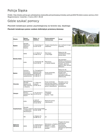 Policja Śląska Źródło: http://slaska.policja.gov.pl/kat/policja-slaska/dla-policjantow/psycholodzy-policyjni/83278,Gdzie-szukac-pomocy.html Wygenerowano: Czwartek, 2 marca 2017, 06:18 Gdzie szukać pomocy Placówki świadczące pomoc psychologiczną na terenie woj. śląskiego Placówki świadczące pomoc osobom dotkniętym przemocą domową: Miasto Nazwa Placówki Adres, nr telefonu Forma pomocy/ rodzaj grupy Będzin Ośrodek Wspierania Dziecka i Rodziny ul. Krasickiego 17 32 267 43 52 Terapia indywidualna i Jest możliwość terapii małżeńska grupowej MOPS ul. K. Miarki 11 33 499 25 05 Rekrutacja: p. Ewa Pająk Bielsko-Biała PCPR ul. Piastowska 40 33 813 69 38 Rekrutacja: p. Monika Stasiak Uwagi Wyłącznie dla mieszkańców miasta Bielsko-Biała Dla powiatów: Bestwina, Buczkowice, Czechowice-Dziedzice, Porąbka, Jasienica, Jaworze, Kozy, Szczyrk, Wilkowice Bytom Centrum ul. Tarnogórska 3 Interwencji (budynek Izby Kryzysowej i Wytrzeźwień) Przeciwdziałania 32 389 00 75 Uzależnieniom 32 389 00 77 Grupa zamknięta, warsztatowa Wyłącznie dla mieszkańców Bytomia. Przyjęcia bez skierowania, po uprzedniej rejestracji telefonicznej Chorzów Specjalistyczny Ośrodek ul. 3 Maja 4/1 Wsparcia dla (I piętro) Ofiar Przemocy 32 345 28 10 w Rodzinie Grupa zamknięta pracuje przez około 4 miesiące;dostępna tez pomoc indywidualna Placówka czynna całodobowo, ma charakter ponadlokalny Cieszyn Stowarzyszenie Pomocy ul. Ks Janusza 3 Wzajemnej ”Być 33 479 54 55 Razem” Rekrutacja: p. Elżbieta Kiedroń - Fałat - Wyłącznie pomoc indywidualna - PCPR Częstochowa Ośrodek Pomocy osobom ul.Sikorskiego78/80 j/w z Problemami 34 361 39 96 Alkoholowymi OIK Dąbrowa Górnicza ul. Jana III Sobieskiego 9 34 322 92 06 MOPS ul. Rejtana 7b 34 366 32 31 ul. Skibińskiego 1 32 262 25 28 32 262 31 63 j/w - - Przyjęcie do grupy – poprzedzone Rekrutacja: p. Ewelina konsultacją Bagńska, p. Zofia indywidualną; Zaręba, p. Izabela obowiązuje rejonizacja walotek przyjęć OIK Gliwice Grupa korekcyjnoedukacyjna dla osób stosujących przemoc ul. Świętokrzyska 5 oraz grupa 32 335 53 40 informacyjna dla osób doznających przemocy Godziny pracy: 8.00-18.00 w dni robocze obowiązuje rejonizacja (ośrodek dysponuje Hostelem) ul. Zygmunta Starego 17 - Jaworzno Ośrodek Profilaktyki Uzależnień od Alkoholu i Pobytu Osób Nietrzeźwych (dawna Izba Wytrzeźwień) ul. Osieckiego 18 32 616 33 60 Rekrutacja: p. Agnieszka Mazgaj p. Beata Ciupał pomoc indywidualna i grupowa Katowice OIK Rekrutacja: ul. Mikołowska 13a p. Irena Góralczyk, 32 257 14 82 p. Hanna Wasilewska Pomoc grupowa poprzedzona jest konsultacjami indywidualnymi Lędziny PCPR ul. Lędzińska 3 32 324 08 16 - Również dla mieszkańców Bierunia Lubliniec PCPR ul. Sobieskiego 9 34 356 32 57 - - Łaziska Górne OIK ul. Chopina 8 32 224 43 90 32 224 44 98 - Obowiązuje rejonizacja Mikołów Mikołowskie ul. Krawczyka 16 Stowarzyszenie 504 930 146 „Zmiana” Kontakt: p. Sabina Bogdanowicz Dyżur w godz. 15.00 – 19.00 PCPR Obowiązuje Pomoc indywidualna telefoniczne oraz grupy korekcyjno uzgodnienie terminu – edukacyjne wizyty Mysłowice OIK ul. Gwarków 24 32 222 24 21 Myszków Punkt Interwencji Kryzysowej ul. Partyzantów 21 34 315 79 08 34 315 78 48 Piekary Śl. MOPR ul. Biskupa Nankera 103 32 284 19 87 32 287 95 03 32 288 35 74 32 630 75 21 Pszczyna PCPR ul. Dworcowa 23 32 449 01 45 Racibórz Ruda Śl. „Persona” Stowarzyszenie na rzecz ul. Karola Miarki Promocji i 603 300 904 Ochrony 722 304 453 Zdrowia Psychicznego OIK ul. Ballestremów 16 32 335 53 40 - - Pomoc w formie grupy otwartej Obowiązuje Rekrutacja: rejonizacja p. Grażyna Klimas Pomoc grupowa i indywidualna na pisemne skierowanie ze strony instytucji Grupa otwarta Dla osób z powiatu pszczyńskiego - Czynny przez 7 dni w Grupa tygodniu w godzinach: korekcyjno-edukacyjna 8.00- 20.00 dla sprawców (ośrodek dysponuje przemocy hostelem) Rybnik Siemianowice Śl. Sosnowiec Ośrodek Interwencji Kryzysowej i Psychoterapii ul. Chrobrego 16 32 422 56 39 OIK Przyjęcie do terapii grupowej – ul. Pszczelnicza 10 poprzedzone 32 762 81 44 konsultacja indywidualną Obowiązuje rejonizacja OIK Zróżnicowane formy ul.Szymanowskiego pomocy dla osób 5a doświadczających 32 298 93 87 przemocy - Specjalistyczny Ośrodek ul. Zubrzyckiego Wsparcia dla 36 Świętochłowice Ofiar Przemocy 32 345 21 65 w Rodzinie „Przystań” Grupa otwarta - Pomoc grupowa; rekrutacja: p. Hanna Lichończak 507 495 195 Nie obowiązuje rejonizacja - ośrodek ponadregionalny; przyjęcia bez skierowań Wodzisław Śl. Powiatowy Specjalistyczny Ośrodek ul. wałowa 30 wsparcia dla 32 455 60 32 Ofiar Przemocy w Rodzinie Pomoc grupowa oraz indywidualna Nie obowiązuje rejonizacja - ośrodek ponadregionalny; przyjęcia bez skierowań (ośrodek dysponuje hostelem) Zabrze Zespół ul. Wyzwolenia 7 Interwencji pok.12 Kryzysowej przy 32 278 56 70 MOPR Indywidualna pomoc korekcyjnoedukacyjna Obowiązuje rejonizacja, ośrodek pracuje od poniedziałku do piątku w godz: 7.30-19.30 Zawiercie POIK Żory OIK Żywiec Powiatowe Centrum Pomocy Rodzinie ul. Daszyńskiego 4 Pomoc grupowa 32 671 07 48 ul. Boryńska 13 32 435 78 40 Pomoc grupowa ul. Ks. Słonki 24 33 861 93 36 Pomoc interdyscyplinarna Obowiązuje rejonizacja ; przyjęcie do terapii poprzedza konsultacja indywidualna - - Ośrodki i Zespoły Interwencji Kryzysowej zatrudniają profesjonalistów znakomicie przygotowanych do działania w sytuacjach kryzysowych i pomagania osobom doświadczającym poważnych życiowych problemów. [ W OIK - w zależności od potrzeby uzyskasz pomoc psychologiczną, socjalną i prawną ]. Pozniżej link do strony z wykazem ośrodków interwencji kryzysowej w całym kraju. www.interwencjakryzysowa.pl/osrodki_lista.php Ośrodki Profilaktyki i Leczenia Uzależnień - na ogół związane z NFZ placówki oferujące pomoc terapeutyczną dla osób uzależnionych od alkoholu (oraz innych środków psychoaktywnych ), hazardu, seksu, int