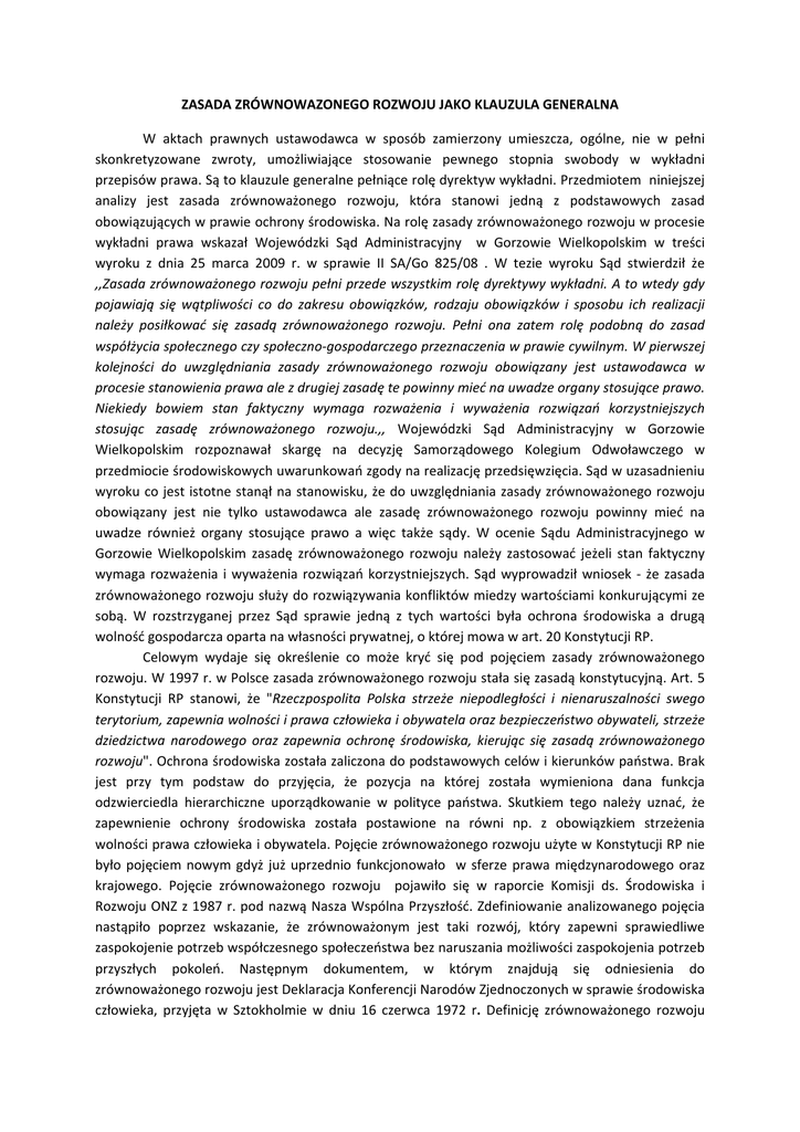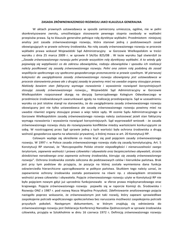 ZASADA ZRÓWNOWAZONEGO ROZWOJU JAKO KLAUZULA GENERALNA W aktach prawnych ustawodawca w sposób zamierzony umieszcza, ogólne, nie w pełni skonkretyzowane zwroty, umożliwiające stosowanie pewnego stopnia swobody w wykładni przepisów prawa. Są to klauzule generalne pełniące rolę dyrektyw wykładni. Przedmiotem niniejszej analizy jest zasada zrównoważonego rozwoju, która stanowi jedną z podstawowych zasad obowiązujących w prawie ochrony środowiska. Na rolę zasady zrównoważonego rozwoju w procesie wykładni prawa wskazał Wojewódzki Sąd Administracyjny w Gorzowie Wielkopolskim w treści wyroku z dnia 25 marca 2009 r. w sprawie II SA/Go 825/08 . W tezie wyroku Sąd stwierdził że ,,Zasada zrównoważonego rozwoju pełni przede wszystkim rolę dyrektywy wykładni. A to wtedy gdy pojawiają się wątpliwości co do zakresu obowiązków, rodzaju obowiązków i sposobu ich realizacji należy posiłkować się zasadą zrównoważonego rozwoju. Pełni ona zatem rolę podobną do zasad współżycia społecznego czy społeczno‐gospodarczego przeznaczenia w prawie cywilnym. W pierwszej kolejności do uwzględniania zasady zrównoważonego rozwoju obowiązany jest ustawodawca w procesie stanowienia prawa ale z drugiej zasadę te powinny mieć na uwadze organy stosujące prawo. Niekiedy bowiem stan faktyczny wymaga rozważenia i wyważenia rozwiązań korzystniejszych stosując zasadę zrównoważonego rozwoju.,, Wojewódzki Sąd Administracyjny w Gorzowie Wielkopolskim rozpoznawał skargę na decyzję Samorządowego Kolegium Odwoławczego w przedmiocie środowiskowych uwarunkowań zgody na realizację przedsięwzięcia. Sąd w uzasadnieniu wyroku co jest istotne stanął na stanowisku, że do uwzględniania zasady zrównoważonego rozwoju obowiązany jest nie tylko ustawodawca ale zasadę zrównoważonego rozwoju powinny mieć na uwadze również organy stosujące prawo a więc także sądy. W ocenie Sądu Administracyjnego w Gorzowie Wielkopolskim zasadę zrównoważonego rozwoju należy zastosować jeżeli stan faktyczny wymaga rozważenia i wyważenia rozwiązań korzystniejszych. Sąd wyprowadził wniosek ‐ że zasada zrównoważonego rozwoju służy do rozwiązywania konfliktów miedzy wartościami konkurującymi ze sobą. W rozstrzyganej przez Sąd sprawie jedną z tych wartości była ochrona środowiska a drugą wolność gospodarcza oparta na własności prywatnej, o której mowa w art. 20 Konstytucji RP. Celowym wydaje się określenie co może kryć się pod pojęciem zasady zrównoważonego rozwoju. W 1997 r. w Polsce zasada zrównoważonego rozwoju stała się zasadą konstytucyjną. Art. 5 Konstytucji RP stanowi, że "Rzeczpospolita Polska strzeże niepodległości i nienaruszalności swego terytorium, zapewnia wolności i prawa człowieka i obywatela oraz bezpieczeństwo obywateli, strzeże dziedzictwa narodowego oraz zapewnia ochronę środowiska, kierując się zasadą zrównoważonego rozwoju". Ochrona środowiska została zaliczona do podstawowych celów i kierunków państwa. Brak jest przy tym podstaw do przyjęcia, że pozycja na której została wymieniona dana funkcja odzwierciedla hierarchiczne uporządkowanie w polityce państwa. Skutkiem tego należy uznać, że zapewnienie ochrony środowiska została postawione na równi np. z obowiązkiem strzeżenia wolności prawa człowieka i obywatela. Pojęcie zrównoważonego rozwoju użyte w Konstytucji RP nie było pojęciem nowym gdyż już uprzednio funkcjonowało w sferze prawa międzynarodowego oraz krajowego. Pojęcie zrównoważonego rozwoju pojawiło się w raporcie Komisji ds. Środowiska i Rozwoju ONZ z 1987 r. pod nazwą Nasza Wspólna Przyszłość. Zdefiniowanie analizowanego pojęcia nastąpiło poprzez wskazanie, że zrównoważonym jest taki rozwój, który zapewni sprawiedliwe zaspokojenie potrzeb współczesnego społeczeństwa bez naruszania możliwości zaspokojenia potrzeb przyszłych pokoleń. Następnym dokumentem, w którym znajdują się odniesienia do zrównoważonego rozwoju jest Deklaracja Konferencji Narodów Zjednoczonych w sprawie środowiska człowieka, przyjęta w Sztokholmie w dniu 16 czerwca 1972 r. Definicję zrównoważonego rozwoju zawarto także w 27 zasadach zrównoważonego rozwoju zamieszczonych w dokumencie Deklaracji z Rio Konferencji Narodów Zjednoczonych Środowisko i Rozwój podpisanym podczas Szczytu Ziemi w Rio de Janeiro w sprawie środowiska i rozwoju ‐ który odbywał się w dniach od 3 do 14 czerwca 1992r. Zgodnie z powyższym dokumentem w procesie zrównoważonego rozwoju w centralnym punkcie należy postawić człowieka, który ma prawo do zdrowego i twórczego życia w harmonii z przyrodą a ochrona środowiska powinna stanowić nierozłączną część procesu rozwoju i nie może być oddzielnie od niego rozpoznawana. W dokumencie przedstawiono pogląd, że zagadnienia środowiskowe są najlepiej rozwiązywane z udziałem wszystkich zainteresowanych. W Polsce problematyka zrównoważonego rozwoju pojawiła się w dokumencie Polityka ekologiczna Państwa, przyjętym przez Sejm Uchwałą z 10 maja 1991 r., w treści którego wskazuje się na potrzebę zgodności polityki gospodarczej z założeniami polityki ekologicznej. Po wstąpieniu RP do Unii Europejskiej dorobek europejski dotyczący zrównoważonego rozwoju został przyjęty i włączony do polskiego systemu prawnego. Zrównoważony rozwój stanowi bowiem oficjalnie podstawowy cel Unii Europejskiej. W 2001 r. w Göteborgu Rada Europejska, przyjęła pierwszą Strategię Zrównoważonego Rozwoju UE. Natomiast w 2006 r, Unia Europejska przyjęła Odnowioną Strategię Zrównoważonego Rozwoju dla rozszerzonej UE. Do powyższych koncepcji nawiązuje sformułowana w art. 3 pkt 50 ustawy z dnia. z dnia 27 kwietnia 2001 r. Prawo ochrony środowiska – zasada zrównoważonego rozwoju, przez który rozumie się taki rozwój społeczno‐gospodarczy, w którym następuje proces integrowania działań
