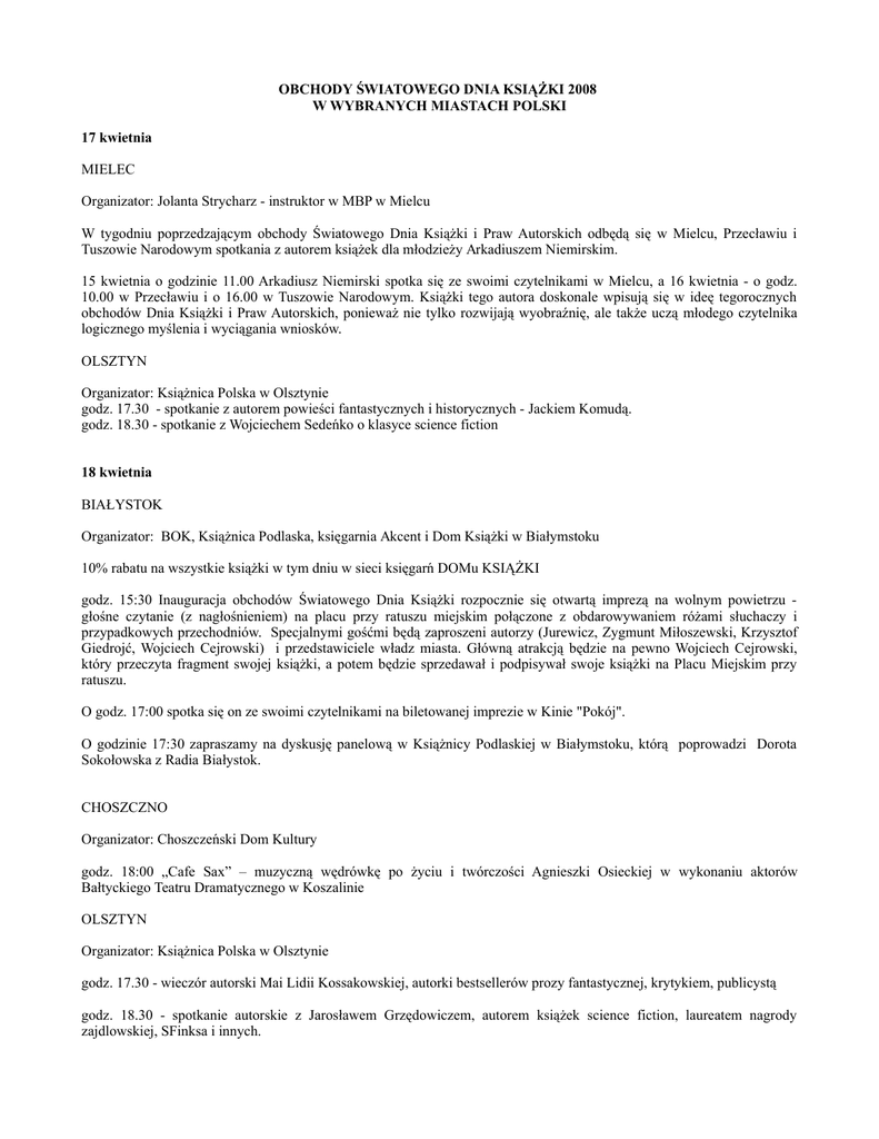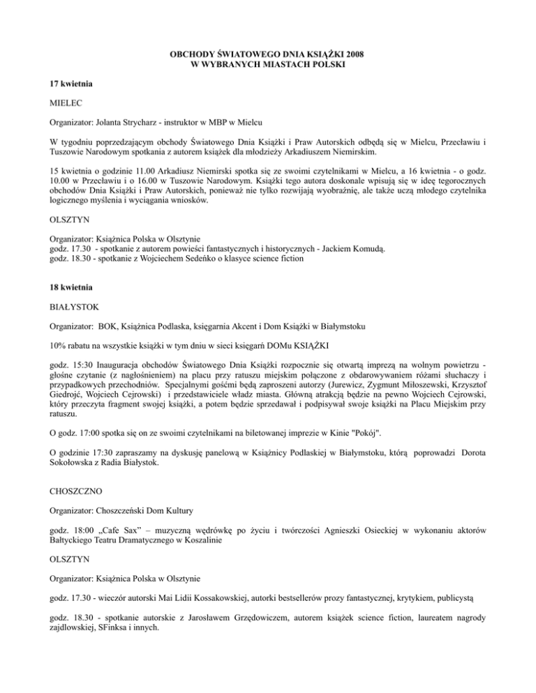OBCHODY ŚWIATOWEGO DNIA KSIĄŻKI 2008 W WYBRANYCH MIASTACH POLSKI 17 kwietnia MIELEC Organizator: Jolanta Strycharz - instruktor w MBP w Mielcu W tygodniu poprzedzającym obchody Światowego Dnia Książki i Praw Autorskich odbędą się w Mielcu, Przecławiu i Tuszowie Narodowym spotkania z autorem książek dla młodzieży Arkadiuszem Niemirskim. 15 kwietnia o godzinie 11.00 Arkadiusz Niemirski spotka się ze swoimi czytelnikami w Mielcu, a 16 kwietnia - o godz. 10.00 w Przecławiu i o 16.00 w Tuszowie Narodowym. Książki tego autora doskonale wpisują się w ideę tegorocznych obchodów Dnia Książki i Praw Autorskich, ponieważ nie tylko rozwijają wyobraźnię, ale także uczą młodego czytelnika logicznego myślenia i wyciągania wniosków. OLSZTYN Organizator: Książnica Polska w Olsztynie godz. 17.30 - spotkanie z autorem powieści fantastycznych i historycznych - Jackiem Komudą. godz. 18.30 - spotkanie z Wojciechem Sedeńko o klasyce science fiction 18 kwietnia BIAŁYSTOK Organizator: BOK, Książnica Podlaska, księgarnia Akcent i Dom Książki w Białymstoku 10% rabatu na wszystkie książki w tym dniu w sieci księgarń DOMu KSIĄŻKI godz. 15:30 Inauguracja obchodów Światowego Dnia Książki rozpocznie się otwartą imprezą na wolnym powietrzu głośne czytanie (z nagłośnieniem) na placu przy ratuszu miejskim połączone z obdarowywaniem różami słuchaczy i przypadkowych przechodniów. Specjalnymi gośćmi będą zaproszeni autorzy (Jurewicz, Zygmunt Miłoszewski, Krzysztof Giedrojć, Wojciech Cejrowski) i przedstawiciele władz miasta. Główną atrakcją będzie na pewno Wojciech Cejrowski, który przeczyta fragment swojej książki, a potem będzie sprzedawał i podpisywał swoje książki na Placu Miejskim przy ratuszu. O godz. 17:00 spotka się on ze swoimi czytelnikami na biletowanej imprezie w Kinie "Pokój". O godzinie 17:30 zapraszamy na dyskusję panelową w Książnicy Podlaskiej w Białymstoku, którą poprowadzi Dorota Sokołowska z Radia Białystok. CHOSZCZNO Organizator: Choszczeński Dom Kultury godz. 18:00 „Cafe Sax” – muzyczną wędrówkę po życiu i twórczości Agnieszki Osieckiej w wykonaniu aktorów Bałtyckiego Teatru Dramatycznego w Koszalinie OLSZTYN Organizator: Książnica Polska w Olsztynie godz. 17.30 - wieczór autorski Mai Lidii Kossakowskiej, autorki bestsellerów prozy fantastycznej, krytykiem, publicystą godz. 18.30 - spotkanie autorskie z Jarosławem Grzędowiczem, autorem książek science fiction, laureatem nagrody zajdlowskiej, SFinksa i innych. 19 kwietnia GDAŃSK Organizator: Księgarnia Artystyczna Przygotowuje zakładki do książek rozdawane w miejscach publicznych, obrazki z wizerunkiem białej róży dla wszystkich klientów i sympatyków oraz „Białą Różę” – rzeźbę wykonaną techniką papier-mache dla wszystkich klientów, którzy dokonają zakupu w dniach 19-20 kwietnia. Księgarnia ogłosiła także konkurs na antenie internetowego radia Toksyna oraz na portalu regionalnym WWW.pruszcz.com GDYNIA Organizator: Miejska Biblioteka Publiczna w Gdyni FASCYNUJĄCE PODRÓŻE Z KSIĄŻKĄ 19-26 kwietnia „Czarodziejskie książki” - prezentacja i krótkie omówienie książek z literatury pięknej i popularnonaukowej ”Dzieje Książki -od glinianej tabliczki do ksiązki komputerowej ” - pogadanki ”Książka wierny przyjaciel” - rozwiązywanie krzyżówek, zagadek o tematyce związanej z książką ”Tajemnice pisma i gęsiego pióra” - zajęcia plastyczne z użyciem różnych form przekazu treści. BIAŁYSTOK Organizator: Dom Książki w Białymstoku gratisowe zakładki do każdego zakupu – każdy klient dokonujący zakupu tego dnia otrzymuje od nas zakładkę (dotyczy zakupów z całej naszej oferty) WARSZAWA Organizator: Muzeum Drukarstwa Warszawskiego oddział Muzeum Historycznego m.st. Warszawy W sobotę zwiedzający będą mogli wziąć udział w warsztatach graficznych pt.: Dłutem, piórkiem, rysikiem... - zabawy graficzne, gdzie po krótkim wprowadzeniu będą mogli wytłoczyć w linorycie swoją kompozycję, a następnie ją wydrukować. Organizator: sieć księgarni językowych Polanglo Od 19 do 26 kwietnia tego roku w naszych księgarniach wszyscy klienci będą mieli 20% zniżkę na całą ofertę Oxford University Press. POZNAŃ Organizator: księgarnia "z Bajki" godz. 11.00 poranek literacki z książką godz.12.00 Literackie urodzinki dla chłopczyka i dziewczynki. Organizator: Zysk i S-ka godz 15.00 spotkanie autorskie ze Zdzisławem Romanowskim, autorem książki Imiona honoru, w Miejskiej Bibliotece Publicznej w Podkowie Leśnej, 19 kwietnia o, Spotkania z autorami w miastach Polski. Organizator: Świat Książki Warszawa 12.00 Księgarnia przy ul. Rosoła 10 spotkanie: Kira Gałczyńska Lublin 11.00 Księgarnia przy ul. Krakowskie Przedmieście 53 spotkanie: Zbigniew Dmitroca Kielce 16.00 Księgarnia przy ul. Sienkiewicza 60 spotkanie: Zbigniew Dmitroca Gliwice 11.00 Księgarnia przy ul. Zwycięstwa 51 spotkanie: Małgorzata Budzyńska Gdynia 11.00 Księgarnia przy ul. Świętojańska 13 A spotkanie: Beata Turska Gdańsk 14.00 Księgarnia przy ul. Świętego Ducha 13/15/17 spotkanie: Beata Turska Bielsko Biała 14.00 Księgarnia przy ul. 11 Listopada 40 spotkanie: Małgorzata Budzyńska 20 kwietnia CHOSZCZNO Organizator: Księgarnia „Pegaz” od godz. 11:00 „Niedziela z różą” oraz spotkanie z Bohdanem Soroko, autorem nowo wydanej książki „Parafia p.w. Świętej Jadwigi Królowej w Choszcznie”. Bohdan Soroko kierował przez 26 lat Powiatową i Miejską Biblioteką Publiczną w Choszcznie WARSZAWA Organizator: Muzeum Drukarstwa Warszawskiego oddział Muzeum Historycznego m.st. Warszawy W pięknej scenerii Salonu Warszawskiego Wydawcy - Salomona Lewentala, goście wysłuchają wybranych fragmentów literatury pięknej, a następnie będą mogli wytłoczyć przygotowany linoryt (wykonany przez artystkę grafika - pracownika naszego Muzeum) przedstawiający r