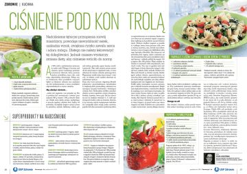 ZDROWIE | K UCHNIA Ciśnienie pod kon trolą Nadciśnienie tętnicze przyspiesza rozwój miażdżycy, powoduje niewydolność nerek, uszkadza wzrok, zwiększa ryzyko zawału serca i udaru mózgu. Dlatego nie należy lekceważyć tej dolegliwości. Jednak czasem wystarczy zmiana diety, aby ciśnienie wróciło do normy. A Pasta z awokado • 1 duże dojrzałe awokado • 3 łyżki soku z cytryny lub limonki • ząbek czosnku • 1 łyżka drobno pokrojonej cebuli Miąższ awokado rozgnieść widelcem, dodać sok z cytryny i przeciśnięty przez praskę czosnek. Dodać cebulę, wymieszać, doprawić do smaku. Można jeść z żytnim chlebem chrupkim i ćwiartkami czerwonej papryki. ż 50% osób z nadciśnieniem tętniczym to osoby otyłe! Dlatego w leczeniu nadciśnienia oprócz kardiologa powinien uczestniczyć dietetyk, który pomoże uzyskać prawidłową masę ciała, ordynując odpowiednią dietoterapię. Polega ona na zwiększeniu ilości produktów mających wpływ na obniżenie ciśnienia oraz zmniejszeniu lub wyeliminowaniu z menu produktów odpowiedzialnych za wzrost ciśnienia. Aby obniżyć ciśnienie… ...należy jeść regularnie i nie przejadać się. Dieta powinna być urozmaicona i zawierać przynajmniej 400 g warzyw i 100 g owoców dziennie. Dzięki temu dawka potasu, niezbędnego w procesie regulacji ciśnienia krwi, będzie odpowiednia. Szczególnie bogate w potas są buraki, pomidory, szpinak, bakłażany, cukinie, gro- ne zapotrzebowanie na tę witaminę. Bardzo ważna w diecie jest też zawartość wapnia i magnezu, które wpływają na kurczliwość naczyń krwionośnych. Dobrym źródłem magnezu są produkty z pełnego ziarna, kasza gryczana, ryby, owoce morza, soczewica, soja, orzechy oraz zielone warzywa i owoce (magnez jest składnikiem zielonego barwnika chlorofilu). Aby dostarczyć odpowiednią ilość wapnia, należy codziennie zjadać przynajmniej dwie porcje produktów mlecznych (porcja = szklanka mleka) lub wypijać 150 g jogurtu albo 200 g kefiru. Wapń znajduje się również w nasionach roślin strączkowych, orzechach i maku. Trzy razy w tygodniu warto jeść ryby bogate w kwasy tłuszczowe omega-3, takie jak łosoś, makrela, śledź, sardynki. Dobrym źródłem tych kwasów są również orzechy włoskie (garść pokryje dzienne zapotrzebowanie), nasiona lnu, które należy jak najczęściej dodawać do musli, koktajli, wypieków, oraz oleje roślinne (najlepszy pod tym względem jest olej lniany). Posiłki należy przyrządzać na parze, gotować, piec w folii lub naczyniu żaroodpornym. Dzięki temu będą łatwostrawne, a wartościowe składniki znajdujące się w nich lepiej przyswajalne. Zamiast smażyć łososia, lepiej go upiec na grillu lub w folii z ziołami, cytryną, czosnkiem i pietruszką. Ryż brązowy dostarczy ponad dwa razy więcej potasu i witaminy E, ponad trzy razy więcej wapnia i aż ponad osiem razy więcej magnezu niż biały. Podobnie jest z pieczywem z mąki oczyszczonej i razowej, dlatego znacznie szek zielony, pietruszka, agrest, banany, morele i porzeczki. Zbyt niski poziom potasu prowadzi do zatrzymania w organizmie sodu, a w konsekwencji do wzrostu ciśnienia tętniczego krwi. Wegetarianie zwykle jedzą więcej warzyw i owoców i to właśnie u nich rzadziej obserwuje się nadciśnienie tętnicze. Dużą rolę w tym procesie odgrywają błonnik pokarmowy i przeciwutleniacze. Antyoksydanty zwiększają ilość prostacykliny, substancji rozszerzającej naczynia krwionośne i obniżającej ciśnienie krwi. Doskonałym źródłem antyoksydantów są owoce jagodowe, ciemne winogrona, brokuły, żurawina, owoce goji. Nie bez znaczenia jest też działanie witaminy C. U osób spożywających bardzo mało tej witaminy obserwuje się znacznie częściej występowanie nadciśnienia i przypadki udaru mózgu. Jedna czerwona papryka lub duża pomarańcza pokrywają dzien- Farfalle z liśćmi szpinaku i kozim serem (2 porcje) • 1 szklanka makaronu farfalle • 1 posiekana cebulka • 1 zmiażdżony ząbek czosnku • 6 szklanek szpinaku • 1/3 szklanki posiekanych czarnych oliwek • szczypta soli, pieprzu • 1,5 szklanki połówek pomidorków koktajlowych lepszy będzie wybór produktów z pełnego ziarna. Przy nadciśnieniu tętniczym niewskazane jest picie kawy, mocnej czarnej herbaty i alkoholu. Ich nadmiar w diecie wpływa także na niższą zawartość magnezu we krwi. Do picia zalecane są wody niskosodowe (poniżej 20 mg sodu/l), herbaty zielona i czerwona oraz owocowe. Uwaga na sól Aby obniżyć ciśnienie, należy przede wszystkim unikać wysokiego spożycia sodu. Ozna- Papryka z tuńczykiem Superprodukty na nadciśnienie • 1/2 szklanki ugotowanej kaszy jęczmiennej AWOKADO dostarcza wit. E rozszerzającej naczynia krwionośne, potas, kwasy tłuszczowe omega-3. FASOLA ma niską zawartość tłuszczu, za to wysoką zawartość błonnika i jest bogata w białko, zawiera foliany, potas, a także magnez i żelazo. POMIDORY to doskonałe źródło potasu i likopenu. Jedząc 2-3 pomidory, dostarczamy organizmowi dzienną dawkę likopenu, który jest silnym antyoksydantem i chroni naczynia krwionośne. Likopen wchłania się w obec- 56 ności tłuszczów jednonienasyconych (oliwa lub orzechy). BANANY zawierają potas i magnez. Jedzenie dwóch bananów dziennie obniża poziom ciśnienia o 10%. ARBUZ – jeden plaster arbuza dostarcza więcej potasu niż średni banan i znaczną ilość likopenu. ORZECHY WŁOSKIE dostarczają aminokwasu biorącego udział w produkcji kwasu azotowego pomagającego uelastycznić naczynia krwionośne. SZPINAK – pół szklanki gotowanego szpinaku codziennie dostarcza 500 mg potasu. Farmacja i Ja październik 2013 CZOSNEK jest dobrym źródłem potasu. Ma właściwości antyoksydacyjne. Doskonała alternatywa dla soli. SELER zawiera aktywny składnik (3-n-butyl-ftalid) obniżający ciśnienie i cholesterol. Prawdopodobnie wpływa on także na obniżenie poziomu tzw. hormonów stresowych. ŁOS
