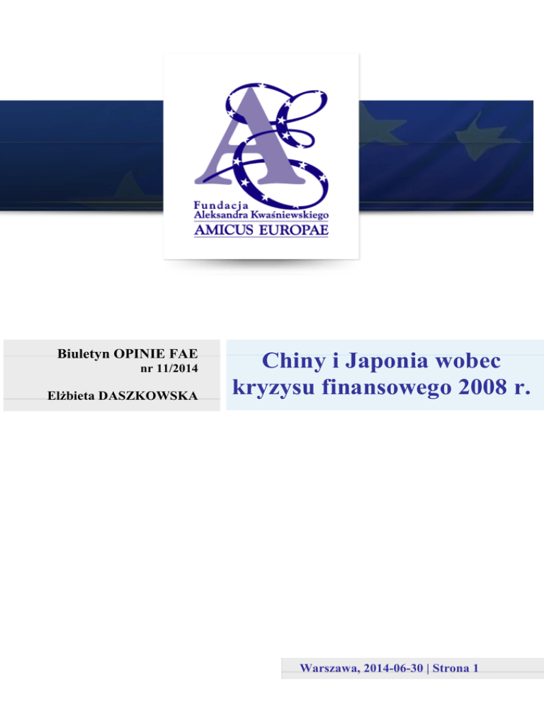 Biuletyn OPINIE FAE nr 11/2014 Elżbieta DASZKOWSKA Chiny i Japonia wobec kryzysu finansowego 2008 r. Warszawa, 2014-06-30 | Strona 1 Chiny i Japonia wobec kryzysu finansowego z 2008 r. Biuletyn OPINIE FAE nr 11/2014 Elżbieta Daszkowska Zapaść światowych finansów, która wybuchła w 2008 r., odbiła się bardzo szerokim echem we wszystkich gospodarkach świata i obnażyła problemy gospodarcze wielu państw. Również kontynent azjatycki został dotknięty skutkami kryzysu finansów, jednakże z uwagi na niejednolitość gospodarek państw tego regionu wspomniane skutki zostaną przedstawione na przykładzie największych organizmów gospodarczych Azji, tj. Chin (ChRL) oraz Japonii. Na wstępie należy wyodrębnić dziesięć unikatowych cech tzw. „azjatyckiego modelu gospodarczego”, wspólnych dla wspomnianych krajów, pomimo ich ogólnych odrębności polityczno-gospodarczych:1 1. silne rządy państwa będącego gwarantem wzrostu gospodarczego, co w wielu krajach azjatyckich przekłada się wręcz na autorytarną formę rządów; 2. szeroko pojęty liberalizm gospodarczy w postaci wolności gospodarczej dla przedsiębiorców. Politycy azjatyccy wychodzą z założenia, że przedsiębiorczość stanowi podstawę rozwoju gospodarczego i z tego względu można powiedzieć, iż mimo silnych rządów wykształciła się bardzo specyficzna forma dialogu między sektorem prywatnym a elitami władzy; 3. brak oświeceniowego racjonalizmu prawnego, wynikającego z charakterystycznego dla tego obszaru geograficznego tabu społecznego i religijnego, na podstawie którego wszelkie zmiany są inicjowane na drodze zarządzeń administracyjnych, a nie legislacyjnych. Charakterystyczna jest również współpraca biznesu z ustawodawcą; 4. brak rozbudowanych zabezpieczeń prawnych chroniących pracownika, znanych z modelu europejskiego. W większości krajów azjatyckich nie istnieją żadne prawne zabezpieczenia w postaci np. przepisów o płacy minimalnej czy gwarancji umów o pracę. Funkcjonujący system „hired and fired” jest bardzo zbliżony do modelu amerykańskiego. Z drugiej jednak strony, azjatycką normą jest wiązanie się pracownika ze swoim pracodawcą na cały czas aktywności zawodowej; 5. niski poziom podatków, ale też bardzo niewielki współczynnik transferów socjalnych. W opinii ekonomistów azjatyckich, wysokie opodatkowanie firm jest nieefektywne, 1 „Unię chwalicie, Azji nie znacie - azjatycki model ekonomiczny”, BDO Research Sp. z.o.o. , czerwiec 2010, str. 6 Warszawa, 2014-06-30 | Strona 2 Chiny i Japonia wobec kryzysu finansowego z 2008 r. Biuletyn OPINIE FAE nr 11/2014 Elżbieta Daszkowska trudne do zarządzania, co przekłada się na niską skuteczność tego narzędzia. Również cele transferów socjalnych są odmienne od europejskich, ponieważ z założenia mają zapewnić minimum pomocy dla osób najbardziej potrzebujących i stąd też ceny podstawowych dóbr spożywczych są utrzymywane przez państwo na niskim poziomie; 6. specyficzne pojmowanie zjawiska konkurencji w połączeniu z silnym etatyzmem państwowym – tj. wyjście z założenia, że gospodarka powinna być otwarta na rozwiązania proinnowacyjne zaaprobowane przez władze; 7. wysoki współczynnik oszczędności w skali rodzin i państwa – element konfucjańskiego prymatu oszczędności nad konsumpcją. Zaoszczędzone środki są następnie przeznaczane na nowe inwestycje; 8. wysoki napływ inwestycji zagranicznych – efekt otwarcia gospodarek; 9. nastawienie gospodarki na politykę proeksportową – wyjście z założenia, że eksport stanowi serce gospodarki i jest priorytetem, a nie jednym z celów realizowanym przez produkcję w Specjalnych Strefach Ekonomicznych (SSE) czy produkcję przy zastosowaniu zwolnień podatkowych. Z kolei import jest nagrodą za eksport lub ma charakter inwestycyjny właśnie na potrzeby eksportu; 10. priorytet edukacji jako inwestycji w kapitał ludzki. Wciąż wzrasta liczba studentów na kontynencie azjatyckim, np. w ChRL od 2005 r. wzrosła aż o 165 proc., z czego w wielu przypadkach obywatele Państwa Środka decydują się na edukację zagraniczną. W tym punkcie warto wspomnieć o kluczowych różnicach występujących w gospodarkach opisywanych państw, które przesądziły o odmiennym przejściu przez ostatni kryzys. Tezy te zostaną omówione na przykładzie Chin i Japonii. Chiny i Japonia mają odmienne systemy polityczno-gospodarcze, poza tym znajdują się na odmiennych etapach rozwoju ekonomicznego; kraje te mają zdecydowanie różne systemy bankowe, finansowe i walutowe; zapaść finansów publicznych z 2008 r. ujawniła problemy wewnętrzne tych dwóch gospodarek – w przypadku Chin jest to konieczność reorientacji na Warszawa, 2014-06-30 | Strona 3 Chiny i Japonia wobec kryzysu finansowego z 2008 r. Biuletyn OPINIE FAE nr 11/2014 Elżbieta Daszkowska rynek wewnętrzny, z kolei Japonia będzie musiała zmierzyć się z problemem sanacji finansów publicznych oraz znaleźć skuteczny sposób na wyjście z trwającej od dwóch dziesięcioleci stagnacji gospodarczej; oba kraje stają w obliczu bardzo poważnych wyzwań społecznych w postaci nieuniknionej zapaści demograficznej. Państwo Środka w obliczu kryzysu światowego z 2008 r. „Jeśli twoja firma nie zarobi pieniędzy w Chinach, zapewne nie zarobi ich nigdzie” 2 Chiny są przykładem kraju, który mimo iż wciąż znajduje się w procesie transformacji ustrojowo – ekonomicznej trwającej nieprzerwanie od 1978 r., to już może mówić o sukcesie gospodarczym. Kraj ten dokonał ogromnego skoku cywilizacyjnego gdyż uporał się z problemem głodu, ubóstwa i klęsk żywiołowych. W 1981 r. aż 84 proc. populacji chińskiej żyło poniżej granicy ubóstwa (za mniej niż 1,25 USD dziennie), zaś w 2005 r. odsetek ten spadł do 16 proc.. Niemniej jednak sukces ten ma i drugą stronę, trzeba wspomnieć o pogłębiającym się wciąż rozwarstwieniu społeczeństwa i ut