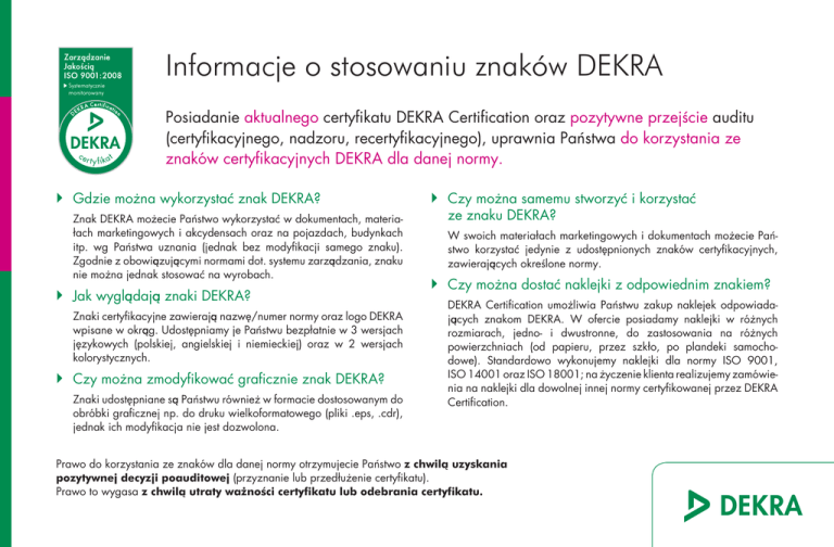 Informacje o stosowaniu znaków DEKRA Posiadanie aktualnego certyfikatu DEKRA Certification oraz pozytywne przejście auditu (certyfikacyjnego, nadzoru, recertyfikacyjnego), uprawnia Państwa do korzystania ze znaków certyfikacyjnych DEKRA dla danej normy. `` Gdzie można wykorzystać znak DEKRA? Znak DEKRA możecie Państwo wykorzystać w dokumentach, materiałach marketingowych i akcydensach oraz na pojazdach, budynkach itp. wg Państwa uznania (jednak bez modyfikacji samego znaku). Zgodnie z obowiązującymi normami dot. systemu zarządzania, znaku nie można jednak stosować na wyrobach. `` Jak wyglądają znaki DEKRA? Znaki certyfikacyjne zawierają nazwę/numer normy oraz logo DEKRA wpisane w okrąg. Udostępniamy je Państwu bezpłatnie w 3 wersjach językowych (polskiej, angielskiej i niemieckiej) oraz w 2 wersjach kolorystycznych. `` Czy można zmodyfikować graficznie znak DEKRA? Znaki udostępniane są Państwu również w formacie dostosowanym do obróbki graficznej np. do druku wielkoformatowego (pliki .eps, .cdr), jednak ich modyfikacja nie jest dozwolona. `` Czy można samemu stworzyć i korzystać ze znaku DEKRA? W swoich materiałach marketingowych i dokumentach możecie Państwo korzystać jedynie z udostępnionych znaków certyfikacyjnych, zawierających określone normy. `` Czy można dostać naklejki z odpowiednim znakiem? DEKRA Certification umożliwia Państwu zakup naklejek odpowiadających znakom DEKRA. W ofercie posiadamy naklejki w różnych rozmiarach, jedno- i dwustronne, do zastosowania na różnych powierzchniach (od papieru, przez szkło, po plandeki samochodowe). Standardowo wykonujemy naklejki dla normy ISO 9001, ISO 14001 oraz ISO 18001; na życzenie klienta realizujemy zamówienia na naklejki dla dowolnej innej normy certyfikowanej przez DEKRA Certification. Prawo do korzystania ze znaków dla danej normy otrzymujecie Państwo z chwilą uzyskania pozytywnej decyzji poauditowej (przyznanie lub przedłużenie certyfikatu). Prawo to wygasa z chwilą utraty ważności certyfikatu lub odebrania certyfikatu. Zachęcamy Państwa także do korzystania z oferty usług dodatkowych DEKRA Certification, które potwierdzają jakość i wspierają wizerunek Państwa marki, jako godnej zaufania. Oprócz znaków i naklejek oferujemy: certyfikaty ozdobne, plakaty, roll-up’y, uroczyste wręczenie certyfikatu oraz inne niestandardowe rozwiązania reklamowo-promocyjne. ` Zachęcamy do kontaktu z Zespołem Marketingu! Dane kontaktowe DEKRA Certification Sp. z o.o. Plac Solny 20, 50-063 Wrocław www.DEKRA-certification.com.pl Zespół Marketingu E-mail: [email protected] Tel. +48.71.783-32-65 lub +48.71.780-47-72
