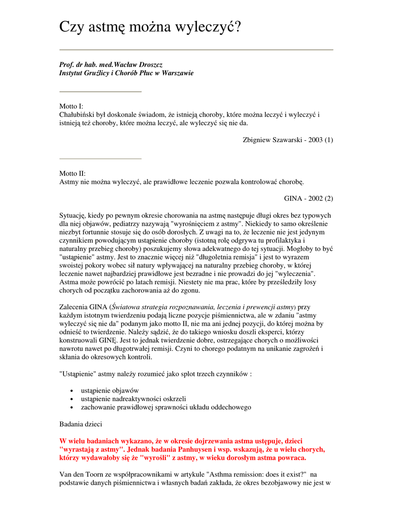 Czy astmę można wyleczyć? Prof. dr hab. med.Wacław Droszcz Instytut Gruźlicy i Chorób Płuc w Warszawie Motto I: Chałubiński był doskonale świadom, że istnieją choroby, które można leczyć i wyleczyć i istnieją też choroby, które można leczyć, ale wyleczyć się nie da. Zbigniew Szawarski - 2003 (1) Motto II: Astmy nie można wyleczyć, ale prawidłowe leczenie pozwala kontrolować chorobę. GINA - 2002 (2) Sytuację, kiedy po pewnym okresie chorowania na astmę następuje długi okres bez typowych dla niej objawów, pediatrzy nazywają "wyrośnięciem z astmy". Niekiedy to samo określenie niezbyt fortunnie stosuje się do osób dorosłych. Z uwagi na to, że leczenie nie jest jedynym czynnikiem powodującym ustąpienie choroby (istotną rolę odgrywa tu profilaktyka i naturalny przebieg choroby) poszukujemy słowa adekwatnego do tej sytuacji. Mogłoby to być "ustąpienie" astmy. Jest to znacznie więcej niż "długoletnia remisja" i jest to wyrazem swoistej pokory wobec sił natury wpływającej na naturalny przebieg choroby, w której leczenie nawet najbardziej prawidłowe jest bezradne i nie prowadzi do jej "wyleczenia". Astma może powrócić po latach remisji. Niestety nie ma prac, które by prześledziły losy chorych od początku zachorowania aż do zgonu. Zalecenia GINA (Światowa strategia rozpoznawania, leczenia i prewencji astmy) przy każdym istotnym twierdzeniu podają liczne pozycje piśmiennictwa, ale w zdaniu "astmy wyleczyć się nie da" podanym jako motto II, nie ma ani jednej pozycji, do której można by odnieść to twierdzenie. Należy sądzić, że do takiego wniosku doszli eksperci, którzy konstruowali GINĘ. Jest to jednak twierdzenie dobre, ostrzegające chorych o możliwości nawrotu nawet po długotrwałej remisji. Czyni to chorego podatnym na unikanie zagrożeń i skłania do okresowych kontroli. "Ustąpienie" astmy należy rozumieć jako splot trzech czynników : • • • ustąpienie objawów ustąpienie nadreaktywności oskrzeli zachowanie prawidłowej sprawności układu oddechowego Badania dzieci W wielu badaniach wykazano, że w okresie dojrzewania astma ustępuje, dzieci "wyrastają z astmy". Jednak badania Panhuysen i wsp. wskazują, że u wielu chorych, którzy wydawałoby się że "wyrośli" z astmy, w wieku dorosłym astma powraca. Van den Toorn ze współpracownikami w artykule "Asthma remission: does it exist?" na podstawie danych piśmiennictwa i własnych badań zakłada, że okres bezobjawowy nie jest w samej rzeczy remisją, ponieważ jest wiele dowodów na to, że zmiany zapalne w oskrzelach utrzymują się, a nawet ulegają progresji . Wcześniejsze prace wskazują na większą skłonność autorów do twierdzenia, że duży odsetek dzieci ,"wyrasta" z astmy. Wiele danych na temat tzw. wyrośnięcia z astmy dostarczają badania metodą BAL i badania biopsją oskrzeli. W badaniach Warke i wsp. u 25 dzieci w okresie remisji astmy (12 i więcej miesięcy bez objawów i leczenia, średnio 24 miesiące) w badaniach stwierdzono obecność eozynofili co jest oznaką eozynofilowego zapalenia oskrzeli. Mało jest agresywnych badań o przemodelowaniu oskrzeli w okresie klinicznej remisji. Należy zatem stwierdzić, że w związku ze współczesnymi danymi na temat utrzymującego się zapalenia w drogach oddechowych i tendencją do przemodelowania oskrzeli, koncepcja "wyrastania" z astmy i przerywania postępowania leczniczego bez potwierdzenia jej ustąpienia jest mało rozsądna i może w przyszłości wywrzeć negatywne, nieodwracalne zmiany w układzie oddechowym. Badania dorosłych Problem "wyleczenia" mógłby być rozstrzygnięty, gdyby można było prześledzić losy pacjentów od zachorowania do zgonu, z tym że nie mógłby to być zgon przedwczesny. Takich badań niestety nie ma. Pracą, która zbliża się do istoty sprawy, jest badanie lekarzy z Baltimore. Wybraną grupę 181 chorych zbadano po 25 latach, posługując się metodą potrójnej oceny: objawy, nadreaktywność oskrzeli i FEV1. Jedynie 20 chorych (11%) spełniało wspomniane trzy kryteria wyleczenia. Analizowano te parametry osobno - u 38 chorych (21%) ustąpiła nadreaktywność oskrzeli, a u 45 (25%) FEV1 przekraczało 90% normy. Ze zrozumiałych względów etycznych nic nie wiemy o stanie błony śluzowej oskrzeli u owych 20 osób dorosłych, które "wyrosły" z astmy. Nie wiemy również, czy był to "koniec" astmy. Z badań tych wynika, że na przestrzeni dłuższego czasu 1 na 10 chorych pozbywa się astmy. Gdyby uwzględnić w tej ocenie stan błony śluzowej oskrzeli, poszukiwanie elementów przebudowy, remodelingu i dalsze 25 lat, odsetek wyleczeń byłby zapewne niższy. W naszym piśmiennictwie odnotowujemy pracę Barlińskiego i wsp., którzy badali czynność płuc w okresie bezobjawowym astmy i stwierdzili zmiany w testach drobnych oskrzeli, co w przełożeniu na domniemane zmiany histopatologiczne było już dużym odchyleniem. W jednym z kilku badań opartych na biopsji oskrzeli u dorosłych chorych w pełnej remisji choroby wykazano objawy zapalenia oskrzeli z nagromadzeniem w błonie śluzowej eozynofili i bazofili. To samo stwierdzono w astmie łagodnej u dzieci, u których stwierdzono pogrubienie błony podstawnej nawet u tych, którzy dopiero od roku chorują na astmę. Tłumaczy to, że zbyt późne wprowadzenie do leczenia dzieci wziewnych glikokortykosteroidów nie prowadzi do uzyskania prawidłowego FEV1 w późniejszym okresie . Astma de novo Skoro astma z takim trudem ustępuje, to należy odpowiedzieć na pytanie, jakie czynniki wpływają na pojawienie się jej w wieku dojrzałym? Wpływa na to wiele czynników, w tym środowiskowe, zawodowe i inne. Nawet uprawianie sportu wyczynowego może być przyczyną astmy. Dotyczy to głównie dyscyplin sportowych, w których wysiłek przebiega w środowisku zimnego, suchego powietrza (narciarstwo biegowe, łyżwiarstwo itp.). Badania biopsyjne grupy Laitinena śluzówki oskrzeli nar