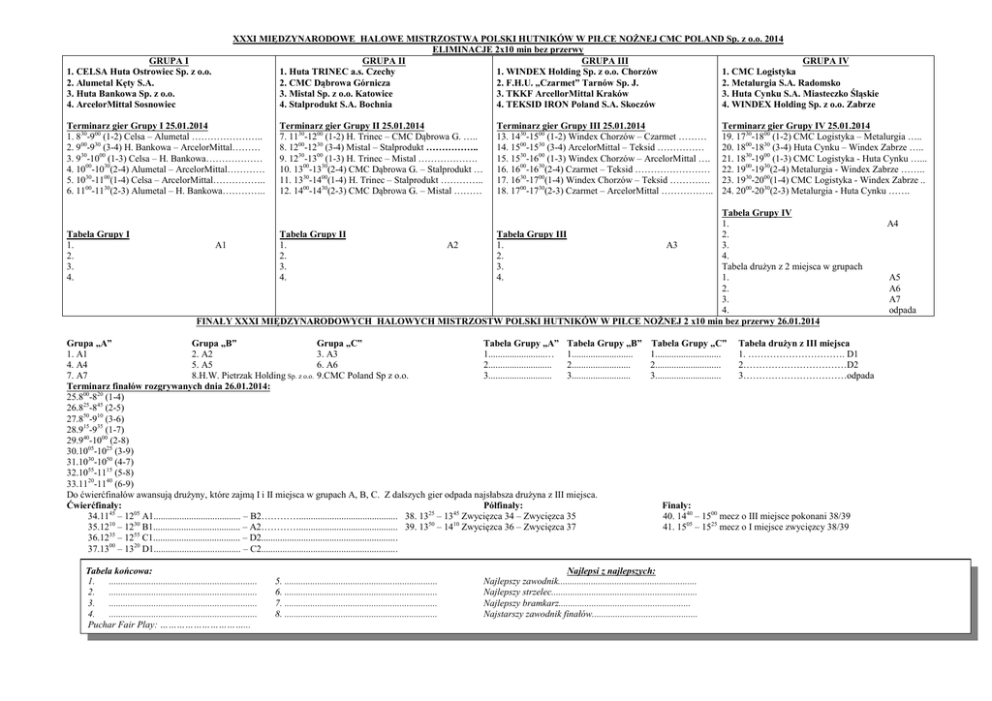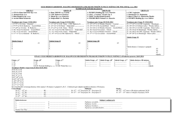 GRUPA I 1. CELSA Huta Ostrowiec Sp. z o.o. 2. Alumetal Kęty S.A. 3. Huta Bankowa Sp. z o.o. 4. ArcelorMittal Sosnowiec XXXI MIĘDZYNARODOWE HALOWE MISTRZOSTWA POLSKI HUTNIKÓW W PIŁCE NOŻNEJ CMC POLAND Sp. z o.o. 2014 ELIMINACJE 2x10 min bez przerwy GRUPA II GRUPA III GRUPA IV 1. Huta TRINEC a.s. Czechy 1. WINDEX Holding Sp. z o.o. Chorzów 1. CMC Logistyka 2. CMC Dąbrowa Górnicza 2. F.H.U. „Czarmet” Tarnów Sp. J. 2. Metalurgia S.A. Radomsko 3. Mistal Sp. z o.o. Katowice 3. TKKF ArcellorMittal Kraków 3. Huta Cynku S.A. Miasteczko Śląskie 4. Stalprodukt S.A. Bochnia 4. TEKSID IRON Poland S.A. Skoczów 4. WINDEX Holding Sp. z o.o. Zabrze Terminarz gier Grupy I 25.01.2014 1. 830-900 (1-2) Celsa – Alumetal ………………….. 2. 900-930 (3-4) H. Bankowa – ArcelorMittal……… 3. 930-1000 (1-3) Celsa – H. Bankowa……………… 4. 1000-1030(2-4) Alumetal – ArcelorMittal………… 5. 1030-1100(1-4) Celsa – ArcelorMittal…………….. 6. 1100-1130(2-3) Alumetal – H. Bankowa………….. Tabela Grupy I 1. 2. 3. 4. Terminarz gier Grupy II 25.01.2014 7. 1130-1200 (1-2) H. Trinec – CMC Dąbrowa G. ….. 8. 1200-1230 (3-4) Mistal – Stalprodukt …………….. 9. 1230-1300 (1-3) H. Trinec – Mistal ………………. 10. 1300-1330(2-4) CMC Dąbrowa G. – Stalprodukt … 11. 1330-1400(1-4) H. Trinec – Stalprodukt ………….. 12. 1400-1430(2-3) CMC Dąbrowa G. – Mistal ……… Terminarz gier Grupy III 25.01.2014 13. 1430-1500 (1-2) Windex Chorzów – Czarmet ……… 14. 1500-1530 (3-4) ArcelorMittal – Teksid …………… 15. 1530-1600 (1-3) Windex Chorzów – ArcelorMittal …. 16. 1600-1630(2-4) Czarmet – Teksid …………………… 17. 1630-1700(1-4) Windex Chorzów – Teksid …………. 18. 1700-1730(2-3) Czarmet – ArcelorMittal …………….. Terminarz gier Grupy IV 25.01.2014 19. 1730-1800 (1-2) CMC Logistyka – Metalurgia ….. 20. 1800-1830 (3-4) Huta Cynku – Windex Zabrze ….. 21. 1830-1900 (1-3) CMC Logistyka - Huta Cynku …... 22. 1900-1930(2-4) Metalurgia - Windex Zabrze …….. 23. 1930-2000(1-4) CMC Logistyka - Windex Zabrze .. 24. 2000-2030(2-3) Metalurgia - Huta Cynku ……. Tabela Grupy IV 1. 2. Tabela Grupy II Tabela Grupy III A1 1. A2 1. A3 3. 2. 2. 4. 3. 3. Tabela drużyn z 2 miejsca w grupach 4. 4. 1. 2. 3. 4. FINAŁY XXXI MIĘDZYNARODOWYCH HALOWYCH MISTRZOSTW POLSKI HUTNIKÓW W PIŁCE NOŻNEJ 2 x10 min bez przerwy 26.01.2014 Grupa „A” Grupa „B” Grupa „C” Tabela Grupy „A” Tabela Grupy „B” 1. A1 2. A2 3. A3 1........................… 1.......................... 4. A4 5. A5 6. A6 2........................... 2......................... 7. A7 8.H.W. Pietrzak Holding Sp. z o.o. 9.CMC Poland Sp z o.o. 3........................... 3......................... Terminarz finałów rozgrywanych dnia 26.01.2014: 25.800-820 (1-4) 26.825-845 (2-5) 27.850-910 (3-6) 28.915-935 (1-7) 29.940-1000 (2-8) 30.1005-1025 (3-9) 31.1030-1050 (4-7) 32.1055-1115 (5-8) 33.1120-1140 (6-9) Do ćwierćfinałów awansują drużyny, które zajmą I i II miejsca w grupach A, B, C. Z dalszych gier odpada najsłabsza drużyna z III miejsca. Ćwierćfinały: Półfinały: 34.1145 – 1205 A1..................................... – B2………….......................................... 38. 1325 – 1345 Zwycięzca 34 – Zwycięzca 35 10 30 50 10 35.12 – 12 B1..................................... – A2………….......................................... 39. 13 – 14 Zwycięzca 36 – Zwycięzca 37 36.1235 – 1255 C1..................................... – D2.......................................................... 37.1300 – 1320 D1..................................... – C2.......................................................... Tabela końcowa: 1. ............................................................... 2. ............................................................... 3. ............................................................... 4. ............................................................... Puchar Fair Play: …………………………... 5. ................................................................. 6. ................................................................. 7. ................................................................. 8. ................................................................. Tabela Grupy „C” 1............................ 2............................ 3............................ Tabela drużyn z III miejsca 1. …………………………. D1 2……………………………D2 3……………………………odpada Finały: 40. 1440 – 1500 mecz o III miejsce pokonani 38/39 41. 1505 – 1525 mecz o I miejsce zwycięzcy 38/39 Najlepsi z najlepszych: Najlepszy zawodnik........................................................... Najlepszy strzelec.............................................................. Najlepszy bramkarz........................................................ Najstarszy zawodnik finałów............................................. A4 A5 A6 A7 odpada
