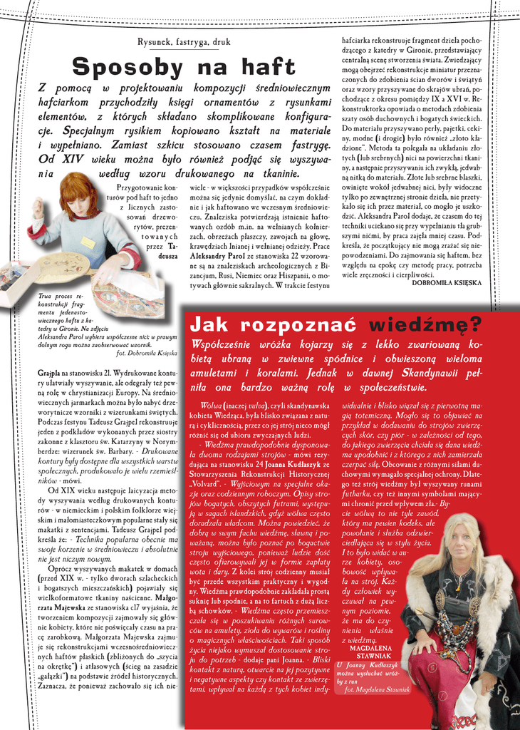 Rysunek, fastryga, druk Sposoby na haft Z pomocą w projektowaniu kompozycji średniowiecznym hafciarkom przychodziły księgi ornamentów z rysunkami elementów, z których składano skomplikowane konfiguracje. Specjalnym rysikiem kopiowano kształt na materiale i wypełniano. Zamiast szkicu stosowano czasem fastrygę. Od XIV wieku można było również podjąć się wyszywani a według wzoru drukowanego na tkaninie. Przygotowanie konturów pod haft to jedno z licznych zastosowań drzeworytów, prezent o wa n y c h przez Tadeusza Trwa proces rekonstrukcji fragmentu jedenastowiecznego haftu z katedry w Gironie. Na zdjęciu Aleksandra Parol wybiera współczesne nici; w prawym dolnym rogu można zaobserwować wzornik. fot. Dobromiła Księska Grajpla na stanowisku 21. Wydrukowane kontury ułatwiały wyszywanie, ale odegrały też pewną rolę w chrystianizacji Europy. Na średniowiecznych jarmarkach można było nabyć drzeworytnicze wzorniki z wizerunkami świętych. Podczas festynu Tadeusz Grajpel rekonstruuje jeden z podkładów wykonanych przez siostry zakonne z klasztoru św. Katarzyny w Norymberdze: wizerunek św. Barbary. - Drukowane kontury były dostępne dla wszystkich warstw społecznych, produkowało je wielu rzemieślników - mówi. Od XIX wieku następuje laicyzacja metody wyszywania według drukowanych konturów - w niemieckim i polskim folklorze wiejskim i małomiasteczkowym popularne stały się makatki z sentencjami. Tadeusz Grajpel podkreśla że: - Technika popularna obecnie ma swoje korzenie w średniowieczu i absolutnie nie jest niczym nowym. Oprócz wyszywanych makatek w domach (przed XIX w. - tylko dworach szlacheckich i bogatszych mieszczańskich) pojawiały się wielkoformatowe tkaniny naścienne. Małgorzata Majewska ze stanowiska c17 wyjaśnia, że tworzeniem kompozycji zajmowały się głównie kobiety, które nie poświęcały czasu na pracę zarobkową. Małgorzata Majewska zajmuje się rekonstrukcjami wczesnośredniowiecznych haftów płaskich (zbliżonych do „szycia na okrętkę”) i atłasowych (ścieg na zasadzie „gałązki”) na podstawie źródeł historycznych. Zaznacza, że ponieważ zachowało się ich nie- wiele - w większości przypadków współcześnie można się jedynie domyślać, na czym dokładnie i jak haftowano we wczesnym średniowieczu. Znaleziska potwierdzają istnienie haftowanych ozdób m.in. na wełnianych kołnierzach, obrzeżach płaszczy, zawojach na głowę, krawędziach lnianej i wełnianej odzieży. Prace Aleksandry Parol ze stanowiska 22 wzorowane są na znaleziskach archeologicznych z Bizancjum, Rusi, Niemiec oraz Hiszpanii, o motywach głównie sakralnych. W trakcie festynu hafciarka rekonstruuje fragment dzieła pochodzącego z katedry w Gironie, przedstawiający centralną scenę stworzenia świata. Zwiedzający mogą obejrzeć rekonstrukcje miniatur przeznaczonych do zdobienia ścian dworów i świątyń oraz wzory przyszywane do skrajów ubrań, pochodzące z okresu pomiędzy IX a XVI w. Rekonstruktorka opowiada o metodach zdobienia szaty osób duchownych i bogatych świeckich. Do materiału przyszywano perły, pajetki, cekiny, modne (i drogie) było również „złoto kładzione”. Metoda ta polegała na układaniu złotych (lub srebrnych) nici na powierzchni tkaniny, a następnie przyszywaniu ich zwykłą, jedwabną nitką do materiału. Złote lub srebrne blaszki, owinięte wokół jedwabnej nici, były widoczne tylko po zewnętrznej stronie dzieła, nie przetykało się ich przez materiał, co mogło je uszkodzić. Aleksandra Parol dodaje, że czasem do tej techniki uciekano się przy wypełnianiu tła grubszymi nićmi, by praca zajęła mniej czasu. Podkreśla, że początkujący nie mogą zrażać się niepowodzeniami. Do zajmowania się haftem, bez względu na epokę czy metodę pracy, potrzeba wiele zręczności i cierpliwości. DOBROMIŁA KSIĘSKA Jak rozpoznać wiedźmę? Współcześnie wróżka kojarzy się z lekko zwariowaną kobietą ubraną w zwiewne spódnice i obwieszoną wieloma amuletami i koralami. Jednak w dawnej Skandynawii pełniła ona bardzo ważną rolę w społeczeństwie. Wölwa (inaczej vulva), czyli skandynawska kobieta Wiedząca, była blisko związana z naturą i cyklicznością, przez co jej strój nieco mógł różnić się od ubioru zwyczajnych ludzi. - Wiedźma prawdopodobnie dysponowała dwoma rodzajami strojów - mówi rezydująca na stanowisku 24 Joanna Kudłaszyk ze Stowarzyszenia Rekonstrukcji Historycznej „Volvard”. - Wyjściowym na specjalne okazje oraz codziennym roboczym. Opisy strojów bogatych, obszytych futrami, występują w sagach islandzkich, gdyż wölwa często doradzała władcom. Można powiedzieć, że dobrą w swym fachu wiedźmę, sławną i poważaną, można było poznać po bogactwie stroju wyjściowego, ponieważ ludzie dość często ofiarowywali jej w formie zapłaty wota i dary. Z kolei strój codzienny musiał być przede wszystkim praktyczny i wygodny. Wiedźma prawdopodobnie zakładała prostą suknię lub spodnie, a na to fartuch z dużą liczbą schowków. - Wiedźma często przemieszczała się w poszukiwaniu różnych surowców na amulety, zioła do wywarów i rośliny o magicznych właściwościach. Taki sposób życia niejako wymuszał dostosowanie stroju do potrzeb - dodaje pani Joanna. - Bliski kontakt z naturą, otwarcie na jej pozytywne i negatywne aspekty czy kontakt ze zwierzętami, wpływał na każdą z tych kobiet indy- widualnie i blisko wiązał się z pierwotną magią totemiczną. Mogło się to objawiać na przykład w dodawaniu do strojów zwierzęcych skór, czy piór - w zależności od tego, do jakiego zwierzęcia chciała się dana wiedźma upodobnić i z którego z nich zamierzała czerpać siłę. Obcowanie z różnymi siłami duchowymi wymagało specjalnej ochrony. Dlatego też strój wiedźmy był wyszywany runami futharku, czy też innymi symbolami mającymi chronić przed wpływem zła.- Bycie wölwą to nie