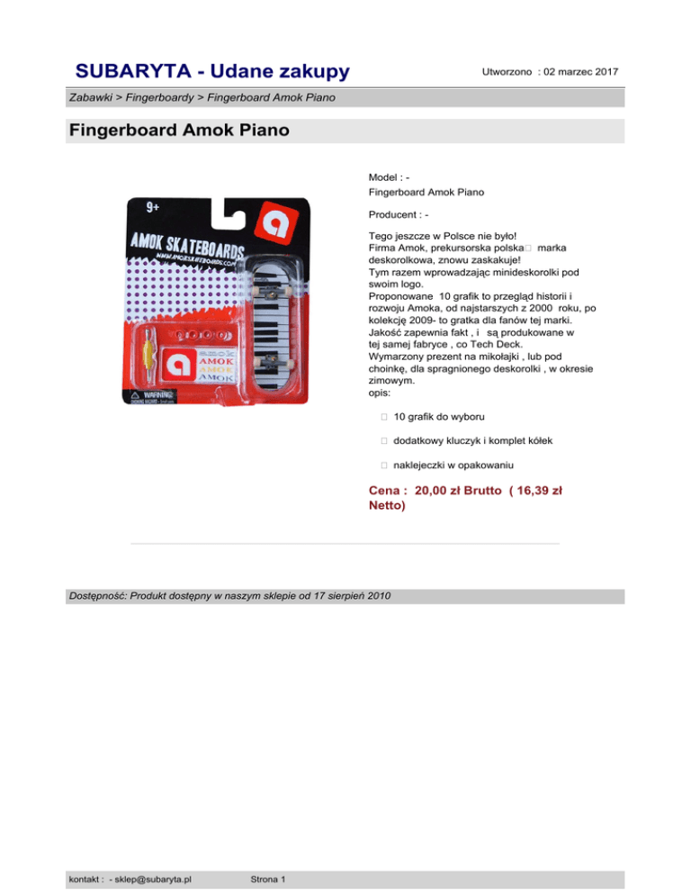 SUBARYTA - Udane zakupy Utworzono : 02 marzec 2017 Zabawki > Fingerboardy > Fingerboard Amok Piano Fingerboard Amok Piano Model : Fingerboard Amok Piano Producent : Tego jeszcze w Polsce nie było! Firma Amok, prekursorska polska� marka deskorolkowa, znowu zaskakuje! Tym razem wprowadzając minideskorolki pod swoim logo. Proponowane 10 grafik to przegląd historii i rozwoju Amoka, od najstarszych z 2000 roku, po kolekcję 2009- to gratka dla fanów tej marki. Jakość zapewnia fakt , iż są produkowane w tej samej fabryce , co Tech Deck. Wymarzony prezent na mikołajki , lub pod choinkę, dla spragnionego deskorolki , w okresie zimowym. opis: � 10 grafik do wyboru � dodatkowy kluczyk i komplet kółek � naklejeczki w opakowaniu Cena : 20,00 zł Brutto ( 16,39 zł Netto) Dostępność: Produkt dostępny w naszym sklepie od 17 sierpień 2010 kontakt : - [email protected] Strona 1