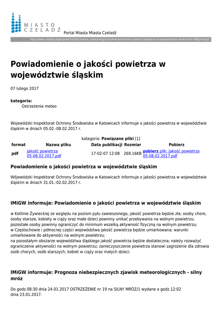 Portal Miasta Miasta Czeladź http://www.czeladz.pl/gospodarka/Ostrzezenia_meteorologiczne/Powiadomienie-o-jakosci-powietrza-w-wojewodztwie-slaskim/idn:498/printpdf Powiadomienie o jakości powietrza w województwie śląskim 07 lutego 2017 kategoria: Ostrzeżenia meteo Wojewódzki Inspektorat Ochrony Środowiska w Katowicach informuje o jakości powietrza w województwie śląskim w dniach 05.02.-08.02.2017 r. format pdf Nazwa pliku Jakość powietrza 05-08.02.2017.pdf kategoria: Powiązane pliki [1] Data publikacji Rozmiar 17-02-07 12:08 269.16KB Pobierz pobierz plik: Jakość powietrza 05-08.02.2017.pdf Powiadomienie o jakości powietrza w województwie śląskim Wójewódzki Inspektorat Ochrony Środowiska w Katowicach informuje o jakości powietrza w województwie śląskim w dniach 31.01.-02.02.2017 r. IMiGW informuje: Powiadomienie o jakości powietrza w województwie śląskim w Kotlinie Żywieckiej ze względu na poziom pyłu zawieszonego, jakość powietrza będzie zła; osoby chore, osoby starsze, kobiety w ciąży oraz małe dzieci powinny unikać przebywania na wolnym powietrzu; pozostałe osoby powinny ograniczyć do minimum wszelką aktywność fizyczną na wolnym powietrzu; w Częstochowie i północnej części województwa jakość powietrza będzie umiarkowana; warunki umiarkowane do aktywności na wolnym powietrzu; na pozostałym obszarze województwa śląskiego jakość powietrza będzie dostateczna; należy rozważyć ograniczenie aktywności na wolnym powietrzu; zanieczyszczenie powietrza stanowi zagrożenie dla zdrowia osób chorych, osób starszych, kobiet w ciąży oraz małych dzieci. IMiGW informuje: Prognoza niebezpiecznych zjawisk meteorologicznych - silny mróz Do godz.08:30 dnia 24.01.2017 OSTRZEŻENIE nr 19 na SILNY MRÓZ/1 wydane o godz.12:02 dnia 23.01.2017. Od godz. 07:30 dnia 26.01.2017 do godz. 07:30 dnia 27.01.2017. Prognozuje się temperaturę minimalną w nocy od -11°C do -8°C, lokalnie w dolinach i kotlinach górskich spadek temperatury do -18°C. Prognozowana średnia prędkość wiatru do 15 km/h. IMiGW informuje: Prognoza niebezpiecznych zjawisk meteorologicznych - silny mróz Do godz.10:00 dnia 09.01.2017 OSTRZEŻENIE nr 7 na SILNY MRÓZ/1 wydane o godz.17:28 dnia 07.01.2017. Do godz.10:00 dnia 09.01.2017 OSTRZEŻENIE nr 8 na SILNY MRÓZ/1 wydane o godz.17:29 dnia 07.01.2017. Do godz.10:00 dnia 09.01.2017 OSTRZEŻENIE nr 9 na SILNY MRÓZ/2 wydane o godz.17:34 dnia 07.01.2017. W nocy 09/10.01.2017 prognozuje się temperaturę minimalną od -19°C do -16°C, w rejonach podgórskich lokalnie spadek temperatury do -22°C. Prognozowana średnia prędkość wiatru do 10 km/h. Prognozuje się temperaturę minimalną od -15°C do -12°C, w rejonach podgórskich lokalnie spadek temperatury do -19°C. Prognozowana średnia prędkość wiatru do 10 km/h. IMiGW informuje: Prognoza niebezpiecznych zjawisk meteorologicznych - upał Prognozuje się temperaturę maksymalną w dzień od 29°C do 31°C. Temperatura minimalna w nocy od 15°C do 17°C. IMiGW informuje: Ostrzeżenie meteorologiczne Nr 76 - silne burze z gradem Instytut Meteorologii i Gospodarki Wodnej ostrzega: silne burze z gradem. Ostrzeżenie meteorologiczne Nr 75 - burze z gradem Instytut Meteorologii i Gospodarki Wodnej ostrzega: silne burze z gradem. IMiGW informuje: Prognoza niebezpiecznych zjawisk meteorologicznych intensywne opady deszczu, burze z gradem Prognozuje się wystąpienie opadów deszczu o natężeniu umiarkowanym, lokalnie silnym. Prognozowana wysokość opadów od 10 mm do 20 mm, lokalnie 40 mm. Opady w nocy z wtorku na środę. Prognozuje się wystąpienie burz z opadami deszczu od 20 mm do 30 mm, lokalnie do 40 mm oraz porywami wiatru do 75 km/h. Lokalnie możliwy grad. Ostrzeżenie meteorologiczne Nr 65 - burze z gradem Instytut Meteorologii i Gospodarki Wodnej ostrzega: burze z gradem. Ostrzeżenie meteorologiczne Nr 64 - upał Instytut Meteorologii i Gospodarki Wodnej ostrzega: upał. Informacja w związku z prognozowanymi upałami INFORMACJA dotycząca prognozowanych upałów Zgodnie z prognozą IMGW w ciągu najbliższych dni (23-26 czerwca) na obszarze całego kraju będzie utrzymywała się bardzo wysoka temperatura (od 30°C do 35°C). W weekend (25/26) można spodziewać się burz, miejscami z gradem, głównie w południowo-zachodniej części kraju. Utrzymywanie się wysokiej temperatury powietrza na obszarze całego kraju przez niemal tydzień może mieć negatywne skutki dla zdrowia i życia ludzi, ruchu kołowego i szynowego, funkcjonowania systemu elektroenergetycznego i sieci wodociągowej, a także dla zagrożenia pożarowego w lasach. Ostrzeżenie meteorologiczne nr 51 Instytut Meteorologii i Gospodarki Wodnej ostrzega: burze z gradem. Ostrzeżenie meteorologiczne - burze Biuro: Centralne Biuro Prognoz Meteorologicznych Obszar: województwo śląskie Ważność: od 2016-05-31 12:00:00 do 2016-05-31 23:00:00 Przebieg: Prognozuje się wystąpienie burz z opadami deszczu od 15 mm do 25 mm oraz porywami wiatru do 65 km/h. Lokalnie grad. Prawdopodobieństwo: 80% Uwagi: Brak. Czas wydania: 2016-05-31 06:19:00 Synoptyk: Szymon Pysz źródła informacji. - IMGW-PIB. Kraków. B-SM.ZK. a.duda Informacja o jakości powietrza 10.05.2016 Wojewódzkiego Inspektoratu Ochrony Środowiska w Katowicach. Wojewódzki Inspektorat Ochrony Środowiska w Katowicach w oparciu o dane uzyskane w ramach śląskiego monitoringu jakości powietrza informuje, że w dniu 10.05.2016 r. w godzinach przedpołudniowych nie wystąpiły przekroczenia dopuszczalnego poziomu stężeń jednogodzinnych dwutlenku siarki, dwutlenku azotu, ośmiogodzinnych stężeń tlenku węgla oraz ośmiogodzinnego poziomu docelowego ozonu. Szczegóły w załączniku. Informacja o jakości powietrza 28.04.2016 Wojewódzkiego Inspektoratu Ochrony Środowiska w Katowicach. Wojewódzki Inspektorat Ochrony Środowiska w Katowicach w oparciu o dane uzyskane w ramach śląskiego monitoringu jakości powietrza inform