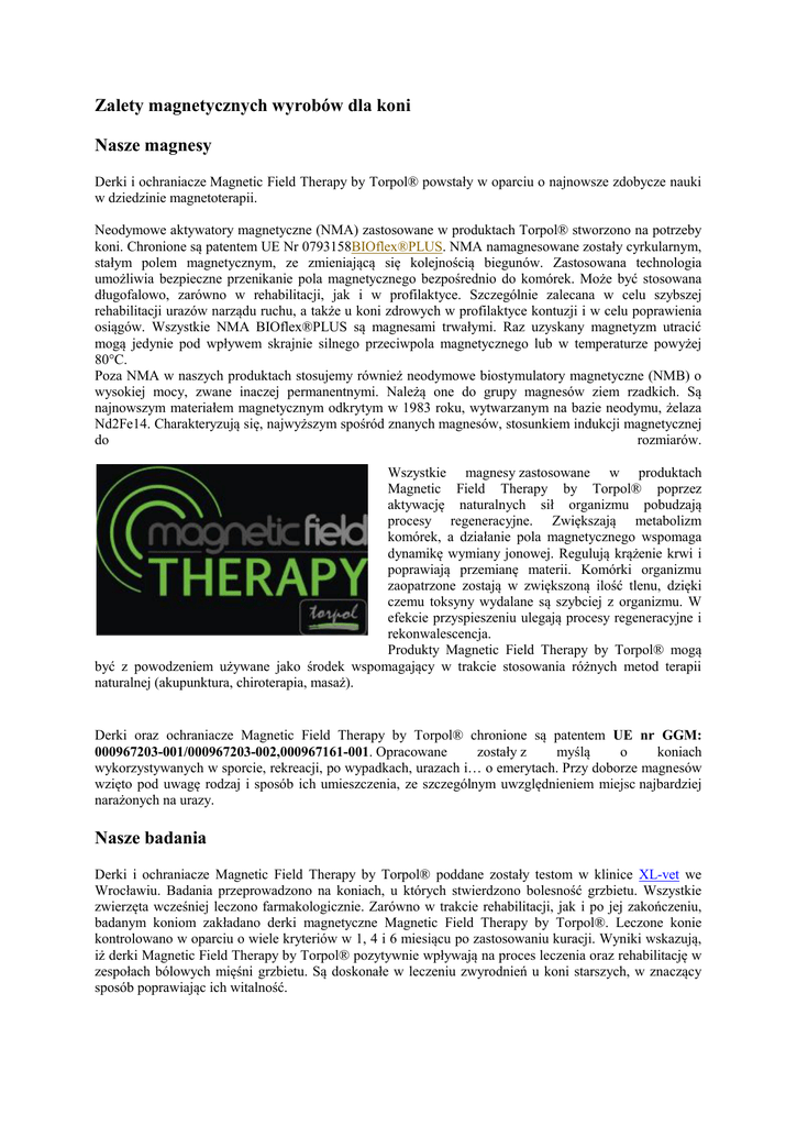 Zalety magnetycznych wyrobów dla koni Nasze magnesy Derki i ochraniacze Magnetic Field Therapy by Torpol® powstały w oparciu o najnowsze zdobycze nauki w dziedzinie magnetoterapii. Neodymowe aktywatory magnetyczne (NMA) zastosowane w produktach Torpol® stworzono na potrzeby koni. Chronione są patentem UE Nr 0793158BIOflex®PLUS. NMA namagnesowane zostały cyrkularnym, stałym polem magnetycznym, ze zmieniającą się kolejnością biegunów. Zastosowana technologia umożliwia bezpieczne przenikanie pola magnetycznego bezpośrednio do komórek. Może być stosowana długofalowo, zarówno w rehabilitacji, jak i w profilaktyce. Szczególnie zalecana w celu szybszej rehabilitacji urazów narządu ruchu, a także u koni zdrowych w profilaktyce kontuzji i w celu poprawienia osiągów. Wszystkie NMA BIOflex®PLUS są magnesami trwałymi. Raz uzyskany magnetyzm utracić mogą jedynie pod wpływem skrajnie silnego przeciwpola magnetycznego lub w temperaturze powyżej 80°C. Poza NMA w naszych produktach stosujemy również neodymowe biostymulatory magnetyczne (NMB) o wysokiej mocy, zwane inaczej permanentnymi. Należą one do grupy magnesów ziem rzadkich. Są najnowszym materiałem magnetycznym odkrytym w 1983 roku, wytwarzanym na bazie neodymu, żelaza Nd2Fe14. Charakteryzują się, najwyższym spośród znanych magnesów, stosunkiem indukcji magnetycznej do rozmiarów. Wszystkie magnesy zastosowane w produktach Magnetic Field Therapy by Torpol® poprzez aktywację naturalnych sił organizmu pobudzają procesy regeneracyjne. Zwiększają metabolizm komórek, a działanie pola magnetycznego wspomaga dynamikę wymiany jonowej. Regulują krążenie krwi i poprawiają przemianę materii. Komórki organizmu zaopatrzone zostają w zwiększoną ilość tlenu, dzięki czemu toksyny wydalane są szybciej z organizmu. W efekcie przyspieszeniu ulegają procesy regeneracyjne i rekonwalescencja. Produkty Magnetic Field Therapy by Torpol® mogą być z powodzeniem używane jako środek wspomagający w trakcie stosowania różnych metod terapii naturalnej (akupunktura, chiroterapia, masaż). Derki oraz ochraniacze Magnetic Field Therapy by Torpol® chronione są patentem UE nr GGM: 000967203-001/000967203-002,000967161-001. Opracowane zostały z myślą o koniach wykorzystywanych w sporcie, rekreacji, po wypadkach, urazach i… o emerytach. Przy doborze magnesów wzięto pod uwagę rodzaj i sposób ich umieszczenia, ze szczególnym uwzględnieniem miejsc najbardziej narażonych na urazy. Nasze badania Derki i ochraniacze Magnetic Field Therapy by Torpol® poddane zostały testom w klinice XL-vet we Wrocławiu. Badania przeprowadzono na koniach, u których stwierdzono bolesność grzbietu. Wszystkie zwierzęta wcześniej leczono farmakologicznie. Zarówno w trakcie rehabilitacji, jak i po jej zakończeniu, badanym koniom zakładano derki magnetyczne Magnetic Field Therapy by Torpol®. Leczone konie kontrolowano w oparciu o wiele kryteriów w 1, 4 i 6 miesiącu po zastosowaniu kuracji. Wyniki wskazują, iż derki Magnetic Field Therapy by Torpol® pozytywnie wpływają na proces leczenia oraz rehabilitację w zespołach bólowych mięśni grzbietu. Są doskonałe w leczeniu zwyrodnień u koni starszych, w znaczący sposób poprawiając ich witalność. W trakcie prowadzenia badań u koni stwierdzono zwiększenie elastyczności poprawę wytrzymałości w trakcie intensywnych treningów brak znacznego spadku formy po treningach i/lub zawodach eliminację objawów bólowych ze strony kręgosłupa odbudowę mięśni grzbietu wzrost witalności i znaczącą poprawę w zakresie narządu ruchu Terapii magnetycznej nie należy stosować u zwierząt w okresie ciąży, w trakcie leczenia otwartych ran, bliznowca (dzikiego mięsa) oraz procesów nowotworowych. Produktów zaopatrzonych w magnesy nie należy przechowywać w miejscach, w których przebywają osoby z rozrusznikami serca, urządzeniami elektroinsulinowymi, kobiety w ciąży lub w pobliżu magnetycznych nośników danych. W przypadku pytań lub wątpliwości w zakresie stosowania terapii magnetycznej zaleca się konsultacje z lekarzem weterynarii. Schorzenia, przy leczeniu których derki Magnetic Field Therapy by Torpol® dają pozytywne efekty dysfunkcje, w tym kontuzje aparatu ruchu: zwyrodnienie mięśni i zmiany kośćca okolicy lędźwi, stany zapalne mięśni grzbietu, mięśni pośladkowych, mięśni obręczy barkowej miopatia powysiłkowa o charakterze metabolicznym, jak mięśniochwat porażenny zmniejszenie objawów bólowych w stanach zapalnych i zwyrodnieniowych w obrębie stawów i kręgosłupa w odcinku lędźwiowo - piersiowym łagodzenie bólu różnego pochodzenia, w tym bólu o nierozpoznanej podstawie zmniejszenie, usunięcie sztywności mięśni i obrzęków. Choroby, w leczeniu których zalecane jest stosowanie ochraniaczy Magnetic Field Therapy by Torpol® dysfunkcje, w tym kontuzje aparatu ruchu: schorzenia ścięgien i stawów kończyn przednich i tylnych, zmiany kośćca, stany zapalne mięśni miopatia powysiłkowa o charakterze metabolicznym, jak mięśniochwat porażenny zmniejszenie objawów bólowych w stanach zapalnych i zwyrodnieniowych w obrębie stawów łagodzenie bólu różnego pochodzenia, w tym bólu o nierozpoznanej podstawie zmniejszenie, usunięcie sztywności mięśni i stawów, ich obrzęków jak w przypadku artrozy