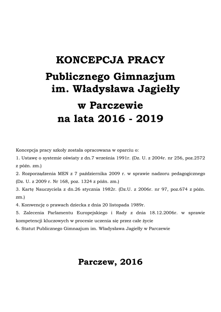 KONCEPCJA PRACY Publicznego Gimnazjum im. Władysława Jagiełły w Parczewie na lata 2016 - 2019 Koncepcja pracy szkoły została opracowana w oparciu o: 1. Ustawę o systemie oświaty z dn.7 września 1991r. (Dz. U. z 2004r. nr 256, poz.2572 z późn. zm.) 2. Rozporządzenia MEN z 7 października 2009 r. w sprawie nadzoru pedagogicznego (Dz. U. z 2009 r. Nr 168, poz. 1324 z późn. zm.) 3. Kartę Nauczyciela z dn.26 stycznia 1982r. (Dz.U. z 2006r. nr 97, poz.674 z późn. zm.) 4. Konwencję o prawach dziecka z dnia 20 listopada 1989r. 5. Zalecenia Parlamentu Europejskiego i Rady z dnia 18.12.2006r. w sprawie kompetencji kluczowych w procesie uczenia się przez całe życie 6. Statut Publicznego Gimnazjum im. Władysława Jagiełły w Parczewie Parczew, 2016 Charakterystyka szkoły Dane ogólne szkoły: Publiczne Gimnazjum im. Władysława Jagiełły ul. Spółdzielcza 7, 21-200 Parczew tel/fax (83) 355 12 40 www.gimparczew.pl e-meil: [email protected] Szkoła jest jedynym gimnazjum na terenie Gminy Parczew. Budynek Gimnazjum usytuowany jest w centrum miasta, niedaleko stadionu MOSiR. Uczęszczają do niej uczniowie zarówno z Parczewa, jak i wiosek na terenie Gminy (Koczerg, Królewskiego Dworu, Wierzbówki, Jasionki, Zaniówki, Przewłoki, Woli Przewłockiej, Siedlików, Sowina, Lasek, Buradowa, Tyśmienicy, Komarnego) oraz spoza obwodu szkoły. Uczniowie mają zapewniony dowóz oraz opiekę świetlicy szkolnej. Historia i tradycja szkoły Szkoła powstała w 2001 roku w wyniku reformy oświatowej. Jej dyrektorem została wówczas mgr Teresa Ciesielska. W dniu 23.10.2004r. szkole nadano imię Władysława Jagiełły oraz wręczono sztandar. Szkoła utrzymuje kontakty z innymi szkołami jagiellońskimi, m.in. przez organizację i udział w zlotach szkół jagiellońskich. W roku szkolnym 2012/2013 Gimnazjum uzyskało tytuł „Szkoły Odkrywców Talentów” Kadra szkoły W szkole zatrudnionych jest 50 nauczycieli, z czego 4 ma stopień nauczyciela kontraktowego, 13 – nauczyciela mianowanego, a 33 jest nauczycieli dyplomowanych. W gronie pedagogicznym oprócz dydaktyków są: bibliotekarze, wychowawcy świetlicy, pedagog szkolny i psycholog. Większość nauczycieli ma uprawnienia do nauczania więcej niż jednego przedmiotu lub prowadzenia zajęć specjalistycznych. Baza szkoły Placówka dysponuje 23 salami lekcyjnymi, w tym pracownią fizyczną, biologiczną, chemiczną, 2 pracowniami informatycznymi, z których każda jest wyposażona w 10 komputerów. W ponad połowie sal znajdują się projektory multimedialne lub tablice interaktywne. Częściowo na terenie szkoły zapewniony jest dla nauczycieli dostęp do sieci Internet. Od roku 2015 funkcjonują dwie pracownie do zajęć rewalidacyjnych i nauczania indywidualnego. Mamy też salę gimnastyczną i siłownię a obok Gimnazjum usytuowany jest kompleks sportowy „Orlik” z boiskami do piłki nożnej, piłki siatkowej, piłki koszykowej, obiekt umożliwia również grę w tenisa ziemnego i badmintona oraz uprawianie lekkoatletyki. W szkole znajduje się również biblioteka wraz z Internetowym Centrum Informacji Multimedjalnej. Szkoła wyposażona jest w kuchnię i stołówkę. Na terenie Gimnazjum znajduje się pracownia modelarska. Uczniowie szkoły korzystają też z basenu na Kompleksie Sportowo – Rekreacyjnym „Jelonek” usytuowanego przy Szkole Podstawowej nr 2. W szkole znajduje się gabinet pielęgniarki szkolnej. Bezpieczeństwo uczniów na terenie szkoły jest zapewnione m.in. dzięki monitoringowi wizyjnemu Uczniowie W roku szkolnym 2015/2016 w Gimnazjum uczy się 440 uczniów w wieku od 13 do 21 lat. W klasach po 6 oddziałów. Klasy liczą od 20 do 31 osób. Do szkoły uczęszcza obecnie 14 uczniów z orzeczeniami o potrzebie kształcenia specjalnego, w tym 8 uczy się w systemie klasowo- lekcyjnym, a 6 jest objętych nauczaniem indywidualnym. Są to dzieci z niepełnosprawnością ruchową, z niepełnosprawnością intelektualną. W szkole jest też jeden uczeń z orzeczeniem o potrzebie zajęć rewalidacyjno – wychowawczych – zajęcia te prowadzone są indywidualnie w domu ucznia. Otoczenie szkoły Parczew jest małym miastem powiatowym. Nie występuje tu przemysł. Zakłady pracy są niewielkie. Większość zatrudnienia mieszkańcy znajdują w strefie usługowo - handlowej lub administracji. Uczniowie pochodzący ze wsi wywodzą się w większości z rodzin rolniczych. Dużym problemem jest obecnie migracja rodziców za granicę w celach zarobkowych i pozostawianie dzieci pod opieką jednego rodzica, dziadków bądź innych osób. Misja szkoły Publiczne Gimnazjum im. Władysława Jagiełły w Parczewie istnieje po to, aby kształcić i wychowywać młode pokolenie mieszkańców gminy Parczew. Warunkiem efektywności pracy szkoły jest ścisłe powiązanie oddziaływań dydaktycznych, wychowawczych i profilaktycznych. Chcemy rozbudzać w uczniach ciekawość świata i zachodzących w nim zmian oraz kształtować poczucie odpowiedzialności za podjęte działania i przyjęte na siebie obowiązki. Wizja szkoły Szkoła wyposaża uczniów w wiedzę, umiejętności i właściwe postawy. Szczególną uwagę nauczyciele zwracają na kształtowanie kompetencji kluczowych, które wskazane zostały w „Zaleceniu Parlamentu Europejskiego i Rady Unii Europejskiej z dnia 18.12.2006 r. w sprawie kompetencji kluczowych w procesie uczenia się przez całe życie”. Wyposażenie uczniów w te umiejętności pozwoli im lepiej uczyć się teraz oraz w przyszłości na dalszych etapach kształcenia, a także będzie pomocne do osiągania celów społecznych w życiu dojrzałym. Zgodnie z wyznaczonym kierunkiem wzmacnianie bezpieczeństwa uczniów w szkołach i placówkach jest jednym z określonych przez Minister Edukacji Narodowej kierunków polityki oświatowej państwa kontynuowanych w roku szkolnym 2016/17. Szkoła realizując Rządowy Program na lata 2014-2020 „Bezpieczna i przyjazna szkoła” stara się zwróci