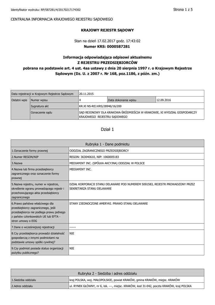 Strona 1 z 5 Identyfikator wydruku: RP/587281/4/20170217174302 CENTRALNA INFORMACJA KRAJOWEGO REJESTRU SĄDOWEGO KRAJOWY REJESTR SĄDOWY Stan na dzień 17.02.2017 godz. 17:43:02 Numer KRS: 0000587281 Informacja odpowiadająca odpisowi aktualnemu Z REJESTRU PRZEDSIĘBIORCÓW pobrana na podstawie art. 4 ust. 4aa ustawy z dnia 20 sierpnia 1997 r. o Krajowym Rejestrze Sądowym (Dz. U. z 2007 r. Nr 168, poz.1186, z późn. zm.) Data rejestracji w Krajowym Rejestrze Sądowym 20.11.2015 Ostatni wpis Numer wpisu 4 Sygnatura akt KR.XI NS-REJ.KRS/28946/16/200 Oznaczenie sądu SĄD REJONOWY DLA KRAKOWA-ŚRÓDMIEŚCIA W KRAKOWIE, XI WYDZIAŁ GOSPODARCZY KRAJOWEGO REJESTRU SĄDOWEGO Data dokonania wpisu 12.09.2016 Dział 1 Rubryka 1 - Dane podmiotu 1.Oznaczenie formy prawnej ODDZIAŁ ZAGRANICZNEGO PRZEDSIĘBIORCY 2.Numer REGON/NIP REGON: 363040610, NIP: 1060005183 3.Nazwa MEDIAMINT INC. (SPÓŁKA AKCYJNA) ODDZIAŁ W POLSCE 4.Nazwa lub firma przedsiębiorcy zagranicznego oraz oznaczenie formy prawnej MEDIAMINT INC. 5.Nazwa rejestru, numer w rejestrze, określenie ogranu prowadzącego rejestr i przechowującego akta przedsiębiorcy zagranicznego DZIAŁ KORPORACJI STANU DELAWARE POD NUMEREM 5091583, REJESTR PROWADZONY PRZEZ SEKRETARZA STANU DELAWARE 6.Prawo państwa właściwego dla przedsiębiorcy zagranicznego, jeśli przedsiębiorca nie podlega prawu jednego z państw członkowskich UE lub EFTA stron umowy o EOG STANY ZJEDNOCZONE AMERYKI. PRAWO STANU DELAWARE 7.Dane o wcześniejszej rejestracji ------ 8.Czy przedsiębiorca prowadzi działalność gospodarczą z innymi podmiotami na podstawie umowy spółki cywilnej? NIE 9.Czy podmiot posiada status organizacji pożytku publicznego? NIE Rubryka 2 - Siedziba i adres oddziału 1.Siedziba oddziału kraj POLSKA, woj. MAŁOPOLSKIE, powiat KRAKÓW, gmina KRAKÓW, miejsc. KRAKÓW 2.Adres oddziału ul. RYNEK GŁÓWNY, nr 6, lok. ---, miejsc. KRAKÓW, kod 31-042, poczta KRAKÓW, kraj POLSKA Strona 2 z 5 Identyfikator wydruku: RP/587281/4/20170217174302 3.Siedziba i adres zakładu głównego przedsiębiorcy zagranicznego kraj STANY ZJEDNOCZONE, woj. HRABSTWO NEW CASTLE, powiat ---, gmina ---, miejsc. WILMINGTON ul. CONCORD PIKE, nr 1521, lok. 301, kod 19803, poczta WILMINGTON 4.Adres poczty elektronicznej ------ 5.Adres strony internetowej ------ Dział 2 Rubryka 1 - Organ uprawniony do reprezentowania zagranicznego przedsiębiorcy 1.Nazwa organu uprawnionego do reprezentowania podmiotu ZARZĄD 2.Sposób reprezentacji zagranicznego przedsiębiorcy KAŻDY CZŁONEK ZARZĄDU SAMODZIELNIE Podrubryka 1 Dane osób wchodzących w skład organu 1 2 3 1.Nazwisko / Nazwa lub firma VUCHI 2.Imiona ADITYA 3.Funkcja w organie reprezentującym CZŁONEK ZARZĄDU 1.Nazwisko / Nazwa lub firma MARUPURU 2.Imiona NEELIMA 3.Funkcja w organie reprezentującym CZŁONEK ZARZĄDU 1.Nazwisko / Nazwa lub firma M REDDY 2.Imiona NIDHI 3.Funkcja w organie reprezentującym CZŁONEK ZARZĄDU Rubryka 2 - Organ nadzoru Brak wpisów Rubryka 3 - Prokurenci Brak wpisów Rubryka 4 - Osoby reprezentujące zagranicznego przedsiębiorcę w oddziale 1 1.Nazwisko VUCHI 2.Imiona ADITYA 3.Numer PESEL --- Dział 3 Rubryka 1 - Przedmiot działalności 1.Przedmiot przeważającej działalności przedsiębiorcy 1 73, 11, Z, DZIAŁALNOŚĆ AGENCJI REKLAMOWYCH Strona 3 z 5 Identyfikator wydruku: RP/587281/4/20170217174302 2.Przedmiot pozostałej działalności przedsiębiorcy 1 58, 19, Z, POZOSTAŁA DZIAŁALNOŚĆ WYDAWNICZA 2 58, 29, Z, DZIAŁALNOŚĆ WYDAWNICZA W ZAKRESIE POZOSTAŁEGO OPROGRAMOWANIA 3 59, 11, Z, DZIAŁALNOŚĆ ZWIĄZANA Z PRODUKCJĄ FILMÓW, NAGRAŃ WIDEO I PROGRAMÓW TELEWIZYJNYCH 4 61, , , TELEKOMUNIKACJA 5 62, , , DZIAŁALNOŚĆ ZWIĄZANA Z OPROGRAMOWANIEM I DORADZTWEM W ZAKRESIE INFORMATYKI ORAZ DZIAŁALNOŚĆ POWIĄZANA 6 63, 11, Z, PRZETWARZANIE DANYCH; ZARZĄDZANIE STRONAMI INTERNETOWYMI (HOSTING) I PODOBNA DZIAŁALNOŚĆ 7 70, 22, Z, POZOSTAŁE DORADZTWO W ZAKRESIE PROWADZENIA DZIAŁALNOŚCI GOSPODARCZEJ I ZARZĄDZANIA 8 73, 1, , REKLAMA 9 74, 90, Z, POZOSTAŁA DZIAŁALNOŚĆ PROFESJONALNA, NAUKOWA I TECHNICZNA, GDZIE INDZIEJ NIESKLASYFIKOWANA Rubryka 2 - Wzmianki o złożonych dokumentach Brak wpisów Rubryka 3 Brak wpisów Rubryka 4 - Przedmiot działalności statutowej organizacji pożytku publicznego Brak wpisów Rubryka 5 - Informacja o dniu kończącym rok obrotowy 1.Dzień kończący pierwszy rok obrotowy, za który należy złożyć sprawozdanie finansowe 31.12.2016 Dział 4 Rubryka 1 - Zaległości Brak wpisów Rubryka 2 - Wierzytelności Brak wpisów Strona 4 z 5 Identyfikator wydruku: RP/587281/4/20170217174302 Rubryka 3 - Informacje o oddaleniu wniosku o ogłoszenie upadłości na podstawie art. 13 ustawy z 28 lutego 2003 r. Prawo upadłościowe albo o zabezpieczeniu majątku dłużnika w postępowaniu w przedmiocie ogłoszenia upadłości albo w postępowaniu restrukturyzacyjnym albo po prawomocnym umorzeniu postępowania restrukturyzacyjnego Brak wpisów Rubryka 4 - Umorzenie prowadzonej przeciwko podmiotowi egzekucji z uwagi na fakt, że z egzekucji nie uzyska się sumy wyższej od kosztów egzekucyjnych Brak wpisów Dział 5 Nie dotyczy Dział 6 Rubryka 1 - Likwidacja Brak wpisów Rubryka 2 - Informacje o rozwiązaniu lub unieważnieniu podmiotu Brak wpisów Rubryka 3 - Zarząd komisaryczny Brak wpisów Rubryka 4 - Informacja o połączeniu, podziale lub przekształceniu Brak wpisów Rubryka 5 - Informacja o postępowaniu upadłościowym Brak wpisów Rubryka 6 - Informacja o postępowaniu układowym Brak wpisów Rubryka 7 - Informacje o postępowaniach restrukturyzacyjnych lub o postępowaniu naprawczym Brak wpisów Strona 5 z 5 Identyfikator wydruku: RP/587281/4/20170217174302 Rubryka 8 - Informacja o zawieszeniu działalności gospodarczej Brak wpisów data sporządzenia wydruku 17.02.2017 adres strony internetowej, na której są dostępne informacje z rejestru: https://ems.ms.gov.pl