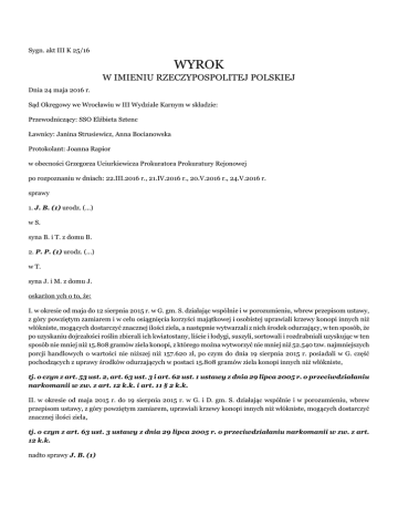 Sygn. akt III K 25/16 WYROK W IMIENIU RZECZYPOSPOLITEJ POLSKIEJ Dnia 24 maja 2016 r. Sąd Okręgowy we Wrocławiu w III Wydziale Karnym w składzie: Przewodniczący: SSO Elżbieta Sztenc Ławnicy: Janina Strusiewicz, Anna Bocianowska Protokolant: Joanna Rapior w obecności Grzegorza Uciurkiewicza Prokuratora Prokuratury Rejonowej po rozpoznaniu w dniach: 22.III.2016 r., 21.IV.2016 r., 20.V.2016 r., 24.V.2016 r. sprawy 1. J. B. (1) urodz. (...) w S. syna B. i T. z domu B. 2. P. P. (1) urodz. (...) w T. syna J. i M. z domu J. oskarżon ych o to, że: I. w okresie od maja do 12 sierpnia 2015 r. w G. gm. S. działając wspólnie i w porozumieniu, wbrew przepisom ustawy, z góry powziętym zamiarem i w celu osiągnięcia korzyści majątkowej i osobistej uprawiali krzewy konopi innych niż włókniste, mogących dostarczyć znacznej ilości ziela, a następnie wytwarzali z nich środek odurzający, w ten sposób, że po uzyskaniu dojrzałości roślin zbierali ich kwiatostany, liście i łodygi, suszyli, sortowali i rozdrabniali uzyskując w ten sposób nie mniej niż 15.808 gramów ziela konopi, z którego można wytworzyć nie mniej niż 52.540 tzw. najmniejszych porcji handlowych o wartości nie niższej niż 157.620 zł, po czym do dnia 19 sierpnia 2015 r. posiadali w G. część pochodzących z uprawy środków odurzających w postaci 15.808 gramów ziela konopi innych niż włókniste, tj. o czyn z art. 53 ust. 2, art. 63 ust. 3 i art. 62 ust. 1 ustawy z dnia 29 lipca 2005 r. o przeciwdziałaniu narkomanii w zw. z art. 12 k.k. i art. 11 § 2 k.k. II. w okresie od maja 2015 r. do 19 sierpnia 2015 r. w G. i D. gm. S. działając wspólnie i w porozumieniu, wbrew przepisom ustawy, z góry powziętym zamiarem, uprawiali krzewy konopi innych niż włókniste, mogących dostarczyć znacznej ilości ziela, tj. o czyn z art. 63 ust. 3 ustawy z dnia 29 lipca 2005 r. o przeciwdziałaniu narkomanii w zw. z art. 12 k.k. nadto sprawy J. B. (1) oskarżonego o to, że: III. w dniu 28 lipca 2015 r. w K. woj. (...), wbrew przepisom ustawy posiadał środki odurzające w postaci ziela konopi innych niż włókniste w ilości 15,54 grama t j. o czyn z art. 62 ust. 1 ustawy z dnia 29 lipca 2005 r. o przeciwdziałaniu narkomanii nadto sprawy P. P. (1) oskarżonego o to, że: IV. w dniu 28 lipca 2015 r. w T. woj. (...), wbrew przepisom ustawy posiadał środki odurzające w postaci ziela konopi innych niż włókniste w ilości 21,29 grama t j. o czyn z art. 62 ust. 1 ustawy z dnia 29 lipca 2005 r. o przeciwdziałaniu narkomanii I. oskarżonych J. B. (1) i P. P. (1) uznaje za winnych popełnienia czynów opisanych w punktach I i II części wstępnej wyroku, z tym, że ustala, iż dopuścili się tychże czynów działając nadto wspólnie i w porozumieniu z K. P. (1) oraz przyjmuje, iż stanowią one jedno przestępstwo z art. 53 ust. 2 i art. 63 ust. 3 ustawy z dnia 29 lipca 2005 r. o przeciwdziałaniu narkomanii (Dz.U. Nr 179, poz. 1485) w zw. z art. 11 § 2 k.k. w zw. z art. 12 k.k. i za to na podstawie art. 53 ust. 2 ww. ustawy w zw. z art. 11 § 3 k.k. wymierza im kary po 4 (cztery) lata pozbawienia wolności oraz kary po 500 (pięćset) stawek dziennych grzywny po 20 (dwadzieścia) złotych każda, II. oskarżonego J. B. (1) uznaje za winnego popełnienia czynu opisanego w pkt III części wstępnej wyroku, tj. czynu z art. 62 ust. 1 ustawy z dnia 29 lipca 2005 r. o przeciwdziałaniu narkomanii (Dz. U. Nr 179, poz.1485) i za to na podstawie tego przepisu wymierza mu karę 5 (pięciu) miesięcy pozbawienia wolności, III. oskarżonego P. P. (1) uznaje za winnego popełnienia czynu opisanego w pkt IV części wstępnej wyroku, tj. czynu z art. 62 ust. 1 ustawy z dnia 29 lipca 2005 r. o przeciwdziałaniu narkomanii (Dz.U. Nr 179, poz.1485) i za to na podstawie tego przepisu wymierza mu karę 5 (pięciu) miesięcy pozbawienia wolności, IV. na podstawie art. 85 k.k. i art. 86 § 1 k.k. wymierza oskarżonym J. B. (1) i P. P. (1) kary łączne po 4 (cztery) lata pozbawienia wolności, V. na podstawie art. 63 § 1 k.k. zalicza oskarżonym J. B. (1) i P. P. (1) na poczet wymierzonych im kar łącznych pozbawienia wolności okres tymczasowego aresztowania od dnia 19 sierpnia 2015 r. do dnia 20 maja 2016 r., VI. zasądza od Skarbu Państwa na rzecz adw. M. A. kwotę 1.402,20 złotych tytułem nieopłaconej obrony z urzędu oskarżonego P. P. (1), VII. zasądza od oskarżonych J. B. (2) i P. P. (1) na rzecz Skarbu Państwa wydatki spowodowane ich sprawami od dnia wszczęcia postępowania oraz wymierza im opłaty sądowe w kwotach po 2.400 złotych. Janina Strusiewicz Elżbieta Sztenc Anna Bocianowska Sygn. akt III K 25/16 UZASADNIENIE W toku przewodu sądowego ustalono następujący stan faktyczny: Na początku stycznia 2015 r. oskarżeni J. B. (1) i P. P. (1) poznali się na imprezie zorganizowanej przez ich wspólnego znajomego w miejscowości K., po czym rozmawiali m. in. na temat uprawy marihuany. W czasie rozmowy oskarżony P. P. (1) chwalił się, że potrafi prowadzić uprawę krzewów konopi, pokazując przy tym J. B. (1) zdjęcia, jakie miał w swoim telefonie komórkowym. W związku z tym, oskarżony J. B. (1) zaproponował wspólną uprawę marihuany w miejscu zamieszkania P. P. (1), tj. w T., na co tenże ostatni przystał. Następnie oskarżony J. B. (1) przywiózł w okresie późniejszym do miejsca zamieszkania oskarżonego P. P. (1) nasiona konopi, które miał także tenże ostatni, po czym wysiali je na wacie, w wyniku, czego wyrosło z nich 300 sadzonek. Po tymże, oskarżony P. P. (1) przesadził je do kubeczków z ziemią, które jednakże w kwietniu 2015 r. w jego miejscu zamieszkania zabezpieczyli funkcjonariusze policji, po czym zabrali je. dowód: wyjaśnienia oskarżonego P. P. (1) – k. 84-86, 119, 448, 454-456, 559-563, 569-571, 816-819 (Ds.), 168v-170 (III K); częściowo wyjaśnienia oskarżonego J. B. (1) – k. 441-442, 564-566 (Ds.), 172v-174 (III K). Początkowo oskarżony J. B