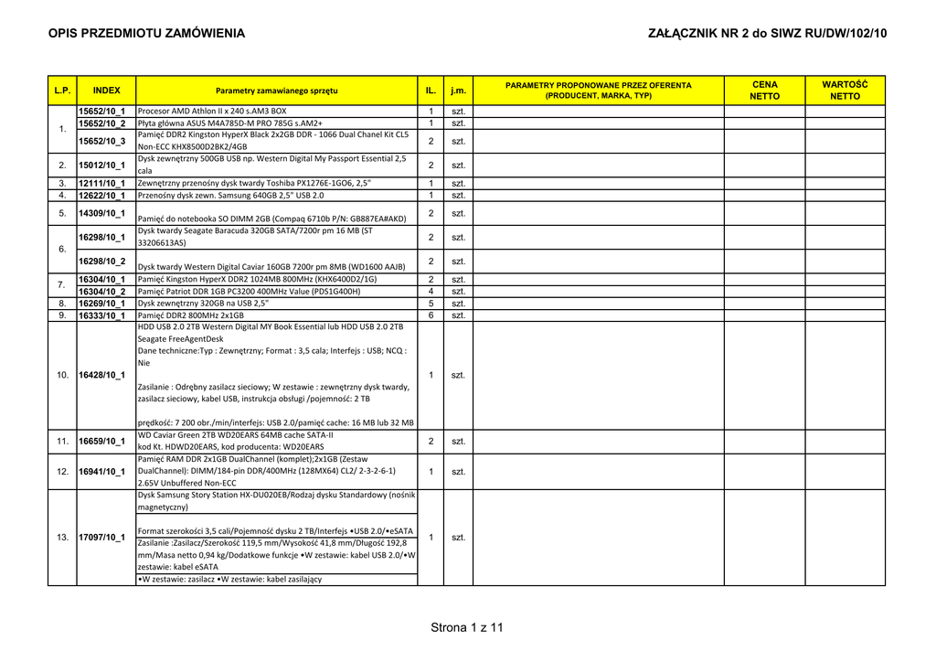 OPIS PRZEDMIOTU ZAMÓWIENIA L.P. 1. INDEX 15652/10_1 15652/10_2 15652/10_3 2. 15012/10_1 3. 4. 12111/10_1 12622/10_1 5. 14309/10_1 16298/10_1 6. 16298/10_2 8. 9. 16304/10_1 16304/10_2 16269/10_1 16333/10_1 10. 16428/10_1 7. Parametry zamawianego sprzętu Procesor AMD Athlon II x 240 s.AM3 BOX Płyta główna ASUS M4A785D-M PRO 785G s.AM2+ Pamięć DDR2 Kingston HyperX Black 2x2GB DDR - 1066 Dual Chanel Kit CL5 Non-ECC KHX8500D2BK2/4GB Dysk zewnętrzny 500GB USB np. Western Digital My Passport Essential 2,5 cala Zewnętrzny przenośny dysk twardy Toshiba PX1276E-1GO6, 2,5" Przenośny dysk zewn. Samsung 640GB 2,5" USB 2.0 Pamięć do notebooka SO DIMM 2GB (Compaq 6710b P/N: GB887EA#AKD) Dysk twardy Seagate Baracuda 320GB SATA/7200r pm 16 MB (ST 33206613AS) Dysk twardy Western Digital Caviar 160GB 7200r pm 8MB (WD1600 AAJB) Pamięć Kingston HyperX DDR2 1024MB 800MHz (KHX6400D2/1G) Pamięć Patriot DDR 1GB PC3200 400MHz Value (PDS1G400H) Dysk zewnętrzny 320GB na USB 2,5" Pamięć DDR2 800MHz 2x1GB HDD USB 2.0 2TB Western Digital MY Book Essential lub HDD USB 2.0 2TB Seagate FreeAgentDesk Dane techniczne:Typ : Zewnętrzny; Format : 3,5 cala; Interfejs : USB; NCQ : Nie ZAŁĄCZNIK NR 2 do SIWZ RU/DW/102/10 IL. j.m. 1 1 szt. szt. 2 szt. 2 szt. 1 1 szt. szt. 2 szt. 2 szt. 2 szt. 2 4 5 6 szt. szt. szt. szt. 1 szt. 2 szt. 1 szt. 1 szt. Zasilanie : Odrębny zasilacz sieciowy; W zestawie : zewnętrzny dysk twardy, zasilacz sieciowy, kabel USB, instrukcja obsługi /pojemność: 2 TB 11. 16659/10_1 12. 16941/10_1 13. 17097/10_1 prędkość: 7 200 obr./min/interfejs: USB 2.0/pamięć cache: 16 MB lub 32 MB WD Caviar Green 2TB WD20EARS 64MB cache SATA-II kod Kt. HDWD20EARS, kod producenta: WD20EARS Pamięć RAM DDR 2x1GB DualChannel (komplet);2x1GB (Zestaw DualChannel): DIMM/184-pin DDR/400MHz (128MX64) CL2/ 2-3-2-6-1) 2.65V Unbuffered Non-ECC Dysk Samsung Story Station HX-DU020EB/Rodzaj dysku Standardowy (nośnik magnetyczny) Format szerokości 3,5 cali/Pojemność dysku 2 TB/Interfejs •USB 2.0/•eSATA Zasilanie :Zasilacz/Szerokość 119,5 mm/Wysokość 41,8 mm/Długość 192,8 mm/Masa netto 0,94 kg/Dodatkowe funkcje •W zestawie: kabel USB 2.0/•W zestawie: kabel eSATA •W zestawie: zasilacz •W zestawie: kabel zasilający Strona 1 z 11 PARAMETRY PROPONOWANE PRZEZ OFERENTA (PRODUCENT, MARKA, TYP) CENA NETTO WARTOŚĆ NETTO OPIS PRZEDMIOTU ZAMÓWIENIA L.P. INDEX 14. 17376/10_1 15. 17375/10_1 16. 18190/10_1 18248/10_1 18248/10_2 17. 18248/10_3 18248/10_4 18322/10_1 18. 19. 18322/10_2 18322/10_3 18328/10_1 20. 17969/10_1 21. 18549/10_1 18549/10_2 18891/10_1 18891/10_2 18891/10_3 18891/10_4 22. 18891/10_5 Parametry zamawianego sprzętu Dysk zewnętrzny Toshiba orE Art 2,5'' 320GB, USB 2.0, zewnętrzny, niebieski (HDDR320E04EL_CS) Dysk twardy zewnętrzny 500GB Freeagent 500GB, USB 2.0; 2,5" dysk zewnętrzny VERBATIM HDD 2.5" 5400 RPM 500GB USB 2.0 47566 Dysk twardy o poj. 1TB (ST31000528AS) SATA II 32 MB Cache. Pamięci Kingston o oznaczeniu KVR*00D2N5K2/4g O POJ. 4GB (zestaw zawiera dwie kości po 2 GB) Wentylator komputerowy Be quiet! Silient Wings USC 120mm - wyposażony w miedziane łożysko ślizgowe FDB i pracujący z prędkością 1500 obr/min. Wyntylator komputerowy Fander Roxo 92mm Ultra Silent. Wentylator wyposażony w łożysko FDB i pracujący z prędkością 1200 obr/min. Nagrywarka Lite-ON Super AllWrite DVD+/-RW iHAS124-19 bulk black (Serial ATA) Kingston DDR 1GB PC-400 CL3 Kingston HyperX DDR2 2GB 1066MHz CL5 Obudowa NOX MEDIA II - bez zasilacza Seagate Expansion Portable 500GB USB 2,0 2,5 " ST905004EXD101-RK 1 GB DDR-400MHz CL3 1GB- DDR2-533MHz CL4 Kontroler Dysków PCI 3WARE SATA-II RAID 9650SE-4LP ML BULK Cechy techniczne w Załaczniku nr 1a Sieciowy kontroler dysków QNAP TS-419P Specyfikacja sprzętowa w Załaczniku nr 1a Dyski twarde Seagate 2TB Barracuda LowPower 5900.12 (32MB, Serial ATA II Kod producenta: ST32000542AS; Gwarancja 3 lata; prędkość obrotowa 5900.00 obr/min; pamięć cache 32MB technologia NCQ waga max. 655g Dyski twarde Seagate 500GB Baracuda 7200.12 (16MB, Serial ATA II) kod producenta:(ST3500418AS) Gwarancja 3 lata prędkośc obrotowa 7200.00 obr/min. Pamięć cache 16MB technologia NCQ waga max. 415.00 g Dysk twardy zewnętrzny VERBATIM Executive 500 GB Claret - Cechy techniczne w załaczniku 1a ZAŁĄCZNIK NR 2 do SIWZ RU/DW/102/10 IL. j.m. 4 szt. 3 szt. 1 szt. 2 szt. 2 szt. 5 szt. 5 szt. 2 szt. 4 2 1 szt. szt. szt. 1 szt. 6 6 szt. szt. 1 szt. 2 szt. 14 szt. 10 szt. 8 szt. Strona 2 z 11 PARAMETRY PROPONOWANE PRZEZ OFERENTA (PRODUCENT, MARKA, TYP) CENA NETTO WARTOŚĆ NETTO OPIS PRZEDMIOTU ZAMÓWIENIA L.P. INDEX IL. j.m. 2 szt. 18891/10_7 Napędy DVD RW Pioneer DVR-118L black (ATA) bulk Zapis: 22x DVD-R, 22x DVD+R, 6x DVD-RW, 8x DVD+RW, 12x DL+R9, 12x DLR9, 40x CD-R, 32x CD-RW; odczyt 16x DVD, 40x CD, 5x DVD-RAM; bufor 2MB+buffer underrun protection; czarny panel przedni, interfejs ATAPI 10 szt. 18933/10_1 Seagate Expansion Portable 500GB 2,0 2,5" ST905004EXD101-RK 1 szt. 19160/10_1 Dysk przenośny WD My Passport Essential 500GB USB 2,0 2,5 " WDBAAA5000ABK-EESN/ Format 2,5 cali/Pojemność 500 GB/ Prędkość obrotowa 5400 rpm/ Wersja interfejsu USB 2,0 /Maksymalny transfer zewnętrzny 60 Mbps/Wymiary 15 x 80 x 126 mm 1 szt. 1 szt. 1 szt. 1 szt. 2 szt. 2 szt. 18891/10_6 23. Parametry zamawianego sprzętu ZAŁĄCZNIK NR 2 do SIWZ RU/DW/102/10 24. 19160/10_2 25. 18994/10_1 26. 16016/10_1 27. 19364/10_1 28. 19490/10_1 Aluminiowa obudowa zewnętrzna do dysków twardych Producent Tracer , Gwarancja 2 latamaks. rozmiar urządzeń 3.50 cala obsługiwane urządzenia dyski twarde interfejs urządzeń SATA interfejs obudowy USB 2.0 obsługiwane systemy operacyjne Windows XP, Windows Vista, Windows7 Windows Me, Windows 98SE, Windows 2000 Aluminiowa obudowa na dyski 2.5" SATA Welland ME-940U USB 2.0/FireWire SATA 2,5'zgodna z USB 2.0 i IEEE 1394a,Chipset JMicro JMB252,Kompatybilna w dół - działa również z magistralą USB 1.1,Transfer do 480 Mbps, Współpraca 