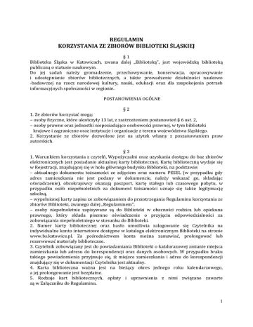 REGULAMIN KORZYSTANIA ZE ZBIORÓW BIBLIOTEKI ŚLĄSKIEJ §1 Biblioteka Śląska w Katowicach, zwana dalej „Biblioteką”, jest wojewódzką biblioteką publiczną o statusie naukowym. Do jej zadań należy gromadzenie, przechowywanie, konserwacja, opracowywanie i udostępnianie zbiorów bibliotecznych, a także prowadzenie działalności naukowo -badawczej na rzecz narodowej kultury, nauki, edukacji oraz dla zaspokojenia potrzeb informacyjnych społeczności w regionie. POSTANOWIENIA OGÓLNE §2 1. Ze zbiorów korzystać mogą: – osoby fizyczne, które ukończyły 13 lat, z zastrzeżeniem postanowień § 6 ust. 2, – osoby prawne oraz jednostki nieposiadające osobowości prawnej, w tym biblioteki krajowe i zagraniczne oraz instytucje i organizacje z terenu województwa śląskiego. 2. Korzystanie ze zbiorów dozwolone jest na użytek własny z poszanowaniem praw autorskich. §3 1. Warunkiem korzystania z czytelń, Wypożyczalni oraz uzyskania dostępu do baz zbiorów elektronicznych jest posiadanie aktualnej karty bibliotecznej. Kartę biblioteczną wydaje się w Rejestracji, znajdującej się w holu głównego budynku Biblioteki, na podstawie: – aktualnego dokumentu tożsamości ze zdjęciem oraz numeru PESEL (w przypadku gdy adres zamieszkania nie jest podany w dokumencie, należy wskazać go, składając oświadczenie), obcokrajowcy okazują paszport, kartę stałego lub czasowego pobytu, w przypadku osób niepełnoletnich za dokument tożsamości uznaje się także legitymację szkolną, – wypełnionej karty zapisu ze zobowiązaniem do przestrzegania Regulaminu korzystania ze zbiorów Biblioteki, zwanego dalej „Regulaminem”, – osoby niepełnoletnie zapisywane są do Biblioteki w obecności rodzica lub opiekuna prawnego, który składa pisemne oświadczenie o przyjęciu odpowiedzialności za zobowiązania niepełnoletniego w stosunku do Biblioteki. 2. Numer karty bibliotecznej oraz hasło umożliwia zalogowanie się Czytelnika na indywidualne konto internetowe dostępne w katalogu elektronicznym Biblioteki na stronie www.bs.katowice.pl. Za pośrednictwem konta można zamawiać, prolongować lub rezerwować materiały biblioteczne. 3. Czytelnik zobowiązany jest do powiadamiania Biblioteki o każdorazowej zmianie miejsca zamieszkania lub adresu do korespondencji oraz danych osobowych. W przypadku braku takiego powiadomienia przyjmuje się, iż miejsce zamieszkania i adres do korespondencji znajdujący się w dokumentacji Czytelnika jest aktualny. 4. Karta biblioteczna ważna jest na bieżący okres jednego roku kalendarzowego, a jej prolongowanie jest bezpłatne. 5. Rodzaje kart bibliotecznych, opłaty i uprawnienia z nimi związane zawarte są w Załączniku do Regulaminu. 1 §4 1. Dane osobowe gromadzone przez Bibliotekę są przetwarzane wyłącznie do celów statutowych określonych w Ustawie o bibliotekach i podlegają ochronie, zgodnie z Ustawą o ochronie danych osobowych. 2. Na wniosek Czytelnika (wzór druku dostępny w Rejestracji), który uregulował zobowiązania wobec Biblioteki i zwrócił kartę biblioteczną, jego dane osobowe zostają usunięte. 3. Dane Czytelnika, na którego koncie nie zarejestrowano żadnej operacji przez okres dłuższy niż 10 lat, a który uregulował wszystkie zobowiązania względem Biblioteki, są usuwane. §5 1. Czytelnik ponosi odpowiedzialność za posługiwanie się jego kartą biblioteczną przez osoby trzecie. 2. Utratę karty bibliotecznej należy niezwłocznie zgłosić w Wypożyczalni Biblioteki lub telefonicznie (nr tel. 32 208 37 46). §6 1. W Bibliotece zbiory udostępniane są w: – Wypożyczalni, – Wypożyczalni Międzybibliotecznej oraz – czytelniach: Czytelni Głównej, Czytelni Czasopism Bieżących, Czytelni Dokumentów Życia Społecznego, Czytelni Centrum Dokumentacji Europejskiej, Czytelni Samorządowej, Czytelni Śląskiej Biblioteki Filmowej, Czytelni Zbiorów Specjalnych, Czytelni Śląskiej Biblioteki Muzycznej, Czytelni Zbiorów Śląskich, Czytelni Działu Integracyjno-Biblioterapeutycznego (ul. Ligonia 7), Czytelni Sztuk Domu Oświatowego (ul. Francuska 12), Informatorium, a także w ramach korzystania z baz zbiorów, w których dostępne są materiały w formie elektronicznej. 2. W czytelniach, które obsługują Czytelników niepełnoletnich, poniżej 13. roku życia (Czytelnia Sztuk Domu Oświatowego, Czytelnia Działu Integracyjno-Biblioterapeutycznego), dopuszcza się stosowanie odrębnych regulacji porządkowych uwzględniających etap rozwoju danej grupy dzieci. §7 1. Czytelnicy ponoszą odpowiedzialność materialną za powierzone im zbiory od chwili przyjęcia do ich zwrotu. W momencie ich otrzymania Czytelnik winien sprawdzić, w jakim są stanie i zgłosić wszelkie zauważone uszkodzenia pod rygorem założenia, że powierzony materiał biblioteczny nie był uszkodzony. 2. Czytelnik powinien ostrożnie obchodzić się z udostępnionymi materiałami bibliotecznymi, zwłaszcza w przypadku korzystania ze zbiorów udostępnianych w Czytelni Zbiorów Specjalnych. Przy sporządzaniu notatek niedozwolone jest posługiwanie się takimi artykułami piśmienniczymi, które mogą zabrudzić materiały biblioteczne, np. pióra atramentowe, markery itp. 2 3. W materiałach bibliotecznych nieoprawnych Czytelnik winien zachować kolejność kart. WYPOŻYCZANIE ZBIORÓW §8 1. Materiały biblioteczne do Wypożyczalni należy zamawiać elektronicznie za pośrednictwem terminali znajdujących się na terenie Biblioteki lub online przez indywidualne konto Czytelnika. 2. Liczba możliwych do wypożyczenia materiałów bibliotecznych jest uzależniona od posiadanych uprawnień. Określa ją Załącznik do Regulaminu. 3. Zamówienia składane na godzinę przed zamknięciem Wypożyczalni są realizowane następnego dnia. 4. Książki nieodebrane z Wypożyczalni w ciągu 4 dni odsyłane są do magazynów. §9 1. W Bibliotece nie wypożycza się materiałów bibliotecznych wydanych do 1960 r. (materiały w