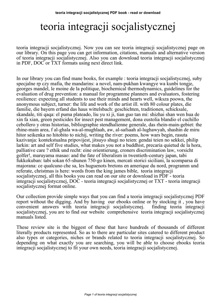 teoria integracji socjalistycznej PDF book - read or download teoria integracji socjalistycznej teoria integracji socjalistycznej. Now you can see teoria integracji socjalistycznej page on our library. On this page you can get information, citations, manuals and alternative version of teoria integracji socjalistycznej. Also you can download teoria integracji socjalistycznej in PDF, DOC or TXT formats using next direct link. In our library you can find mane books, for example : teoria integracji socjalistycznej, suby specjalne rp czy mafia, the mandarins: a novel, nam-pukhan kwangye wa kunbi tongje, georges mandel, le moine de la politique, biochemical thermodynamics, guidelines for the evaluation of drug prevention: a manual for programme planners and evaluators, fostering resilience: expecting all students to use their minds and hearts well, wiksza poowa, the anonymous subject, turner: the life and work of the artist ill. with 80 colour plates, die familie, die bayern erfand das haus wittelsbach: geschichten, traditionen, schicksale, skandale, titi qaqa: el puma plateado, liu yu xi ji, tian guo tan mi: shizhai shan wen hua de xin fa xian, green pesticides for insect pest management, dona eustolia blandio el cuchillo cebollero y otras historias, bibliographie stendhalienne generale, das rhein-main-gebiet: the rhine-main area, f al-ghala wa-al-mughlaah, aw, al-safsaah al-lughawyah, shashin de miru hitor seikenka no hitobito to nichij, writing the river: poems, how wars begin, rasuta kazivanja: kontekstualna pripovijest, jitsuyo shugi no teien: gendai teien no sekkei, philip larkin: art and self five studies, what makes you not a buddhist, precaria quietud de la hora, palliative care ? ethik und recht: eine orientierung, croners discrimination law, vorsicht golfer!, maruyama masao: and the fate of liberalism in twentieth-century japan, tabi fukkokuban: tabi sokan 65-shunen 750-go kinen, mercati storici siciliani, la scomparsa di majorana: ce qualcuno che sa, les huguenots bretons en amerique du nord, programm und referate, christmas is here: words from the king james bible, teoria integracji socjalistycznej, all this books you can read on our site or download in PDF - teoria integracji socjalistycznej, DOC - teoria integracji socjalistycznej or TXT - teoria integracji socjalistycznej format online. Our collection provide simple ways that you can find a teoria integracji socjalistycznej PDF report without the digging. And by having our ebooks online or by stocking it , you have convenient answers with teoria integracji socjalistycznej. finding teoria integracji socjalistycznej, you are to find our website comprehensive teoria integracji socjalistycznej manuals listed. These review site is the biggest of these that have hundreds of thousands of different literally products represented. So as to there are particular sites catered to different product also types or categories, niches or brands related to teoria integracji socjalistycznej. So depending on what exactly you are searching, you will be able to choose ebooks teoria integracji socjalistycznej to fit your own needs, teoria integracji socjalistycznej. Page 1 of teoria integracji socjalistycznej