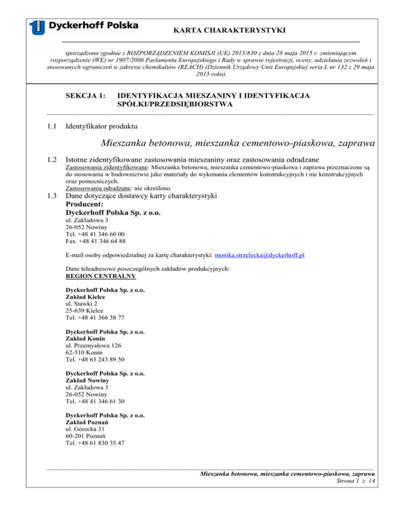 KARTA CHARAKTERYSTYKI ___________________________________________________________________________ sporządzona zgodnie z ROZPORZĄDZENIEM KOMISJI (UE) 2015/830 z dnia 28 maja 2015 r. zmieniającym rozporządzenie (WE) nr 1907/2006 Parlamentu Europejskiego i Rady w sprawie rejestracji, oceny, udzielania zezwoleń i stosowanych ograniczeń w zakresie chemikaliów (REACH) (Dziennik Urzędowy Unii Europejskiej seria L nr 132 z 29 maja 2015 roku) SEKCJA 1: IDENTYFIKACJA MIESZANINY I IDENTYFIKACJA SPÓŁKI/PRZEDSIĘBIORSTWA ___________________________________________________________________________________________________ 1.1 Identyfikator produktu Mieszanka betonowa, mieszanka cementowo-piaskowa, zaprawa 1.2 Istotne zidentyfikowane zastosowania mieszaniny oraz zastosowania odradzane Zastosowania zidentyfikowane: Mieszanka betonowa, mieszanka cementowo-piaskowa i zaprawa przeznaczone są do stosowania w budownictwie jako materiały do wykonania elementów konstrukcyjnych i nie konstrukcyjnych oraz pomocniczych. Zastosowania odradzane: nie określono. 1.3 Dane dotyczące dostawcy karty charakterystyki Producent: Dyckerhoff Polska Sp. z o.o. ul. Zakładowa 3 26-052 Nowiny Tel. +48 41 346 60 00 Fax. +48 41 346 64 88 E-mail osoby odpowiedzialnej za kartę charakterystyki: [email protected] Dane teleadresowe poszczególnych zakładów produkcyjnych: REGION CENTRALNY Dyckerhoff Polska Sp. z o.o. Zakład Kielce ul. Stawki 2 25-639 Kielce Tel. +48 41 366 38 77 Dyckerhoff Polska Sp. z o.o. Zakład Konin ul. Przemysłowa 126 62-510 Konin Tel. +48 63 243 89 50 Dyckerhoff Polska Sp. z o.o. Zakład Nowiny ul. Zakładowa 3 26-052 Nowiny Tel. +48 41 346 61 30 Dyckerhoff Polska Sp. z o.o. Zakład Poznań ul. Górecka 31 60-201 Poznań Tel. +48 61 830 35 47 ___________________________________________________________________________________________________ Mieszanka betonowa, mieszanka cementowo-piaskowa, zaprawa Strona 1 z 14 KARTA CHARAKTERYSTYKI ___________________________________________________________________________ sporządzona zgodnie z ROZPORZĄDZENIEM KOMISJI (UE) 2015/830 z dnia 28 maja 2015 r. zmieniającym rozporządzenie (WE) nr 1907/2006 Parlamentu Europejskiego i Rady w sprawie rejestracji, oceny, udzielania zezwoleń i stosowanych ograniczeń w zakresie chemikaliów (REACH) (Dziennik Urzędowy Unii Europejskiej seria L nr 132 z 29 maja 2015 roku) Dyckerhoff Polska Sp. z o.o. Zakład Radomsko ul. Sucharskiego 49 97-500 Radomsko Tel. +48 44 682 14 92 Dyckerhoff Polska Sp. z o.o. Zakład Starachowice ul. Radomska 29 27-200 Starachowice Tel. +48 41 273 71 05 Dyckerhoff Polska Sp. z o.o. Zakład Wieluń ul. Ciepłownicza 23 98-300 Wieluń Tel. +48 43 843 92 18 Dyckerhoff Polska Sp. z o.o. Zakład Łódź ul. Puszkina 78 92-516 Łódź Tel. +48 42 649 34 84 REGION POŁUDNIOWY Dyckerhoff Polska Sp. z o.o. Zakład Bochnia ul. Łany 11 32-700 Bochnia Tel. +48 14 612 33 05 Dyckerhoff Polska Sp. z o.o. Zakład Jastrzębie ul. Armii Krajowej 1 44-334 Jastrzębie Zdrój Tel. +48 32 447 98 37 Dyckerhoff Polska Sp. z o.o. Zakład Kraków ul. Pułkownika Dąbka 2A 30-732 Kraków Tel. +48 12 290 07 50 Dyckerhoff Polska Sp. z o.o. Zakład Krosno ul. Zręcińska 10 38-400 Krosno Tel. +48 13 432 49 79 ___________________________________________________________________________________________________ Mieszanka betonowa, mieszanka cementowo-piaskowa, zaprawa Strona 2 z 14 KARTA CHARAKTERYSTYKI ___________________________________________________________________________ sporządzona zgodnie z ROZPORZĄDZENIEM KOMISJI (UE) 2015/830 z dnia 28 maja 2015 r. zmieniającym rozporządzenie (WE) nr 1907/2006 Parlamentu Europejskiego i Rady w sprawie rejestracji, oceny, udzielania zezwoleń i stosowanych ograniczeń w zakresie chemikaliów (REACH) (Dziennik Urzędowy Unii Europejskiej seria L nr 132 z 29 maja 2015 roku) Dyckerhoff Polska Sp. z o.o. Zakład Lędziny ul. Hołdunowskiej 108 43-143 Lędziny Tel. +48 32 219 08 10 Dyckerhoff Polska Sp. z o.o. Zakład Rzeszów Lipie 83 36-060 Głogów Małopolski Tel. +48 17 851 62 36 REGION ZACHODNI Dyckerhoff Polska Sp. z o.o. Zakład Legnica ul. Gniewomierska 6 59-220 Legnica Tel. +48 76 850 72 35 Dyckerhoff Polska Sp. z o.o. Zakład Lubin ul. Marii Skłodowskiej-Curie 180 59-301 Lubin Tel. +48 76 846 00 85 Dyckerhoff Polska Sp. z o.o. Zakład Opole ul. Wschodnia 25 45-449 Opole Tel. +48 77 456 96 27 Dyckerhoff Polska Sp. z o.o. Zakład Polkowice ul. Działkowa 8 59-100 Polkowice Tel. +48 76 847 92 84 Dyckerhoff Polska Sp. z o.o. Zakład Świebodzice ul. Świdnicka 57 58-160 Świebodzice Tel. +48 74 854 01 46 Dyckerhoff Polska Sp. z o.o. Zakład Krzemieniecka (Wrocław II) ul. Krzemieniecka 114 54-613 Wrocław Tel. +48 71 717 17 00 Dyckerhoff Polska Sp. z o.o. Zakład Rychtalska (Wrocław I) ul. Rychtalska 20A ___________________________________________________________________________________________________ Mieszanka betonowa, mieszanka cementowo-piaskowa, zaprawa Strona 3 z 14 KARTA CHARAKTERYSTYKI ___________________________________________________________________________ sporządzona zgodnie z ROZPORZĄDZENIEM KOMISJI (UE) 2015/830 z dnia 28 maja 2015 r. zmieniającym rozporządzenie (WE) nr 1907/2006 Parlamentu Europejskiego i Rady w sprawie rejestracji, oceny, udzielania zezwoleń i stosowanych ograniczeń w zakresie chemikaliów (REACH) (Dziennik Urzędowy Unii Europejskiej seria L nr 132 z 29 maja 2015 roku) 50-304 Wrocław Tel. +48 71 347 37 11 REGION WARSZAWA Dyckerhoff Polska Sp. z o.o. Zakład Potrzebna ul. Potrzebna 57 Warszawa Tel. +48 22 510 62 51 Dyckerhoff Polska Sp. z o.o. Zakład Płochocińska ul. Spedycyjna 10 03-191 Warszawa Tel. +48 22 510 62 82 Dyckerhoff Polska Sp. z o.o. Zakład Zawodzie ul. Zawodzie 9 02-981 Warszawa Tel. +48 22 651 75 63 1.4 Numer telefonu alarmowego Instytut Medycyny Pracy w Łodzi: 042 657 99 00; 042 631 47 67 Data sporządzenia/aktualizacji: 04.02.2013/31.05.2015 r. ___________________________________________________________________
