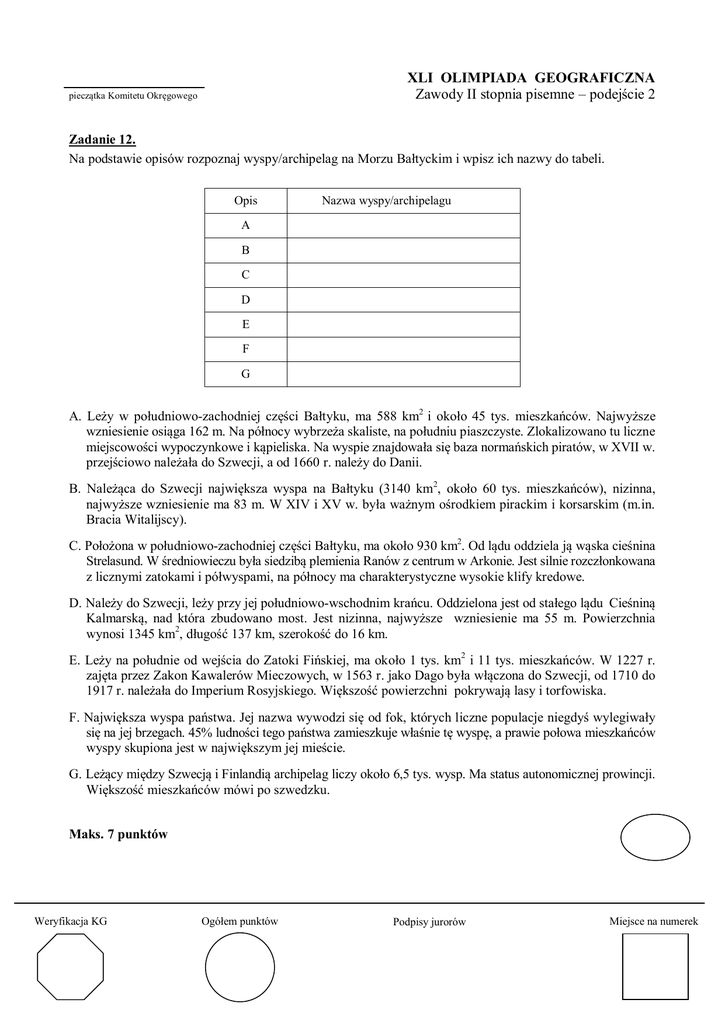 -2/1- XLI OLIMPIADA GEOGRAFICZNA Zawody II stopnia pisemne – podejście 2 pieczątka Komitetu Okręgowego Zadanie 12. Na podstawie opisów rozpoznaj wyspy/archipelag na Morzu Bałtyckim i wpisz ich nazwy do tabeli. Opis Nazwa wyspy/archipelagu A B C D E F G A. Leży w południowo-zachodniej części Bałtyku, ma 588 km2 i około 45 tys. mieszkańców. Najwyższe wzniesienie osiąga 162 m. Na północy wybrzeża skaliste, na południu piaszczyste. Zlokalizowano tu liczne miejscowości wypoczynkowe i kąpieliska. Na wyspie znajdowała się baza normańskich piratów, w XVII w. przejściowo należała do Szwecji, a od 1660 r. należy do Danii. B. Należąca do Szwecji największa wyspa na Bałtyku (3140 km2, około 60 tys. mieszkańców), nizinna, najwyższe wzniesienie ma 83 m. W XIV i XV w. była ważnym ośrodkiem pirackim i korsarskim (m.in. Bracia Witalijscy). C. Położona w południowo-zachodniej części Bałtyku, ma około 930 km2. Od lądu oddziela ją wąska cieśnina Strelasund. W średniowieczu była siedzibą plemienia Ranów z centrum w Arkonie. Jest silnie rozczłonkowana z licznymi zatokami i półwyspami, na północy ma charakterystyczne wysokie klify kredowe. D. Należy do Szwecji, leży przy jej południowo-wschodnim krańcu. Oddzielona jest od stałego lądu Cieśniną Kalmarską, nad która zbudowano most. Jest nizinna, najwyższe wzniesienie ma 55 m. Powierzchnia wynosi 1345 km2, długość 137 km, szerokość do 16 km. E. Leży na południe od wejścia do Zatoki Fińskiej, ma około 1 tys. km2 i 11 tys. mieszkańców. W 1227 r. zajęta przez Zakon Kawalerów Mieczowych, w 1563 r. jako Dago była włączona do Szwecji, od 1710 do 1917 r. należała do Imperium Rosyjskiego. Większość powierzchni pokrywają lasy i torfowiska. F. Największa wyspa państwa. Jej nazwa wywodzi się od fok, których liczne populacje niegdyś wylegiwały się na jej brzegach. 45% ludności tego państwa zamieszkuje właśnie tę wyspę, a prawie połowa mieszkańców wyspy skupiona jest w największym jej mieście. G. Leżący między Szwecją i Finlandią archipelag liczy około 6,5 tys. wysp. Ma status autonomicznej prowincji. Większość mieszkańców mówi po szwedzku. Maks. 7 punktów Weryfikacja KG Ogółem punktów Podpisy jurorów Miejsce na numerek -2/2- Zadanie 13. Uzupełnij poniższy tekst, wpisując w wykropkowane miejsca odpowiednie uzupełnienia zdań spośród podanych w nawiasach. A. Powierzchnia Morza Bałtyckiego wynosi .................. tys. km2. (308, 415, 609, 1208) B. Objętość wód Bałtyku to .................. tys. km3. (21,7, 112, 217, 406) C. Największa głębia tego morza to Landsort mająca .................. m. (227, 459, 610, 1106) D. Parowanie z powierzchni Morza Bałtyckiego jest w stosunku do sumarycznej masy wody pochodzącej z opadów atmosferycznych i wód rzek wpływających do Bałtyku ......................... (mniejsze, równe, większe) E. Średnie zasolenie wód powierzchniowych w Bałtyku Właściwym wynosi .............. ‰. (5, 7-8, 14-15, 21-23) F. Do brzegów Morza Bałtyckiego dostęp ma .................. państw. (7, 8, 9, 10) Maks. 6 punktów Zadanie 14. Wpisz do tabeli po 2 nazwy państw mających dostęp do wskazanych zatok Morza Bałtyckiego. Zatoka Botnicka Narewska Pomorska Ryska Państwo 1 Państwo 2 Maks. 4 punkty Zadanie 15. Na mapie Polskich Obszarów Morskich rozpoznaj, co oznaczono poszczególnymi liczbami (1-10), a następnie uzupełnij tabelę. Liczba Maks. 5 punktów Opis Granica morska RP Morze terytorialne RP Polska wyłączna strefa ekonomiczna Strefa sporna między RP a Królestwem Danii Wody wewnętrzne RP -2/3- Zadanie 16. Hanza to średniowieczny związek miast handlowych, w większości leżących nad morzami Północnym i Bałtyckim. Przynależność do związku legła u podstaw ich bogactwa i rozkwitu. Wpisz nazwy 4 miast w województwach zachodniopomorskim i pomorskim, które w średniowieczu były członkami Hanzy, a dziś zaś mają status powiatów miejskich (grodzkich). 1 – ...................................................... 2 – ...................................................... 3 – ...................................................... 4 – ...................................................... Maks. 4 punkty Zadanie 17. Uzupełnij poniższe opisy: A. Największymi portami kontenerowymi w Europie w 2013 r. były Rotterdam, Hamburg, Antwerpia i Bremerhaven. Wśród portów bałtyckich czwarte miejsce zajmowała Gdynia, trzecie Göteborg, drugie Gdańsk, natomiast pierwsze ............................................. B. Nowoczesny terminal przeładunkowy gazu LNG, pierwszy obiekt tego typu w Polsce, powstaje w ............................................. C. Jest to polski port morsko-rzeczny zbudowany na potrzeby jednego zakładu chemicznego, obecnie obsługuje także inne firmy. W 2012 r. zawinęło tu 198 statków. Największy udział w strukturze przeładunków mają tu fosforyty oraz nawozy sztuczne. Ten port to ............................................. D. Coroczne bałtyckie limity połowowe określane przez UE dla poszczególnych gatunków ryb podawane są w tonach. Tylko w przypadku jednego gatunku limity te podawane są w sztukach. W 2014 r. dla Polski limit ten wynosił 6700 sztuk. Gatunkiem tym jest ............................................. E. Bursztyn, czyli skamieniała żywica, nazywana bałtyckim złotem, znana jest od najdawniejszych czasów. Państwem, na terenie które znajdują się największe na świecie kopalnie tego mineraloidu jest .......................... F. Złoża bursztynu występują nie tylko w bezpośredniej bliskości Bałtyku. Chałupniczo wydobywano go w wielu miejscach w Polsce. Obecnie prowadzone są wiercenia poszukiwawcze w województwie ........................................., gdzie wielkość dotychczas udokumentowanych złóż szacuje się na około 1000 ton. G. Jest to jeden z największych ośrodków przemysłu drzewnego (głównie