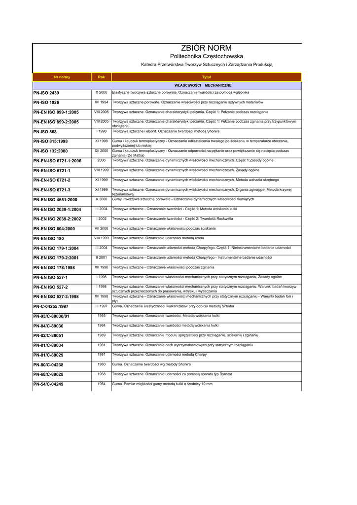 ZBIÓR NORM Politechnika Częstochowska Katedra Przetwórstwa Tworzyw Sztucznych i Zarządzania Produkcją Nr normy Rok Tytuł WŁAŚCIWOŚCI MECHANICZNE PN-ISO 2439 X 2000 Elastyczne tworzywa sztuczne porowate. Oznaczanie twardości za pomocą wgłębnika PN-ISO 1926 XII 1994 Tworzywa sztuczne porowate. Oznaczanie właściwości przy rozciąganiu sztywnych materiałów PN-EN ISO 899-1:2005 VIII 2005 Tworzywa sztuczne. Oznaczanie charakterystyki pełzania. Część 1: Pełzanie podczas rozciągania PN-EN ISO 899-2:2005 PN-ISO 868 VIII 2005 Tworzywa sztuczne. Oznaczanie charakterystyki pełzania. Część 1: Pełzanie podczas zginania przy trzypunktowym obciąŜeniu I 1998 Tworzywa sztuczne i ebonit. Oznaczanie twardości metodą Shore'a PN-ISO 815:1998 XI 1998 PN-ISO 132:2000 XII 2000 PN-EN-ISO 6721-1:2006 2006 Guma i kauczuk termoplastyczny - Oznaczanie odkształcenia trwałego po ściskaniu w temperaturze otoczenia, podwyŜszonej lub niskiej Guma i kauczuk termoplastyczny - Oznaczanie odporności na pękanie oraz powiększanie się nacięcia podczas zginania (De Mattia) Tworzywa sztuczne. Oznaczanie dynamicznych właściwości mechanicznych. Część 1:Zasady ogólne PN-EN-ISO 6721-1 VIII 1999 Tworzywa sztuczne. Oznaczanie dynamicznych właściwości mechanicznych. Zasady ogólne PN-EN-ISO 6721-2 XI 1999 Tworzywa sztuczne. Oznaczanie dynamicznych właściwości mechanicznych. Metoda wahadła skrętnego PN-EN-ISO 6721-3 XI 1999 PN-EN ISO 4651:2000 X 2000 Tworzywa sztuczne. Oznaczanie dynamicznych właściwości mechanicznych. Drgania zginające. Metoda krzywej rezonansowej Gumy i tworzywa sztuczne porowate - Oznaczanie dynamicznych właściwości tłumiących PN-EN ISO 2039-1:2004 III 2004 Tworzywa sztuczne - Oznaczanie twardości - Część 1: Metoda wciskania kulki PN-EN ISO 2039-2:2002 I 2002 Tworzywa sztuczne - Oznaczanie twardości - Część 2: Twardość Rockwella PN-EN ISO 604:2000 VII 2000 Tworzywa sztuczne - Oznaczanie właściwości podczas ściskania PN-EN ISO 180 VIII 1999 Tworzywa sztuczne. Oznaczanie udarności metodą Izoda PN-EN ISO 179-1:2004 III 2004 Tworzywa sztuczne - Oznaczanie udarności metodą Charpy'ego. Część 1: Nieinstrumentalne badanie udarności PN-EN ISO 179-2:2001 II 2001 Tworzywa sztuczne - Oznaczanie udarności metodą Charpy'ego - Instrumentalne badanie udarności PN-EN ISO 178:1998 XII 1998 Tworzywa sztuczne - Oznaczanie właściwości podczas zginania PN-EN ISO 527-1 I 1998 Tworzywa sztuczne. Oznaczanie właściwości mechanicznych przy statycznym rozciąganiu. Zasady ogólne PN-EN ISO 527-2 I 1998 Tworzywa sztuczne. Oznaczanie właściwości mechanicznych przy statycznym rozciąganiu. Warunki badań tworzyw sztucznych przeznaczonych do prasowania, wtrysku i wytłaczania Tworzywa sztuczne - Oznaczanie właściwości mechanicznych przy statycznym rozciąganiu - Warunki badań folii i płyt Guma. Oznaczanie elastyczności wulkanizatów przy odbiciu metodą Schoba PN-EN ISO 527-3:1998 XII 1998 PN-C-04255:1997 III 1997 PN-93/C-89030/01 1993 Tworzywa sztuczne. Oznaczanie twardości. Metoda wciskania kulki PN-84/C-89030 1984 Tworzywa sztuczne. Oznaczanie twardości metodą wciskania kulki PN-82/C-89051 1989 Tworzywa sztuczne. Oznaczanie modułu spręŜystosci przy rozciąganiu, ściskaniu i zginaniu PN-81/C-89034 1981 Tworzywa sztuczne. Oznaczanie cech wytrzymałościowych przy statycznym rozciąganiu PN-81/C-89029 1981 Tworzywa sztuczne. Oznaczanie udarności metodą Charpy PN-80/C-04238 1980 Guma. Oznaczanie twardości wg metody Shore'a PN-68/C-89028 1968 Tworzywa sztuczne. Oznaczanie udarności za pomocą aparatu typ Dynstat PN-54/C-04249 1954 Guma. Pomiar miękkości gumy metodą kulki o średnicy 10 mm PRZYGOTOWANIE PRÓBEK I WYTYCZNE BADAŃ PN-EN ISO 295 IV 1999 Tworzywa sztuczne. Wytyczne wykonania kształtek do badań z tworzyw termoutwardzalnych przez prasowanie PN-EN ISO 291+AC1 IV 1999 Tworzywa sztuczne. Znormalizowane warunki kondycjonowania i badania PN-EN ISO 3167 I 1998 Tworzywa sztuczne. Uniwersalne kształtki do badań PN-EN 605 PN-ISO 1514 PN-93/C-04277 XII 1994 Farby i lakiery. Znormalizowane płytki do badań 1993 Guma. Przygotowanie próbek do badań. Badania fizyczne PN-93/C-04220 1993 Guma. Przedziały czasu między wulkanizacją z badaniem. Wymagania PN-92/C-89011 1992 Wytyczne wykonania kształtek do badań z tworzyw termoplastycznych metodą prasowania PN-81/C-04200 1981 Guma. Ogólne wytyczne wykonywania badań właściwości fizycznych PN-79/C-89014 1979 Utwardzalne Ŝywice do odlewania. Wytyczne przygotowania kształtek do badań PN-79/C-89010 1979 Tworzywa sztuczne. Wytyczne wykonania kształtek do badań z tłoczyw termoutwardzalnych przez prasowanie PN-79/C-89000 1979 Tworzywa sztuczne. Znormalizowane warunki otoczenia dla klimatyzacji i badania próbek PN-77/C-89019 1977 Tworzywa sztuczne sypkie. Pakowanie, pzrechowywanie i transport PN-75/C-89012 1975 Tworzywa sztuczne. Wytyczne wykonania kształtek do badań z tworzyw termoplastycznych metodą wtrysku PN-EN ISO 1043-1 I 2004 Tworzywa sztuczne. Symbole i skróty nazw. Część 1: Polimery podstawowe i ich cechy charakterystyczne OZNACZENIA I TERMINOLOGIA PN-ISO 1382 VII 1998 Guma. Terminologia PRZETWARZALNOŚĆ PN-EN ISO 1133:2006 PN-61/C89036 XI 2006 1961 Tworzywa sztuczne. Oznaczanie masowego wskaźnika szybkości płynięcia (MFR) i objętościowego wskaźnika zybkosci płynięcia (MVR) tworzyw termoplastycznych Oznaczanie plastyczności prasowniczej metodą Raschiga WŁAŚCIWOŚCI CIEPLNE PN-ISO 4897 XII 1994 PN-EN ISO 11357-1:2002 IV 2002 Tworzywa sztuczne porowate. Oznaczanie współczynnika liniowej rozszerzalności cieplnej sztywnych materiałów w obniŜonych temperaturach Tworzywa sztuczne - RóŜnicowa kalorymetria skaningowa (DSC) - Część 1: Zasady ogólne PN-EN ISO 306 IX 2002 Tworzywa sztuczne - tworzywa termoplasytyczne - Oznaczanie temperatury mięknienia według Vicata PN-EN ISO 75-1 XII 1998 Tworzywa sztuczne. Oznaczanie temperatury ugięcia pod obc