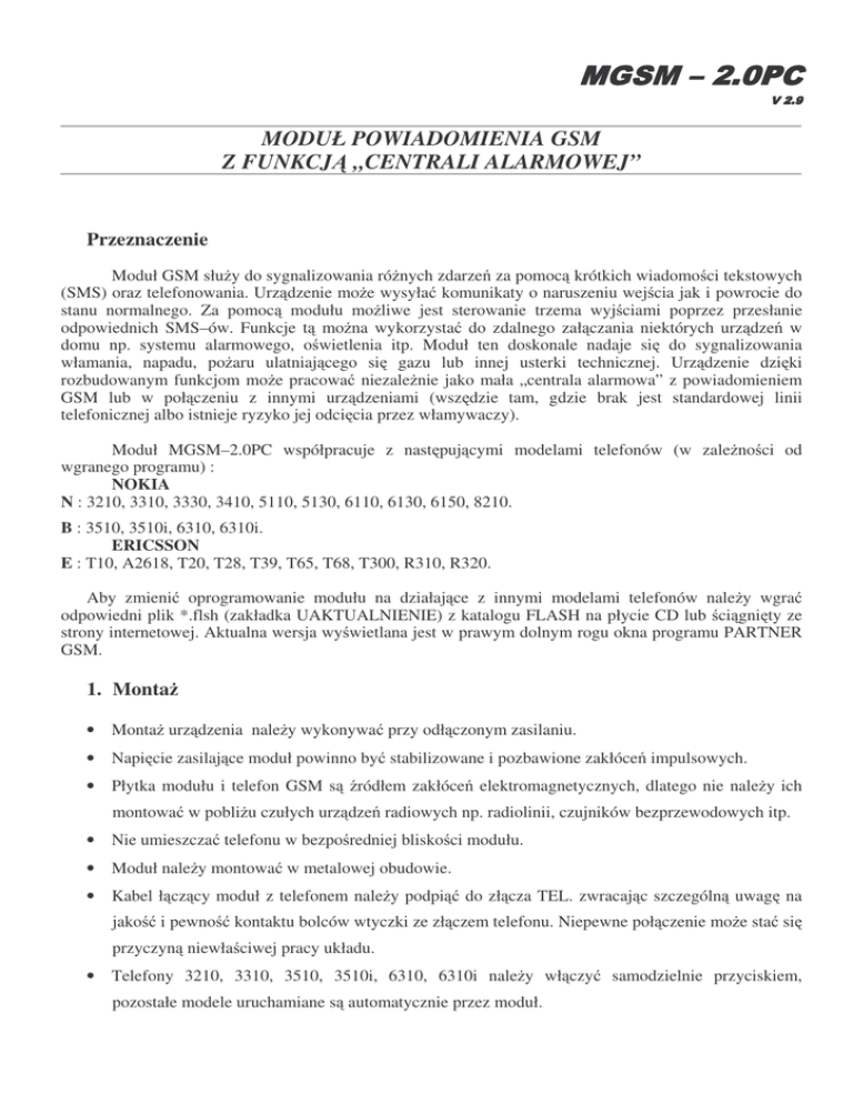 MODUŁ POWIADOMIENIA GSM Z FUNKCJ „CENTRALI ALARMOWEJ” Przeznaczenie Moduł GSM słu y do sygnalizowania ró nych zdarze za pomoc krótkich wiadomo ci tekstowych (SMS) oraz telefonowania. Urz dzenie mo e wysyła komunikaty o naruszeniu wej cia jak i powrocie do stanu normalnego. Za pomoc modułu mo liwe jest sterowanie trzema wyj ciami poprzez przesłanie odpowiednich SMS–ów. Funkcje t mo na wykorzysta do zdalnego zał czania niektórych urz dze w domu np. systemu alarmowego, o wietlenia itp. Moduł ten doskonale nadaje si do sygnalizowania włamania, napadu, po aru ulatniaj cego si gazu lub innej usterki technicznej. Urz dzenie dzi ki rozbudowanym funkcjom mo e pracowa niezale nie jako mała „centrala alarmowa” z powiadomieniem GSM lub w poł czeniu z innymi urz dzeniami (wsz dzie tam, gdzie brak jest standardowej linii telefonicznej albo istnieje ryzyko jej odci cia przez włamywaczy). Moduł MGSM–2.0PC współpracuje z nast puj cymi modelami telefonów (w zale no ci od wgranego programu) : NOKIA N : 3210, 3310, 3330, 3410, 5110, 5130, 6110, 6130, 6150, 8210. B : 3510, 3510i, 6310, 6310i. ERICSSON E : T10, A2618, T20, T28, T39, T65, T68, T300, R310, R320. Aby zmieni oprogramowanie modułu na działaj ce z innymi modelami telefonów nale y wgra odpowiedni plik *.flsh (zakładka UAKTUALNIENIE) z katalogu FLASH na płycie CD lub ci gni ty ze strony internetowej. Aktualna wersja wy wietlana jest w prawym dolnym rogu okna programu PARTNER GSM. 1. Monta • Monta urz dzenia nale y wykonywa przy odł czonym zasilaniu. • Napi cie zasilaj ce moduł powinno by stabilizowane i pozbawione zakłóce impulsowych. • Płytka modułu i telefon GSM s ródłem zakłóce elektromagnetycznych, dlatego nie nale y ich montowa w pobli u czułych urz dze radiowych np. radiolinii, czujników bezprzewodowych itp. • Nie umieszcza telefonu w bezpo redniej blisko ci modułu. • Moduł nale y montowa w metalowej obudowie. • Kabel ł cz cy moduł z telefonem nale y podpi jako i pewno do zł cza TEL. zwracaj c szczególn uwag na kontaktu bolców wtyczki ze zł czem telefonu. Niepewne poł czenie mo e sta si przyczyn niewła ciwej pracy układu. • Telefony 3210, 3310, 3510, 3510i, 6310, 6310i nale y wł czy pozostałe modele uruchamiane s automatycznie przez moduł. samodzielnie przyciskiem, INSTRUKCJA MGSM-2.0PC 2. Widok płytki modułu: TEL. - zł cze do podł czenia telefonu lub kabla RS232TTL do komunikacji z komputerem PC. JI1, JI2 - konfiguracja wej I1 i I2. PR - przycisk do inicjalizacji programowania. SD - ółta dioda LED sygnalizuj ca telefonowanie i wysyłanie SMS-ów oraz komunikacje z komputerem. KOM - zielona dioda LED sygnalizuj ca poprawno AW. - czerwona dioda LED sygnalizuj ca awari . LAD. - konfiguracja ładowarki (opis pkt. 7.). S-M - Wyj cie na syntezer mowy (opis pkt. 8.). 2 komunikacji modułu z telefonem. INSTRUKCJA MGSM-2.0PC 3. Opis zł cz modułu: - Zasilanie modułu 12V (12-14V DC). - Masa modułu. KONFIGURACJA WEJ ÷ - Wej cia alarmowe typu NC/NO. Rozwarcie / zwarcie wej cia do masy układu na okres dłu szy ni 450 ms powoduje wysłanie SMS zapisanego w pami ci modułu pod 4 numery telefonów. Za pomoc urz dzenia IN-4 (ekspander 4 wej ) mo liwa jest rozbudowa ilo ci wej systemu do 8. Działanie i funkcje dodatkowych wej jest takie samo jak wej podstawowych modułu. Uwaga ! w przypadku doł czenia ekspandera wej ograniczona do maksymalnie 10 znaków. długo SMS-ów naruszenia i powrotów linii zostanie Numery telefonów pod które ma by wysyłana informacja nale y wpisa w zakładce NUMERY programu PARTNER GSM, dodatkowo istnieje mo liwo zdalnej zmiany numerów poprzez komendy SMS: Format SMS-a : KOD TELx yyyyyyyyyyyy KOD- 4 znakowy kod dost pu ustawiany w zakładce WYJ CIA TELx -TEL1 TEL2 TEL3 TEL4 numer telefonu na li cie modułu. yyyyyyyyyyyy -nowy numer telefonu np.+48502636033 Typ polaryzacji wej cia NO lub NC konfigurowany jest w zakładce WEJ CIA programu PARTNER GSM. Dodatkowo wej cia I1 i I2 mog by sterowane zwarciem do masy lub do +12V. Działanie wej cia I1 w zale no ci od ustawienia polaryzacji JI1 \ program ON (zało ona) OFF ( ci gni ta) NO Zwarcie do masy wyzwala Odł czenie od plusa wyzwala NC Odł czenie od masy wyzwala Zwarcie do plusa wyzwala Działanie wej cia I2 w zale no ci od od ustawienia polaryzacji JI2 \ program ON (zało ona) OFF ( ci gni ta) NO Zwarcie do masy wyzwala Odł czenie od plusa wyzwala NC Odł czenie od masy wyzwala Zwarcie do plusa wyzwala Typy wej : · INFO - pobudzenie wej cia nie wywołuje akcji alarmowej lecz rozpoczyna proces wysyłania SMS-ów i kolejek telefonowania. · 24h - moduł przechodzi w stan alarmu wysyła SMS i dzwoni niezale nie od stanu linii ZAŁ/WYŁ. (np. obwody antysabota owe) W przypadku wyzwolenia alarmu z linii typu 24h gdy system jest rozbrojony alarm jest kasowany poprzez zwarcie i nast pnie rozwarcie linii tego typu. · NORMALNA - linia wyzwala alarm, SMS i dzwonienie gdy linia ZAŁ/WYŁ jest aktywna. · ZAŁ/WYL - linia zał czaj ca/ wył czaj ca czuwanie dla tej linii na stałe przypisana jest polaryzacja typu NO tzn. masa->moduł uzbrojony rozwarcie->moduł rozbrojony. Uwaga ! Moduł posiada równie mo liwo zał czenia/wył czenia czuwania poprzez przesłanie komendy SMS: ZAL KOD – polecenie zał czaj ce czuwanie, WYL KOD – polecenie wył czaj ce czuwanie Przykład: ZAL 1212 · OPÓ NIONA - linia wyzwala alarm, SMS i dzwonienie po upłyni ciu czasu na wej cie. Czas na wej cie ustawiany jest w zakładce OPCJE. 3 INSTRUKCJA MGSM-2.0PC Uwagi: • • wej cia I1-I4 mog by bezpo rednio wyzwalane wyj ciami niskopr dowymi np. wyj cia: OUT 5,6,..., w centralach alarmowych SATEL CA6,CA10,CA64, wej cia: I1 I2 mog by wyzwalane plusowymi wyj ciami OUT 1,2,3,4 (zdj te zworki J11 i J12). DODAKTOWE OPCJE WEJ : Flash: Okre la czy wysyłany SMS ma by wy wietlany bezpo rednio na wy wietlaczu telefonu (flash), czy te odczytywany ze skrzynki odbiorczej. Nale y pami ta , e wiadomo typu flash mo na bardzo łatwo prze
