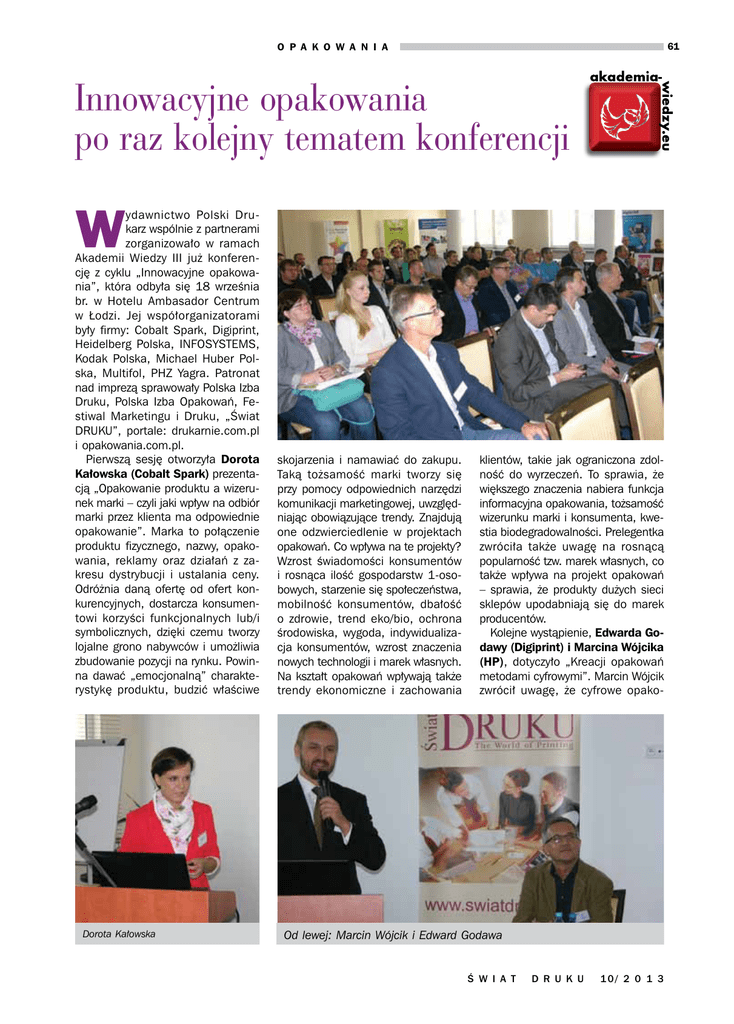 O P A K O W A N I A 61 Innowacyjne opakowania po raz kolejny tematem konferencji W ydawnictwo Polski Drukarz wspólnie z partnerami zorganizowało w ramach Akademii Wiedzy III już konferencję z cyklu „Innowacyjne opakowania”, która odbyła się 18 września br. w Hotelu Ambasador Centrum w Łodzi. Jej współorganizatorami były firmy: Cobalt Spark, Digiprint, Heidelberg Polska, INFOSYSTEMS, Kodak Polska, Michael Huber Polska, Multifol, PHZ Yagra. Patronat nad imprezą sprawowały Polska Izba Druku, Polska Izba Opakowań, Festiwal Marketingu i Druku, „Świat DRUKU”, portale: drukarnie.com.pl i opakowania.com.pl. Pierwszą sesję otworzyła Dorota Kałowska (Cobalt Spark) prezentacją „Opakowanie produktu a wizerunek marki – czyli jaki wpływ na odbiór marki przez klienta ma odpowiednie opakowanie”. Marka to połączenie produktu fizycznego, nazwy, opakowania, reklamy oraz działań z zakresu dystrybucji i ustalania ceny. Odróżnia daną ofertę od ofert konkurencyjnych, dostarcza konsumentowi korzyści funkcjonalnych lub/i symbolicznych, dzięki czemu tworzy lojalne grono nabywców i umożliwia zbudowanie pozycji na rynku. Powinna dawać „emocjonalną” charakterystykę produktu, budzić właściwe Dorota Kałowska skojarzenia i namawiać do zakupu. Taką tożsamość marki tworzy się przy pomocy odpowiednich narzędzi komunikacji marketingowej, uwzględniając obowiązujące trendy. Znajdują one odzwierciedlenie w projektach opakowań. Co wpływa na te projekty? Wzrost świadomości konsumentów i rosnąca ilość gospodarstw 1-osobowych, starzenie się społeczeństwa, mobilność konsumentów, dbałość o zdrowie, trend eko/bio, ochrona środowiska, wygoda, indywidualizacja konsumentów, wzrost znaczenia nowych technologii i marek własnych. Na kształt opakowań wpływają także trendy ekonomiczne i zachowania klientów, takie jak ograniczona zdolność do wyrzeczeń. To sprawia, że większego znaczenia nabiera funkcja informacyjna opakowania, tożsamość wizerunku marki i konsumenta, kwestia biodegradowalności. Prelegentka zwróciła także uwagę na rosnącą popularność tzw. marek własnych, co także wpływa na projekt opakowań – sprawia, że produkty dużych sieci sklepów upodabniają się do marek producentów. Kolejne wystąpienie, Edwarda Godawy (Digiprint) i Marcina Wójcika (HP), dotyczyło „Kreacji opakowań metodami cyfrowymi”. Marcin Wójcik zwrócił uwagę, że cyfrowe opako- Od lewej: Marcin Wójcik i Edward Godawa ś W I A T D R U K U 10/ 2 0 1 3 O P A K O W A N I A 62 Jacek Galiński Ireneusz Grabowski wania są doskonale dopasowane do potrzeb szybko zmieniającego się rynku. Dla tego segmentu firma HP stworzyła maszynę HP Scitex FB10000 Industrial Press (będzie dostępna od listopada br.), pracującą w technologii High Dynamic Range, czyli drukującą kroplą w 4 rozmiarach (do 45 pl), co gwarantuje wydajność produkcyjną przy zachowaniu jakości oraz wszechstronność aplikacji. Prelegent zaprezentował zastosowania urządzeń Scitex na przykładzie popularnej maszyny drukującej FB7600. Klienci HP używają tych drukarek do produkcji edycji limitowanych, krótkich serii, opakowań sezonowych czy związanych ze specjalnymi wydarzeniami – dzięki możliwościom personalizacji i druku na żądanie. Następnie przedstawiony został bilans kosztów druku na FB7600 8c: tuszu, materiałów eksploatacyjnych i zużywalnych, energii i pracy. Edward Godawa przekonywał o zaletach druku cyfrowego w produkcji opakowań dzięki inwestycji i w odpowiednią drukarkę, i w ploter wycinający, co umożliwi obsługę nawet zamówień jednostkowych, jak np. prototypy. Na etapie prepressu oprogramowanie Esko pozwala wybierać z ponad 15 tysięcy standardów opakowaniowych i przesyłać pracę bezpośrednio do druku cyfrowego i wykańczania. Grafikę na opakowania można nanosić za pomocą programu ArtiosCAD, w którym można też projektować strukturalnie. Oprogramowanie i-Cut Suite zapewnia standaryzację, optymalizację i ułożenie użytków na zadanych arkuszach przed drukiem, ś W I A T D R U K U 10/ 2 0 1 3 a stoły wycinające Kongsberg, zintegrowane z i-Cut, pozwalają na zróżnicowane wykańczanie dużych i małych nakładów. Tematem prezentacji Jacka Galińskiego (Kodak Polska) były „Technologie w służbie innowacyjności”. Aby opakowanie informowało i zarazem przyciągało uwagę konsumenta, trzeba zadbać m.in. o wysoką jakość nadruku, która nie jest możliwa bez innowacyjnych rozwiązań. Innowacja musi obejmować znaczące ulepszenia parametrów technicznych, komponentów i materiałów oraz funkcji. Taki właśnie – zdaniem prelegenta – jest system Kodak Flexcel NX, który od czasów debiutu na drupie 2008 ma już ponad 300 instalacji. Odejście Kodaka od tradycyjnej technologii fleksograficznej LAMS i zarzucenie inhibicji tlenowej pozwoliło na eliminację błędów czarnej maski, poszerzyło gamut i skalę szarości, dało łagodne przejścia tonalne oraz stabilny przyrost punktów rastrowych. Proponowana przez Kodaka naświetlarka jest kalibrowana liniowo, a głowica termiczna wykorzystująca technologię SQUAREspot emituje silne światło, co daje większą precyzję wypalania punktu o płaskim wierzchołku na płycie cyfrowej Flexcel NX. Zaletą takich punktów jest to, że na ich brzegach nie zbiera się farba, co gwarantuje stabilny przyrost. Z kolei oprogramowanie Spotless przy użyciu tylko kolorów CMYK pozwala uzyskać pełną paletę barw i ograniczyć zużycie farby. Prelegent wskazał przy tym, że na efekt końcowy produkcji opakowań ma wpływ wiele czynników technicznych i technologicznych, jak projekt graficzny, wykonanie płyt, liniatury, rodzaje rastra, wałki rastrowe, pianki pod płyty, farby i ich właściwości, podłoża oraz maszyny drukujące. Ireneusz Grabowski (PHZ Yagra) w prezentacji „Podłoża do druku opakowań” przedstawił Przedsiębiorstwo Handlu Zagranicznego Ya