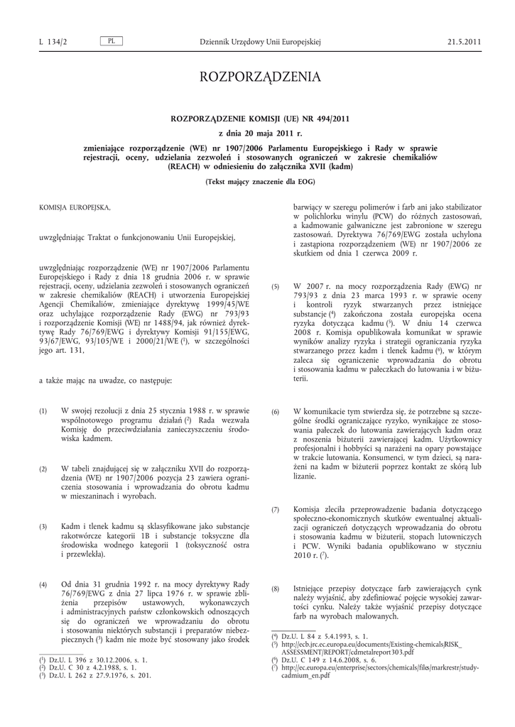L 134/2 PL Dziennik Urzędowy Unii Europejskiej 21.5.2011 ROZPORZĄDZENIA ROZPORZĄDZENIE KOMISJI (UE) NR 494/2011 z dnia 20 maja 2011 r. zmieniające rozporządzenie (WE) nr 1907/2006 Parlamentu Europejskiego i Rady w sprawie rejestracji, oceny, udzielania zezwoleń i stosowanych ograniczeń w zakresie chemikaliów (REACH) w odniesieniu do załącznika XVII (kadm) (Tekst mający znaczenie dla EOG) barwiący w szeregu polimerów i farb ani jako stabilizator w polichlorku winylu (PCW) do różnych zastosowań, a kadmowanie galwaniczne jest zabronione w szeregu zastosowań. Dyrektywa 76/769/EWG została uchylona i zastąpiona rozporządzeniem (WE) nr 1907/2006 ze skutkiem od dnia 1 czerwca 2009 r. KOMISJA EUROPEJSKA, uwzględniając Traktat o funkcjonowaniu Unii Europejskiej, uwzględniając rozporządzenie (WE) nr 1907/2006 Parlamentu Europejskiego i Rady z dnia 18 grudnia 2006 r. w sprawie rejestracji, oceny, udzielania zezwoleń i stosowanych ograniczeń w zakresie chemikaliów (REACH) i utworzenia Europejskiej Agencji Chemikaliów, zmieniające dyrektywę 1999/45/WE oraz uchylające rozporządzenie Rady (EWG) nr 793/93 i rozporządzenie Komisji (WE) nr 1488/94, jak również dyrek tywę Rady 76/769/EWG i dyrektywy Komisji 91/155/EWG, 93/67/EWG, 93/105/WE i 2000/21/WE (1), w szczególności jego art. 131, (5) W 2007 r. na mocy rozporządzenia Rady (EWG) nr 793/93 z dnia 23 marca 1993 r. w sprawie oceny i kontroli ryzyk stwarzanych przez istniejące substancje (4) zakończona została europejska ocena ryzyka dotycząca kadmu (5). W dniu 14 czerwca 2008 r. Komisja opublikowała komunikat w sprawie wyników analizy ryzyka i strategii ograniczania ryzyka stwarzanego przez kadm i tlenek kadmu (6), w którym zaleca się ograniczenie wprowadzania do obrotu i stosowania kadmu w pałeczkach do lutowania i w biżu terii. (6) W komunikacie tym stwierdza się, że potrzebne są szcze gólne środki ograniczające ryzyko, wynikające ze stoso wania pałeczek do lutowania zawierających kadm oraz z noszenia biżuterii zawierającej kadm. Użytkownicy profesjonalni i hobbyści są narażeni na opary powstające w trakcie lutowania. Konsumenci, w tym dzieci, są nara żeni na kadm w biżuterii poprzez kontakt ze skórą lub lizanie. (7) Komisja zleciła przeprowadzenie badania dotyczącego społeczno-ekonomicznych skutków ewentualnej aktuali zacji ograniczeń dotyczących wprowadzania do obrotu i stosowania kadmu w biżuterii, stopach lutowniczych i PCW. Wyniki badania opublikowano w styczniu 2010 r. (7). (8) Istniejące przepisy dotyczące farb zawierających cynk należy wyjaśnić, aby zdefiniować pojęcie wysokiej zawar tości cynku. Należy także wyjaśnić przepisy dotyczące farb na wyrobach malowanych. a także mając na uwadze, co następuje: (1) W swojej rezolucji z dnia 25 stycznia 1988 r. w sprawie wspólnotowego programu działań (2) Rada wezwała Komisję do przeciwdziałania zanieczyszczeniu środo wiska kadmem. (2) W tabeli znajdującej się w załączniku XVII do rozporzą dzenia (WE) nr 1907/2006 pozycja 23 zawiera ograni czenia stosowania i wprowadzania do obrotu kadmu w mieszaninach i wyrobach. (3) Kadm i tlenek kadmu są sklasyfikowane jako substancje rakotwórcze kategorii 1B i substancje toksyczne dla środowiska wodnego kategorii 1 (toksyczność ostra i przewlekła). (4) Od dnia 31 grudnia 1992 r. na mocy dyrektywy Rady 76/769/EWG z dnia 27 lipca 1976 r. w sprawie zbli żenia przepisów ustawowych, wykonawczych i administracyjnych państw członkowskich odnoszących się do ograniczeń we wprowadzaniu do obrotu i stosowaniu niektórych substancji i preparatów niebez piecznych (3) kadm nie może być stosowany jako środek (1) Dz.U. L 396 z 30.12.2006, s. 1. (2) Dz.U. C 30 z 4.2.1988, s. 1. (3) Dz.U. L 262 z 27.9.1976, s. 201. (4) Dz.U. L 84 z 5.4.1993, s. 1. (5) http://ecb.jrc.ec.europa.eu/documents/Existing-chemicals/RISK_ ASSESSMENT/REPORT/cdmetalreport303.pdf (6) Dz.U. C 149 z 14.6.2008, s. 6. (7) http://ec.europa.eu/enterprise/sectors/chemicals/files/markrestr/studycadmium_en.pdf 21.5.2011 PL Dziennik Urzędowy Unii Europejskiej (9) W 2001 r. europejski przemysł PCW podjął dobrowolną inicjatywę polegającą na niestosowaniu kadmu jako stabi lizatora w nowo wytworzonym PCW w odniesieniu do tych zastosowań, które nie zostały jeszcze uregulowane na mocy dyrektywy 76/769/EWG. W wyniku tej dobro wolnej inicjatywy stopniowo zaprzestano stosowania kadmu w PCW. (10) (11) L 134/3 (14) Przewiduje się, że ze względu na zakaz stosowania kadmu w nowym PCW zawartość kadmu w wyrobach budowlanych produkowanych z PCW z odzysku powinna się stopniowo zmniejszać. W związku z tym wartość graniczną dla kadmu należy poddawać odpo wiednim przeglądom, a zgodnie z art. 69 rozporządzenia (WE) nr 1907/2006 w przeglądach dotyczących tego ograniczenia powinna brać udział Europejska Agencja Chemikaliów (ECHA). Aby osiągnąć cel przeciwdziałania zanieczyszczeniu kadmem, zakazem stosowania kadmu należy objąć wszystkie wyroby z PCW. (15) Zgodnie z przepisami dotyczącymi środków przejścio wych, zawartymi w art. 137 ust. 1 lit. a) rozporządzenia REACH, należy zmienić załącznik XVII do rozporzą dzenia (WE) nr 1907/2006. Należy przyznać odstępstwo dla mieszanin wytworzo nych z odpadów PCW, dalej zwanych „PCW z odzysku”, aby umożliwić ich wprowadzanie do obrotu w celu zastosowania w niektórych wyrobach budowla nych. (16) Środki przewidziane w niniejszym rozporządzeniu są zgodne z opinią Komitetu ustanowionego na mocy art. 133 rozporządzenia (WE) nr 1907/2006, PRZYJMUJE NINIEJSZE ROZPORZĄDZENIE: (12) (13) Należy zachęcać do stosowania PCW z odzysku do produkcji niektórych wyrobów budowlanych, ponieważ umożliwia to ponowne wykorzystanie starego PCW, które może zawierać kadm. W związku z tym dla tych wyrobów budowlanych należy przewidzieć wyższą wartość graniczną zawartości kadmu. Pozwoli to na uniknięcie wyrzucania PCW na skład