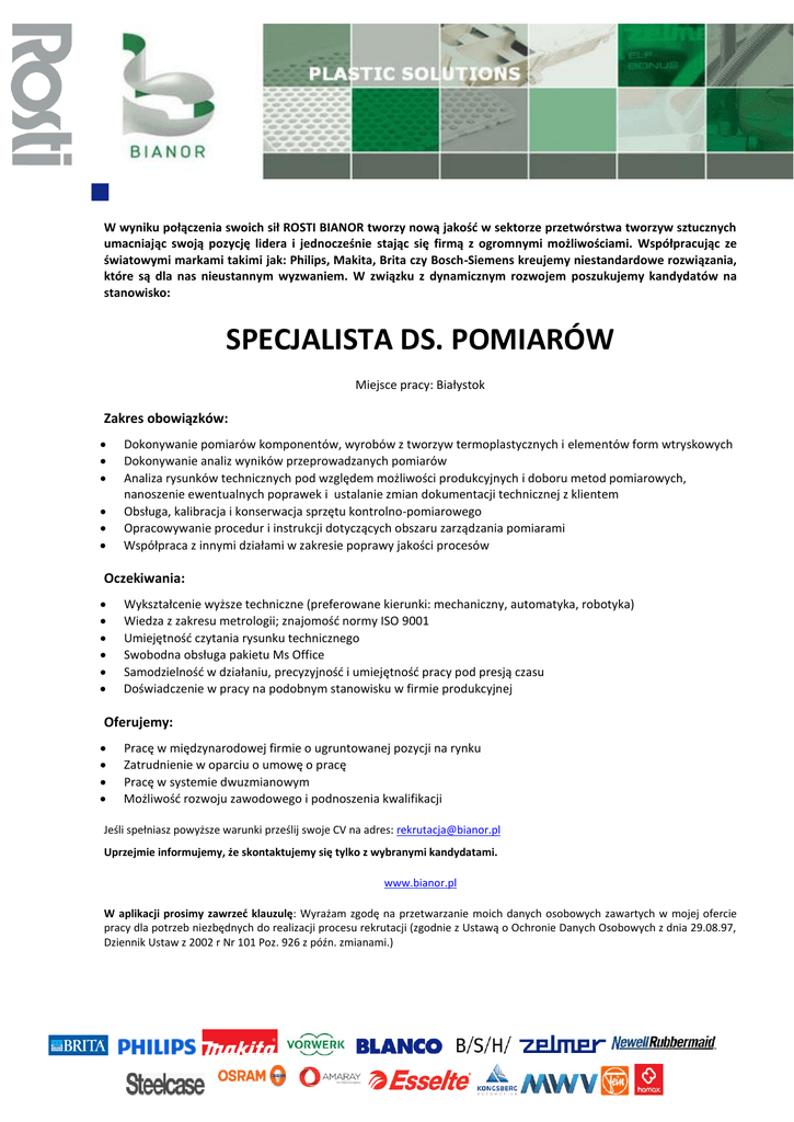 W wyniku połączenia swoich sił ROSTI BIANOR tworzy nową jakość w sektorze przetwórstwa tworzyw sztucznych umacniając swoją pozycję lidera i jednocześnie stając się firmą z ogromnymi możliwościami. Współpracując ze światowymi markami takimi jak: Philips, Makita, Brita czy Bosch-Siemens kreujemy niestandardowe rozwiązania, które są dla nas nieustannym wyzwaniem. W związku z dynamicznym rozwojem poszukujemy kandydatów na stanowisko: SPECJALISTA DS. POMIARÓW Miejsce pracy: Białystok Zakres obowiązków: Dokonywanie pomiarów komponentów, wyrobów z tworzyw termoplastycznych i elementów form wtryskowych Dokonywanie analiz wyników przeprowadzanych pomiarów Analiza rysunków technicznych pod względem możliwości produkcyjnych i doboru metod pomiarowych, nanoszenie ewentualnych poprawek i ustalanie zmian dokumentacji technicznej z klientem Obsługa, kalibracja i konserwacja sprzętu kontrolno-pomiarowego Opracowywanie procedur i instrukcji dotyczących obszaru zarządzania pomiarami Współpraca z innymi działami w zakresie poprawy jakości procesów Oczekiwania: Wykształcenie wyższe techniczne (preferowane kierunki: mechaniczny, automatyka, robotyka) Wiedza z zakresu metrologii; znajomość normy ISO 9001 Umiejętność czytania rysunku technicznego Swobodna obsługa pakietu Ms Office Samodzielność w działaniu, precyzyjność i umiejętność pracy pod presją czasu Doświadczenie w pracy na podobnym stanowisku w firmie produkcyjnej Oferujemy: Pracę w międzynarodowej firmie o ugruntowanej pozycji na rynku Zatrudnienie w oparciu o umowę o pracę Pracę w systemie dwuzmianowym Możliwość rozwoju zawodowego i podnoszenia kwalifikacji Jeśli spełniasz powyższe warunki prześlij swoje CV na adres: [email protected] Uprzejmie informujemy, że skontaktujemy się tylko z wybranymi kandydatami. www.bianor.pl W aplikacji prosimy zawrzeć klauzulę: Wyrażam zgodę na przetwarzanie moich danych osobowych zawartych w mojej ofercie pracy dla potrzeb niezbędnych do realizacji procesu rekrutacji (zgodnie z Ustawą o Ochronie Danych Osobowych z dnia 29.08.97, Dziennik Ustaw z 2002 r Nr 101 Poz. 926 z późn. zmianami.)