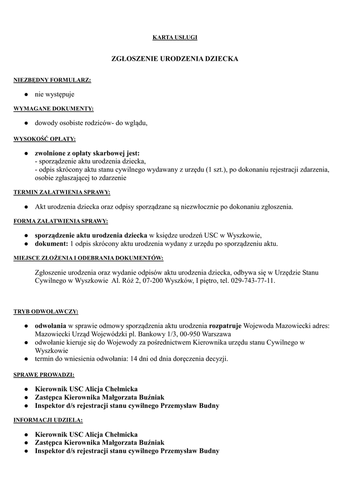 KARTA USŁUGI ZGŁOSZENIE URODZENIA DZIECKA NIEZBĘDNY FORMULARZ: nie występuje WYMAGANE DOKUMENTY: dowody osobiste rodziców- do wglądu, WYSOKOŚĆ OPŁATY: zwolnione z opłaty skarbowej jest: - sporządzenie aktu urodzenia dziecka, - odpis skrócony aktu stanu cywilnego wydawany z urzędu (1 szt.), po dokonaniu rejestracji zdarzenia, osobie zgłaszającej to zdarzenie TERMIN ZAŁATWIENIA SPRAWY: Akt urodzenia dziecka oraz odpisy sporządzane są niezwłocznie po dokonaniu zgłoszenia. FORMA ZAŁATWIENIA SPRAWY: sporządzenie aktu urodzenia dziecka w księdze urodzeń USC w Wyszkowie, dokument: 1 odpis skrócony aktu urodzenia wydany z urzędu po sporządzeniu aktu. MIEJSCE ZŁOŻENIA I ODEBRANIA DOKUMENTÓW: Zgłoszenie urodzenia oraz wydanie odpisów aktu urodzenia dziecka, odbywa się w Urzędzie Stanu Cywilnego w Wyszkowie Al. Róż 2, 07-200 Wyszków, I piętro, tel. 029-743-77-11. TRYB ODWOŁAWCZY: odwołania w sprawie odmowy sporządzenia aktu urodzenia rozpatruje Wojewoda Mazowiecki adres: Mazowiecki Urząd Wojewódzki pl. Bankowy 1/3, 00-950 Warszawa odwołanie kieruje się do Wojewody za pośrednictwem Kierownika urzędu stanu Cywilnego w Wyszkowie termin do wniesienia odwołania: 14 dni od dnia doręczenia decyzji. SPRAWĘ PROWADZI: Kierownik USC Alicja Chełmicka Zastępca Kierownika Małgorzata Buźniak Inspektor d/s rejestracji stanu cywilnego Przemysław Budny INFORMACJI UDZIELA: Kierownik USC Alicja Chełmicka Zastępca Kierownika Małgorzata Buźniak Inspektor d/s rejestracji stanu cywilnego Przemysław Budny DODATKOWE INFORMACJE: do zgłoszenia urodzenia dziecka są obowiązani matka lub ojciec dziecka. Matka lub ojciec dziecka, którzy ukończyli 16 lat dokonują zgłoszenia jeżeli ,mają ograniczoną zdolność do czynności prawnych. W pozostałych przypadkach zgłoszenia dokonuje przedstawiciel ustawowy lub opiekun matki. dziecku nie można nadać więcej niż dwóch imion, imienia ośmieszającego, nieprzyzwoitego, w formie zdrobniałej, rodzice dziecka mogą w ciągu 6 miesięcy od daty sporządzenia aktu urodzenia złożyć kierownikowi USC pisemne oświadczenie o zmianie imienia (imion) dziecka wpisanego do aktu w chwili jego sporządzenia, urodzenie rejestruje się w urzędzie stanu cywilnego właściwym dla miejsca urodzenia dziecka. Urodzenie dziecka należy zgłosić w ciągu 21 dni od dnia urodzenia lub 3 dni, jeżeli dziecko urodziło się martwe, Jeżeli nie dokonano zgłoszenia urodzenia w terminie 21 dni od dnia sporządzenia karty urodzenia lub w terminie 3 dni od dnia sporządzenia karty martwego urodzenia, kierownik urzędu stanu cywilnego sporządza akt urodzenia i wybiera dziecku imię z urzędu, w sytuacji, gdy osoba obowiązana do zgłoszenia urodzenia dziecka nie może spełnić tego obowiązku, może tego dokonać w jej imieniu pełnomocnik. Pełnomocnictwo powinno być udzielone na piśmie, w treści pełnomocnictwa winno być wskazane imię lub imiona nadawane dziecku przez rodziców. PODSTAWA PRAWNA: ustawa z dnia 29 września 1986 r. Prawo o aktach stanu cywilnego (tekst jedn. Dz.U. Nr 212 poz. 1264 z 2011 roku z późn. zm.), ustawa z dnia 28 listopada 2014 r. Prawo o aktach stanu cywilnego (Dz. U. z 2014 r., poz. 1741 ze zm.) ustawa z dnia 14 czerwca 1960 r. Kodeks postępowania administracyjnego (tekst jedn. Dz. U. z 2013 r., poz. 267 z późn.zm.), ustawa z dnia 16 listopada 2006 r. O opłacie skarbowej (Dz. U. z 2006 r. Nr 225, poz. 1635 z późn.zm.) GODZINY PRACY URZĘDU: - od poniedziałku do piątku w godzinach 800-1600 - wtorek – 800-1800 Osoba sporządzająca i zatwierdzająca kartę pod względem merytorycznym Kierownik USC Alicja Chełmicka