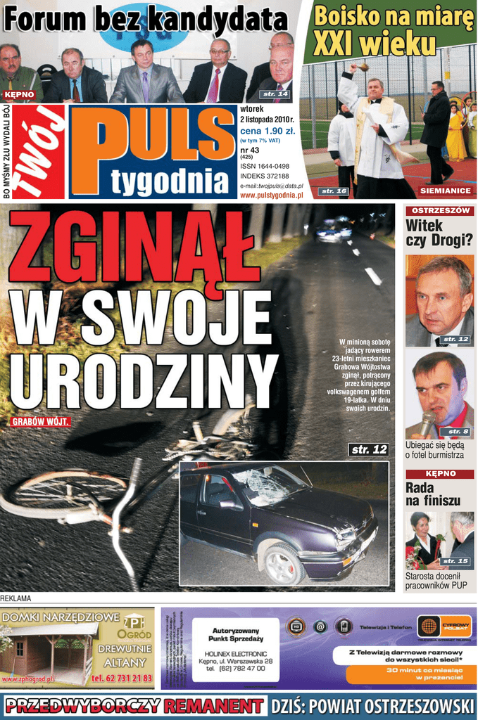KÊPNO str. 14 BO MYŒMY Z£U WYDALI BÓJ wtorek 2 listopada 2010r. cena 1.90 z³. (w tym 7% VAT) nr 43 (425) ISSN 1644-0498 INDEKS 372188 e-mail:[email protected] www.pulstygodnia.pl SIEMIANICE str. 16 OSTRZESZÓW Witek czy Drogi? W minion¹ sobotê jad¹cy rowerem 23-letni mieszkaniec Grabowa Wójtostwa zgin¹³, potr¹cony przez kiruj¹cego volkswagenem golfem 19-latka. W dniu swoich urodzin. str. 12 GRABÓW WÓJT. REKLAMA str. 8 str. 12 Ubiegaæ siê bêd¹ o fotel burmistrza KÊPNO Rada na finiszu str. 15 Starosta doceni³ pracowników PUP 2 MIKSTAT CZAJKÓW DORUCHÓW GRABÓW OSTRZESZÓW KOBYLA GÓRA KRASZEWICE MIKSTAT Ci¹g dalszy sporu wokó³ kopalni gazu Twój Puls Tygodnia wtorek - 2 listopada 2010 r. Bogdan Ma³ecki BURMISTRZ SWOJE, PRZEWODNICZ¥CY SWOJE - Pan robi to, co firma chce, a nie to, co chc¹ mieszkañcy - zarzuca³ burmistrzowi Bogdanowi Ma³eckiemu przewodnicz¹cy rady Stanis³aw Roguszny. - Nie robiê nic, co jest niezgodne z prawem - odpiera³ ataki Ma³ecki. Posz³o oczywiœcie o kopalnie gazu w Mikstacie Pustkowiu. REKLAMA Tak jak siê mo¿na by³o spodziewaæ, ostatnie (27 paŸdziernika) obrady mikstackiej rady niczym nie ró¿ni³y siê od tych poprzednich. Jak zwykle ka¿dy mówi³ to, co chcia³ i kiedy chcia³. Najgorzej by³o wtedy, kiedy burmistrz Bogdan Ma³ecki przedstawia³ sprawozdanie z prac w okresie miêdzysesyjnym, wtedy wiêkszoœæ radnych zajêta by³a rozmow¹, a przewodnicz¹cy rady w ogóle na to nie reagowa³. Roguszny uaktywni³ siê jednak zaraz po odczytanym sprawozdaniu. - Ja, jako radny nie wiedzia³em o tym, ale dowiedzia³em siê, ¿e pan ka¿dorazowo opiniuje i to pozytywnie przejazdy tych cystern na teren kopalni - zaatakowa³ burmistrza. Rogusznemu chodzi³o oczywiœcie o cyster- ny o wysokim tona¿u, jakie je¿d¿¹ prowadz¹c¹ do kopalni drog¹. - Pan robi to, co firma chce, a nie to, co chc¹ mieszkañcy - zarzuca³ burmistrzowi Roguszny. - Nie robie nic, co jest niezgodne z prawem - t³umaczy³ burmistrz. - Je¿eli firma musi przewieŸæ okreœlon¹ iloœæ substancji w warunkach bezpiecznych, a ustawiony znacznie póŸniej ni¿ firma powsta³a znak tego zabrania, to prawo dopuszcza, ¿e w drodze wyj¹tku, przy udziale Zarz¹du G³ównego Dróg i Autostrad w Polsce mo¿na takie pozwolenie wydaæ, wiêc ja je opiniujê pozytywnie t³umaczy³ burmistrz. - Ja uwa¿am, ¿e powinien pan staæ tutaj w obronie mieszkañców i po prostu ich reprezentowaæ - nie odpuszcza³ Roguszny. - Podpisaæ raz, drugi i trzeci zgodê z uwagami, ¿e ta dzia³alnoœæ jest tutaj niewskazana, nie jest mile widziana, bo budzi podejrzenia. - Firma nie robi nic takiego, co mog³oby w sposób zasadniczy zagra¿aæ ¿yciu mieszkañ - nie ustêpowa³ burmistrz. - I tak ju¿ jest zawsze: przewodnicz¹cy swoje i burmistrz swoje, i tak ju¿ w kó³ko - wyrwa³ siê komuœ z goœci obecnych na sali. ,,ORLIK’’ W LISTOPADZIE Okazuje siê, ¿e firma buduj¹ca w Mikstacie wielofunkcyjne boisko ,,Orlik’’ jego budowê rozpoczê³a póŸniej, ni¿ to by³o przewidywane w planach. - Firmy bior¹ po kilkanaœcie takich zadañ nie mog¹ siê wywi¹zaæ i potem dwoj¹ siê i troj¹, jak to zrobiæ, ¿eby zadanie by³o wykonane - t³umaczy³ burmistrz. - ,,Orlik” jest teraz pe³n¹ par¹ budowany, musi byæ w listopadzie oddany... Ma³ecki poinformowa³ równie¿ radnych, ¿e istnieje REKLAMA Stanis³aw Roguszny mo¿liwoœæ pozyskania dofinansowania z ministerstwa na stworzenie na p³ycie boiska lodowiska. - (...) Ministerstwo chce zap³aciæ za rury i ca³¹ instalacjê, która bêdzie doprowadza³a p³yn ch³odz¹cy, ³¹cznie z agregatem - wylicza³ Ma³ecki. Póki co nie wiadomo jednak czy dofinansowanie lodowiska bêdzie jeszcze mo¿liwe w tym roku. UCHWALILI Radni zaci¹gnêli 2.700.000 z³ d³ugoterminowego kredytu na za³atanie powsta³ej dziury bud¿etowej. O poziom inflacji, czyli 2,6 procent, od przysz³ego roku zwiêksz¹ siê stawki podatku od œrodków transportowych. Radni uchwalili równie¿ Gminny Program Przeciwdzia³ania Przemocy w Rodzinie oraz wprowadzili zmiany do tegorocznego bud¿etu. MON Twój Puls Tygodnia wtorek - 2 listopada 2010 r. OSTRZESZÓW CZAJKÓW DORUCHÓW GRABÓW OSTRZESZÓW KOBYLA GÓRA KRASZEWICE MIKSTAT O basenie, ciszy nocnej i monitoringu miasta AKTYWNI RADNI NA FINISZU Drogi przyzna³, ¿e to nie jedynie plotka, jaka kr¹¿y na temat basenu. Wczeœniej ponoæ mieszkañcy obawiali siê, ¿e basen budowany jest z pobieranych op³at za ciep³o. - Co oczywiœcie by³o nieprawd¹ - zapewnia³. Kajser z kolei podkreœla³, ¿e sytuacja z op³atami za ciep³o jest niejasna i trzeba j¹ szybko wyjaœniæ, ¿eby mieszkañcy nie mieli ju¿ ¿adnych w¹tpliwoœci. REKLAMA 3 - W Ostrzeszowie wielu ludzi w tej chwili zastanawia siê, czy p³ac¹c za ciep³o w blokach nie p³aci jednoczeœnie za grzanie wody w basenie - wyzna³ podczas ostatniej sesji rady miejskiej Henryk Kajser (na zdj. z lewej). W³odzimierz Drogi, prezes Zak³adu Energetyki Cieplnej w Ostrzeszowie stanowczo zaprzeczy³. - Tak samo jak ka¿dy blok, tak i kryta p³ywania ma w³asny licznik ciep³a - t³umaczy³. Radni musieli tak¿e rozwa¿yæ, czy zgadzaj¹ siê na podwy¿szenie kapita³u zak³adowego ZEC o kwotê 5.400.000 z³. Zgodnie z uchwa³¹ czêœæ tej kwoty (4.800.000 z³) pokryæ ma wydatki zwi¹zane z budow¹ Centrum Turystyczno - Rehabilitacyjnego, a 450 tys. podnieœæ ma kapita³ podstawowy spó³ki. Z kolei 100 tys. ZEC zamierza przeznaczyæ na doinwestowanie obiektów sportowych przy ul. K¹pielowej, pozosta- ³e 50 ma pójœæ na urz¹dznie zieleni wokó³ basenu. KOLEJNA PLOTKA Zanim jednak radni przyst¹pili do g³osowania, Drogi zdementowa³ kolejn¹ plotkê, jakoby Gmina za blisko 100 tysiêcy z³ chcia³a oœwietliæ p³ytê boiska na miejskim stadionie. - Jest to sponsorowane przez spó³kê Oœwietlenie Uliczne i Drogowe wyjaœnia³ prezes ZEC. To jednak bardzo nie spodoba- ³o siê radnemu Grzegorzowi Wiêckowi. - To bêd¹ pieni¹dze w