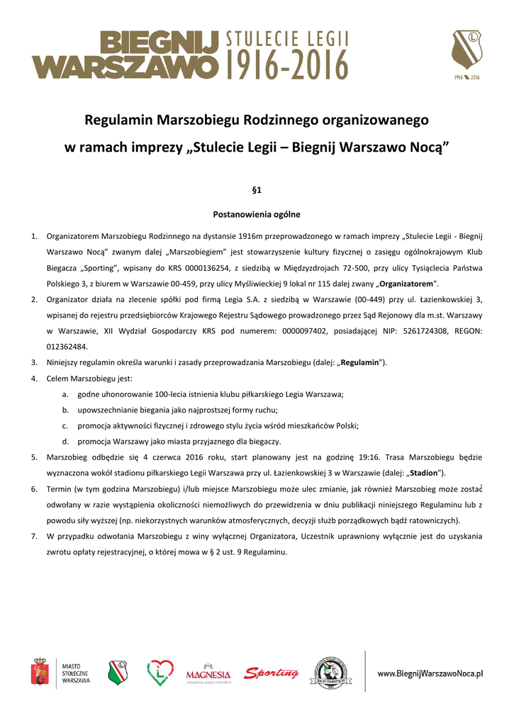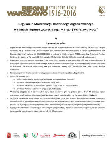 Regulamin Marszobiegu Rodzinnego organizowanego w ramach imprezy „Stulecie Legii – Biegnij Warszawo Nocą” §1 Postanowienia ogólne 1. Organizatorem Marszobiegu Rodzinnego na dystansie 1916m przeprowadzonego w ramach imprezy „Stulecie Legii - Biegnij Warszawo Nocą” zwanym dalej „Marszobiegiem” jest stowarzyszenie kultury fizycznej o zasięgu ogólnokrajowym Klub Biegacza „Sporting”, wpisany do KRS 0000136254, z siedzibą w Międzyzdrojach 72-500, przy ulicy Tysiąclecia Państwa Polskiego 3, z biurem w Warszawie 00-459, przy ulicy Myśliwieckiej 9 lokal nr 115 dalej zwany „Organizatorem”. 2. Organizator działa na zlecenie spółki pod firmą Legia S.A. z siedzibą w Warszawie (00-449) przy ul. Łazienkowskiej 3, wpisanej do rejestru przedsiębiorców Krajowego Rejestru Sądowego prowadzonego przez Sąd Rejonowy dla m.st. Warszawy w Warszawie, XII Wydział Gospodarczy KRS pod numerem: 0000097402, posiadającej NIP: 5261724308, REGON: 012362484. 3. Niniejszy regulamin określa warunki i zasady przeprowadzania Marszobiegu (dalej: „Regulamin”). 4. Celem Marszobiegu jest: 5. a. godne uhonorowanie 100-lecia istnienia klubu piłkarskiego Legia Warszawa; b. upowszechnianie biegania jako najprostszej formy ruchu; c. promocja aktywności fizycznej i zdrowego stylu życia wśród mieszkańców Polski; d. promocja Warszawy jako miasta przyjaznego dla biegaczy. Marszobieg odbędzie się 4 czerwca 2016 roku, start planowany jest na godzinę 19:16. Trasa Marszobiegu będzie wyznaczona wokół stadionu piłkarskiego Legii Warszawa przy ul. Łazienkowskiej 3 w Warszawie (dalej: „Stadion”). 6. Termin (w tym godzina Marszobiegu) i/lub miejsce Marszobiegu może ulec zmianie, jak również Marszobieg może zostać ́ odwołany w razie wystąpienia okoliczności niemożliwych do przewidzenia w dniu publikacji niniejszego Regulaminu lub z powodu siły wyższej (np. niekorzystnych warunków atmosferycznych, decyzji służb porządkowych bądź ratowniczych). 7. W przypadku odwołania Marszobiegu z winy wyłącznej Organizatora, Uczestnik uprawniony wyłącznie jest do uzyskania zwrotu opłaty rejestracyjnej, o której mowa w § 2 ust. 9 Regulaminu. §2 Warunki uczestnictwa 1. Dokładne miejsce, godzina startu oraz szczegółowa trasa Marszobiegu będzie dostępna na stronie internetowej Marszobiegu pod adresem: www.biegnijwarszawonoca.pl. 2. Długość trasy Marszobiegu wynosi: 1916m. 3. Limit czasu na pokonanie trasy wynosi 45 minut. 4. Osoba zainteresowana wzięciem udziału w Marszobiegu przed dokonaniem zgłoszenia do Marszobiegu zobowiązana jest zapoznać się z Regulaminem. 5. Ilość osób mogących wziąć udział w Marszobiegu jest ograniczona i wynosi 8.000. Decyduje kolejność wypełnienia i złożenia formularza rejestracyjnego zgodnie z postanowieniami Regulaminu. 6. W przypadku osób niepełnoletnich, chcących wziąć udział w Marszobiegu, wymaga się ponadto złożenia przez rodzica lub opiekuna prawnego podpisu na formularzu rejestracyjnym wyrażającego zgodę na udział osoby niepełnoletniej w Marszobiegu. 7. W Marszobiegu mogą startować osoby niepełnosprawne oraz niepełnosprawne poruszające się na niewyczynowych wózkach inwalidzkich. Obowiązuje je również limit czasowy 45 minut. 8. Ze względów bezpieczeństwa w Marszobiegu zabroniony jest udział osób poruszających się na rowerach, wrotkach, rolkach, deskorolkach oraz innych urządzeniach mechanicznych bez zezwolenia wydanego przez Organizatora. Niedozwolony jest również bieg ze zwierzętami. Ze względu na charakter Marszobiegu zabrania się startu z kijkami (trekingowymi i Nordic Walking). 9. Warunkiem uczestnictwa w Marszobiegu jest prawidłowe wypełnienie formularza rejestracyjnego, zwanego dalej „Formularzem Rejestracyjnym” stanowiącego załącznik nr 1, akceptacja niniejszego Regulaminu oraz dokonanie opłaty rejestracyjnej wynoszącej: a. 20 zł dla osób dorosłych powyżej 19 r.ż.; b. 10 zł dla dzieci i młodzieży w wieku 13 – 19 lat; c. 1 zł dla dzieci do 13 r. ż oraz seniorów powyżej 60 r.ż. (dalej: „Opłata Rejestracyjna”), a także udzielenie Organizatorowi oraz podmiotom z nim współpracującym, w tym w szczególności Legii Warszawa S.A (dalej: „Producenci”) zgody na nieodpłatną publikację wizerunku uczestnika (dalej: „Uczestnik”) w relacjach z Marszobiegu zamieszczanych w mediach oraz materiałach promocyjnych Producentów oraz udzielenie Producentom nieodpłatnej i nieograniczonej terytorialnie i czasowo licencji na wykorzystanie utrwalonego na poszczególnych utworach wizerunku Uczestnika na wszystkich polach eksploatacji, w tym w szczególności: zwielokrotnianie zapisu utrwalonego wizerunku; zamieszczanie i publikowanie na stronach internetowych, w prasie, na plakatach i bilbordach; emisja w przekazach telewizyjnych i radiowych. Uczestnik wyrazi zgodę na to, że tego rodzaju zdjęcia, materiały, wywiady i nagrania mogą być umieszczane na wybranych nośnikach elektronicznych w katalogach oraz mediach, w tym w telewizji, radiu, gazetach, magazynach, na stronach internetowych i na wystawach mogą być wykorzystywane na potrzeby reklamowe, promocyjne oraz do innych celów komercyjnych związanych z działalnością prowadzoną Producentów. Zgoda wskazana w niniejszym punkcie będzie wyrażana w ramach Formularza Rejestracyjnego. 10. Złożenie Formularza Rejestracyjnego oraz dokonanie Opłaty Rejestracyjnej następuję do kas Legii Warszawa umiejscowionych na Stadionie. 11. Po dokonaniu Opłaty Rejestracyjnej jej zwrot nie jest możliwy, za wyjątkiem sytuacji przewidzianych niniejszym Regulaminem oraz przepisami prawa powszechnie obowiązującego. 12. Uczestnik uprawniony jest do przeniesienia raz wniesionej Opłaty Rejestracyjnej na rzecz innej osoby, po wypełnieniu i złożeniu przez nowego Uczestnika Formularza Zgłoszeniowego oraz podpisaniu odpowiedniego oświadczenia przez Uczestnika, który pierwotnie dokonał Opłaty Rejestrac